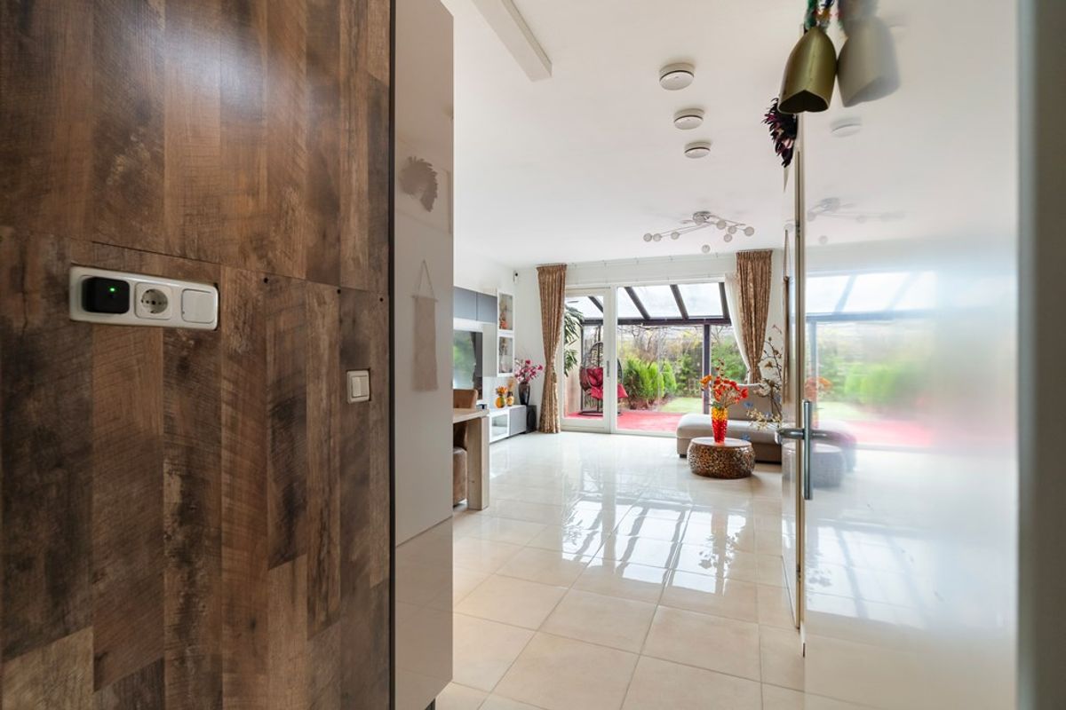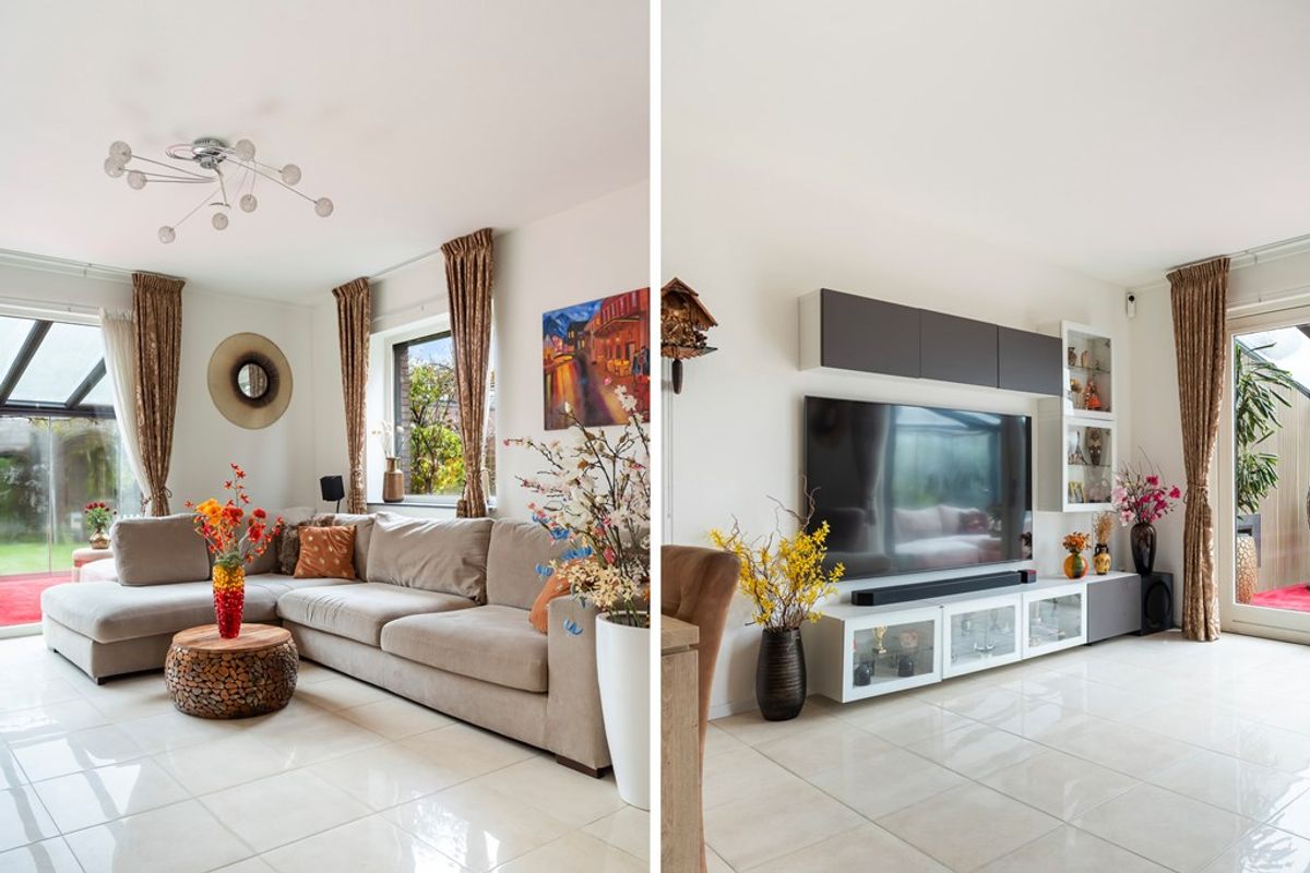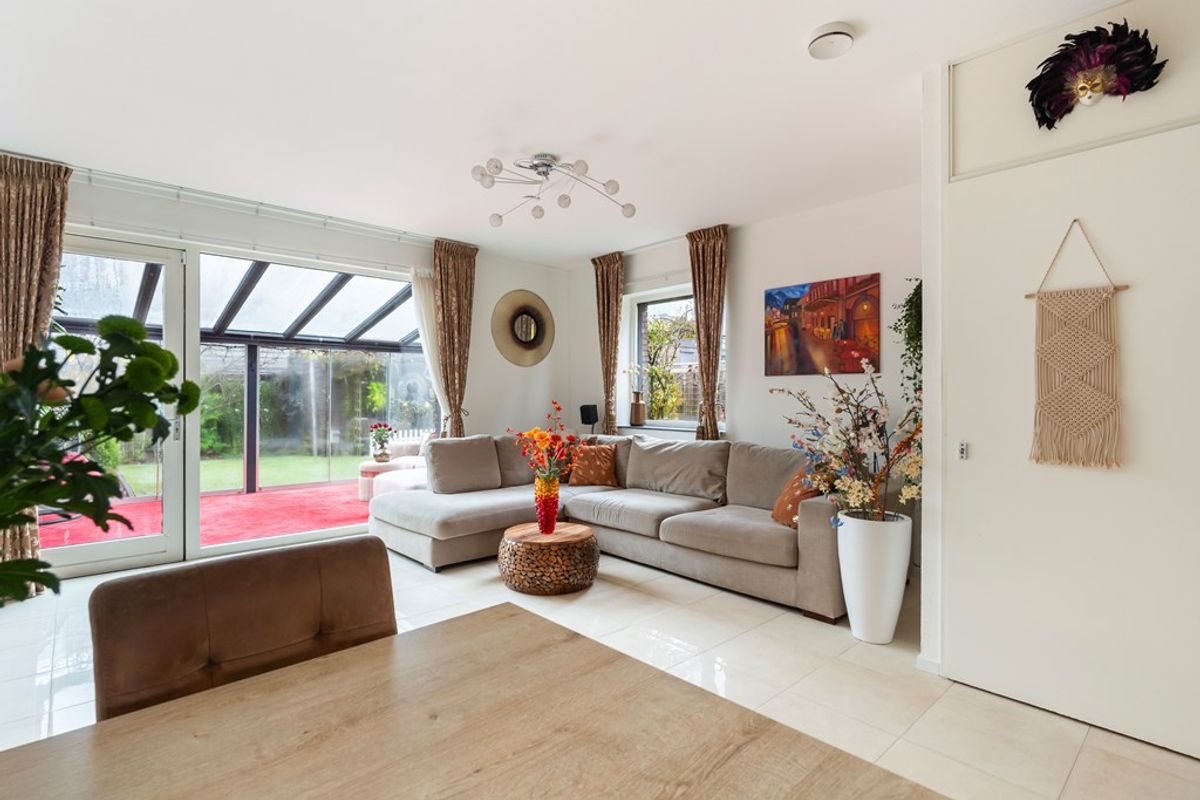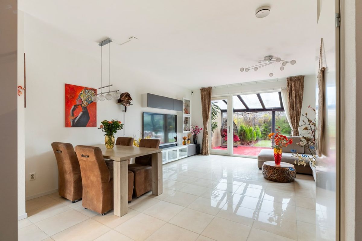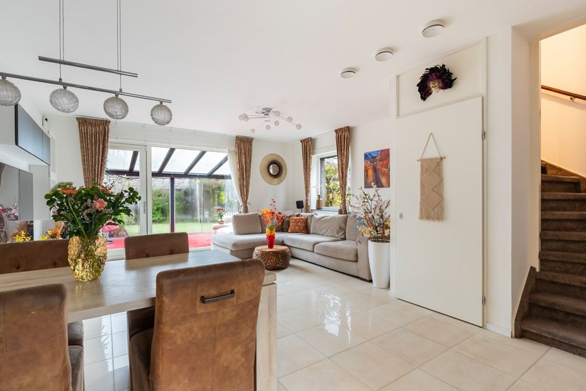 De woonkamer is tuingericht en extra licht door het zijraam, met een prachtige tegelvloer, vloerverwarming en openslaande deuren naar de ruime serre van maar liefst 19 m². In de serre kun je het hele jaar door genieten dankzij de schuifdeuren, een bio-ethanol open haard, een infraroodpaneel en een zonnescherm – ideaal voor alle seizoenen.