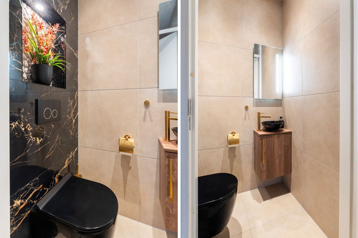 Bij binnenkomst valt meteen de warme en verzorgde uitstraling op. De hal is licht en uitnodigend, met een modern toilet dat recent is vernieuwd en tot in de puntjes is afgewerkt met messing accenten.