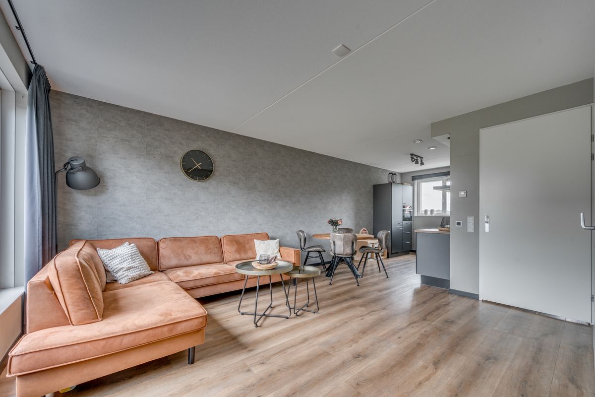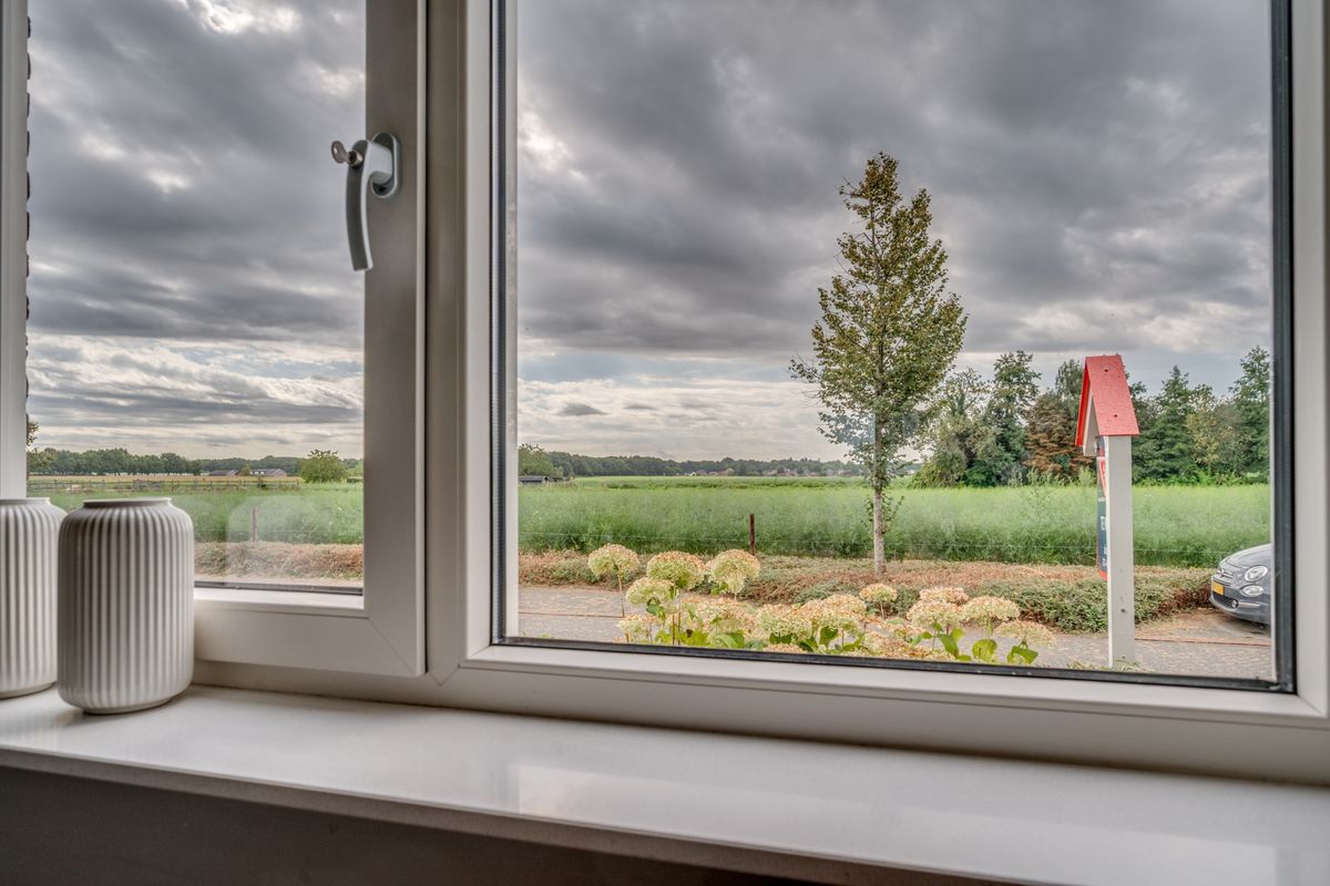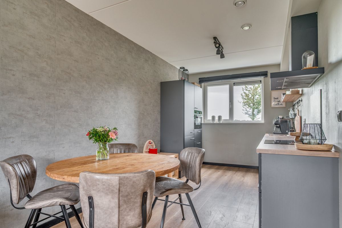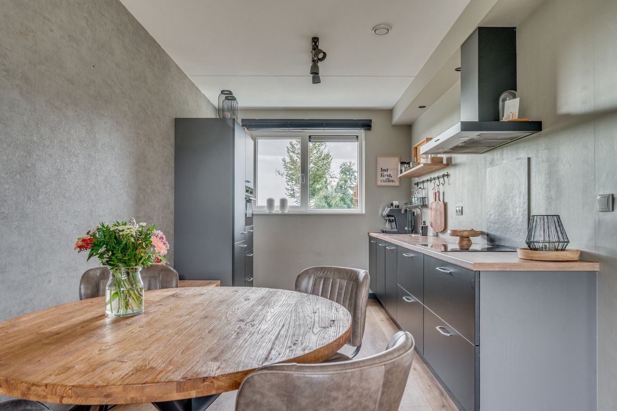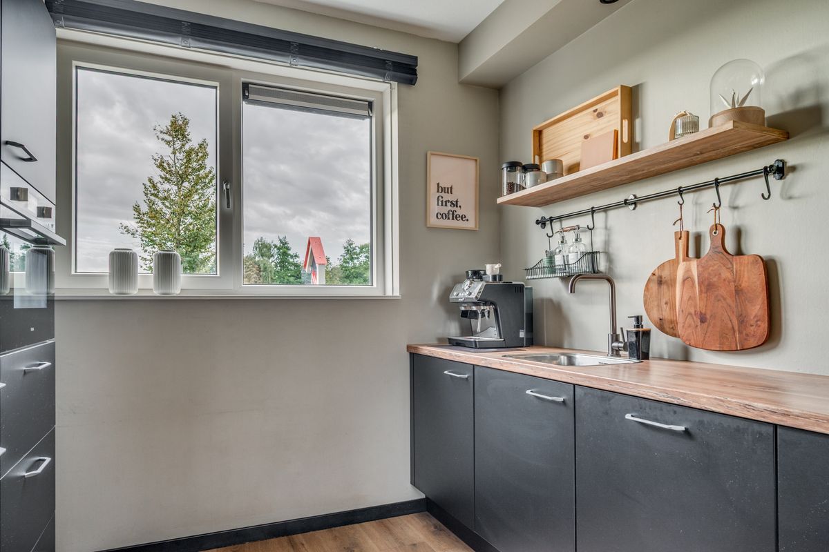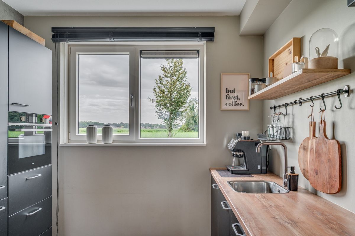 Achter de voordeur wacht een lichte en verzorgde hal, waar je toegang hebt tot de moderne meterkast, een nette toiletruimte met zwevend closet en fonteintje, de trapopgang naar boven en de woonkamer. De woonkamer is heerlijk licht en open, gelegen aan de achterzijde van de woning en biedt prettig zicht op de achtertuin. Ook is er een handige trapkast aanwezig. De open keuken aan de voorzijde is ingericht in twee opstellingen: een lange wandopstelling met spoelbak, inductiekookplaat, afzuigkap en vaatwasser, alsmede een tweede wand met een combi-oven en extra kastruimte. Vanuit het keukenraam geniet je van een vrij uitzicht over de omliggende weilanden, een plek waar koken echt ontspannen wordt. De hele begane grond heeft een nette, moderne PVC-vloer en is voorzien van comfortabele onderliggende vloerverwarming.