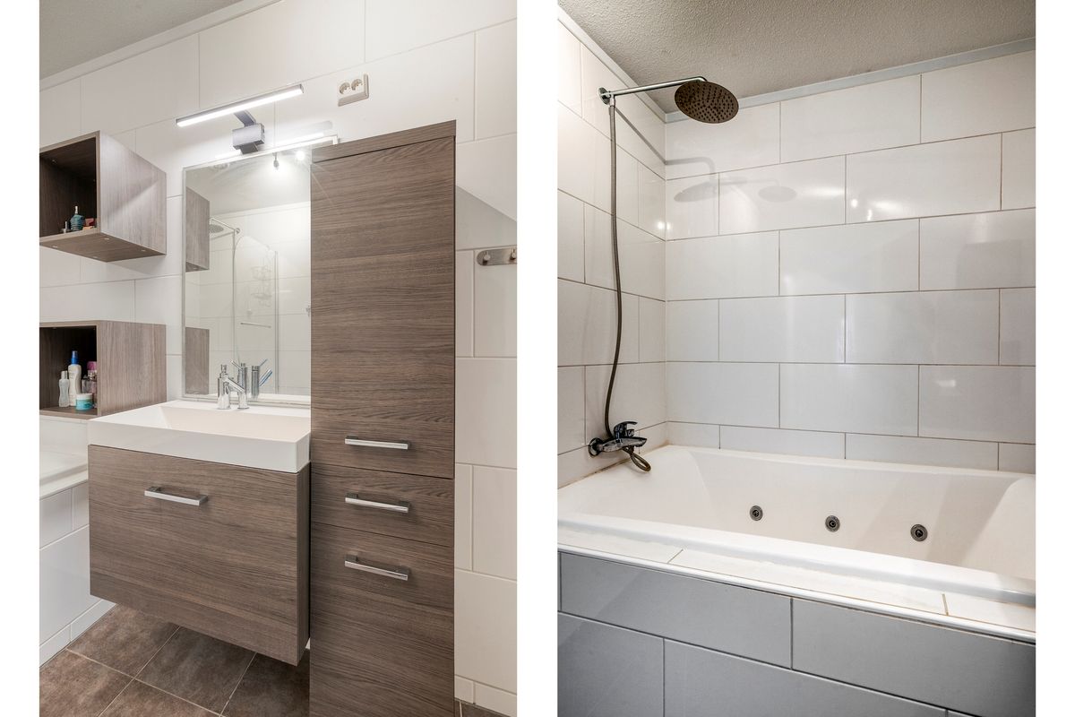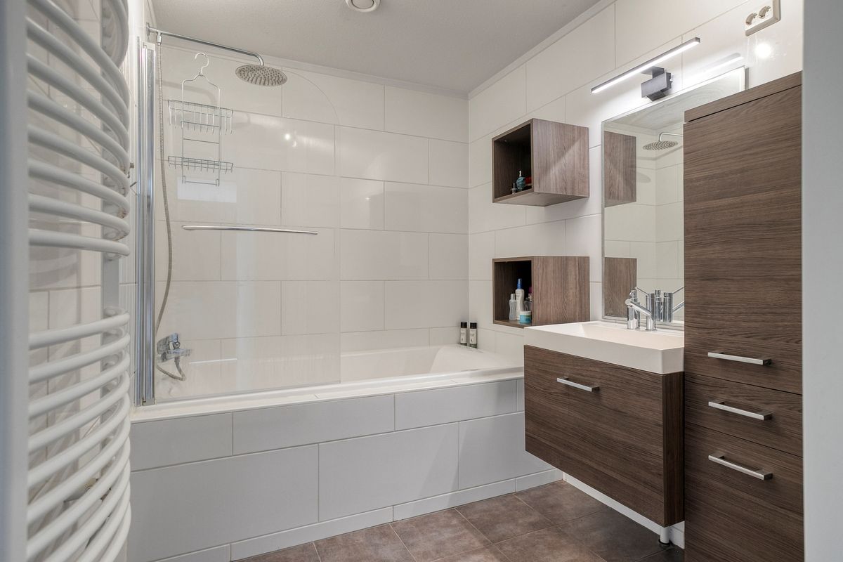 De moderne badkamer is uitgerust met een ligbad, een wastafelmeubel met bijpassende kast en een toilet.