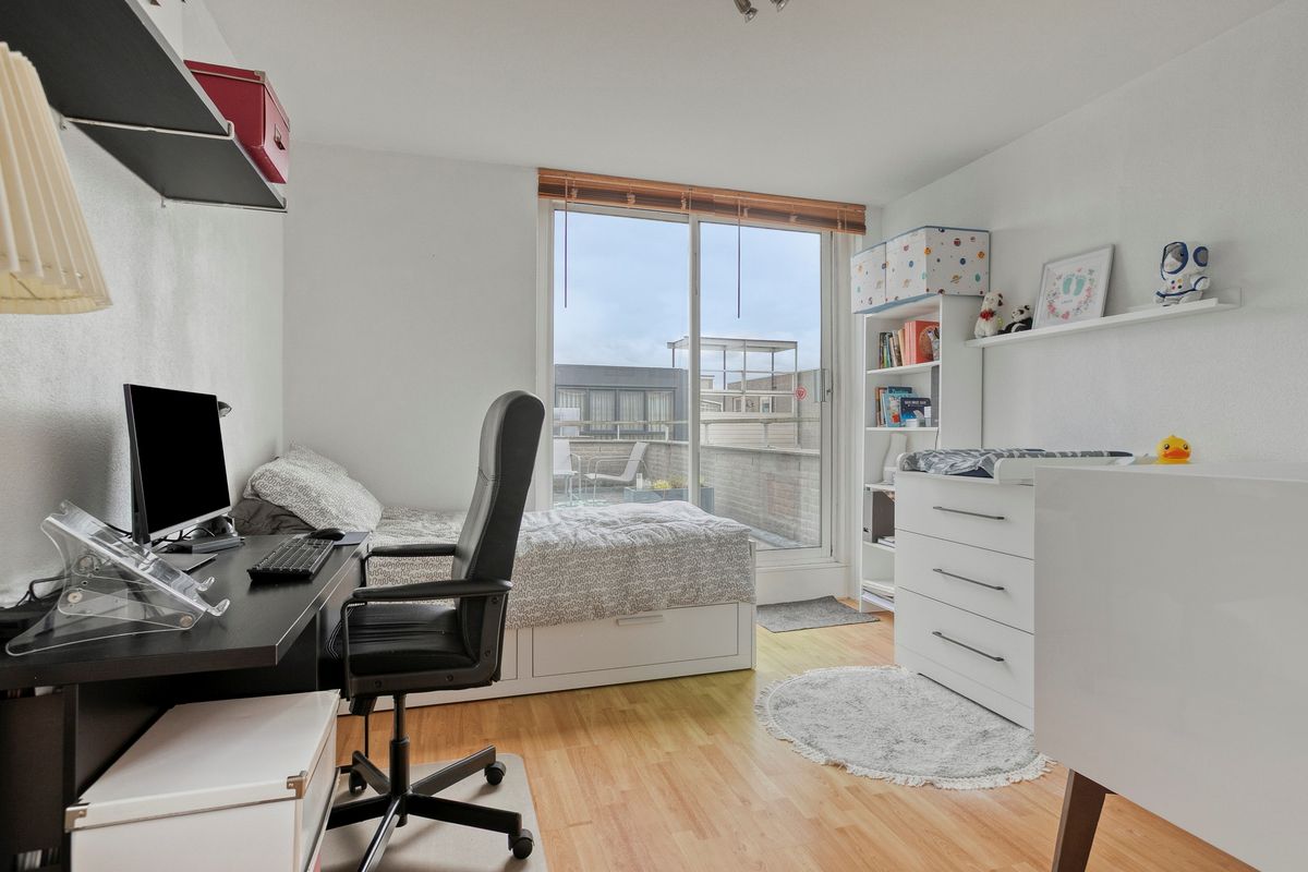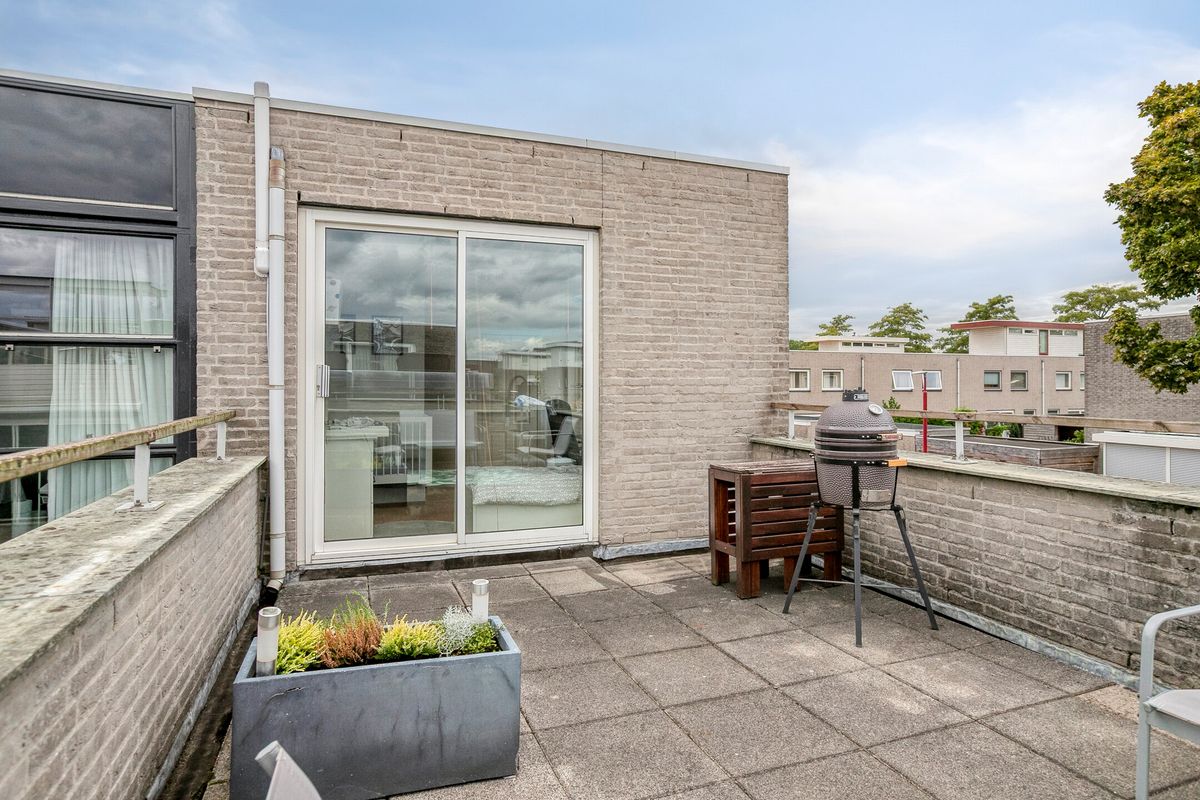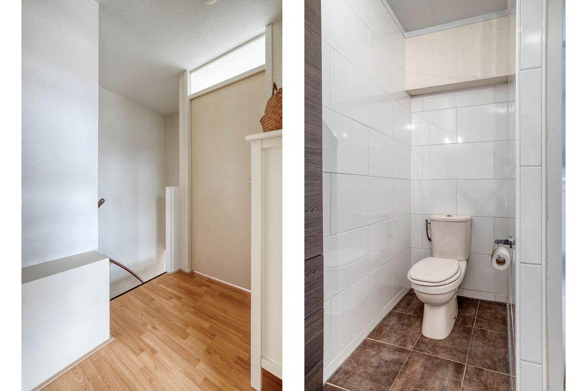 Via de trapopgang in de hal bereik je de eerste verdieping. De overloop geeft toegang tot twee royale slaapkamers en de badkamer. Eén van de slaapkamers biedt toegang tot het zonnige dakterras en beschikt over een vaste kast. Vanaf het dakterras heb je een mooi vrij uitzicht.