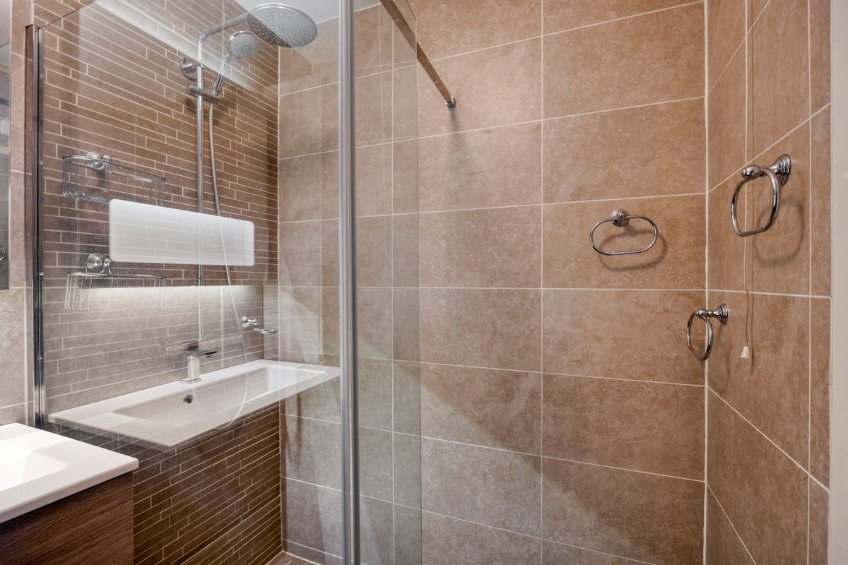 Tussenhal met toegang tot de moderne, geheel betegelde, badkamer welke is voorzien van een inloopdouche en wastafelmeubel, twee slaapkamers aan de rustige achterzijde en een praktische berging met wasmachineaansluiting, CV ketel en mechanische ventilatie.