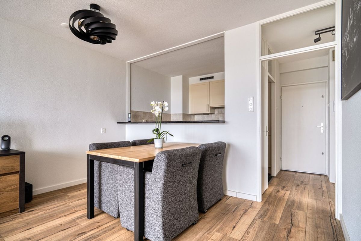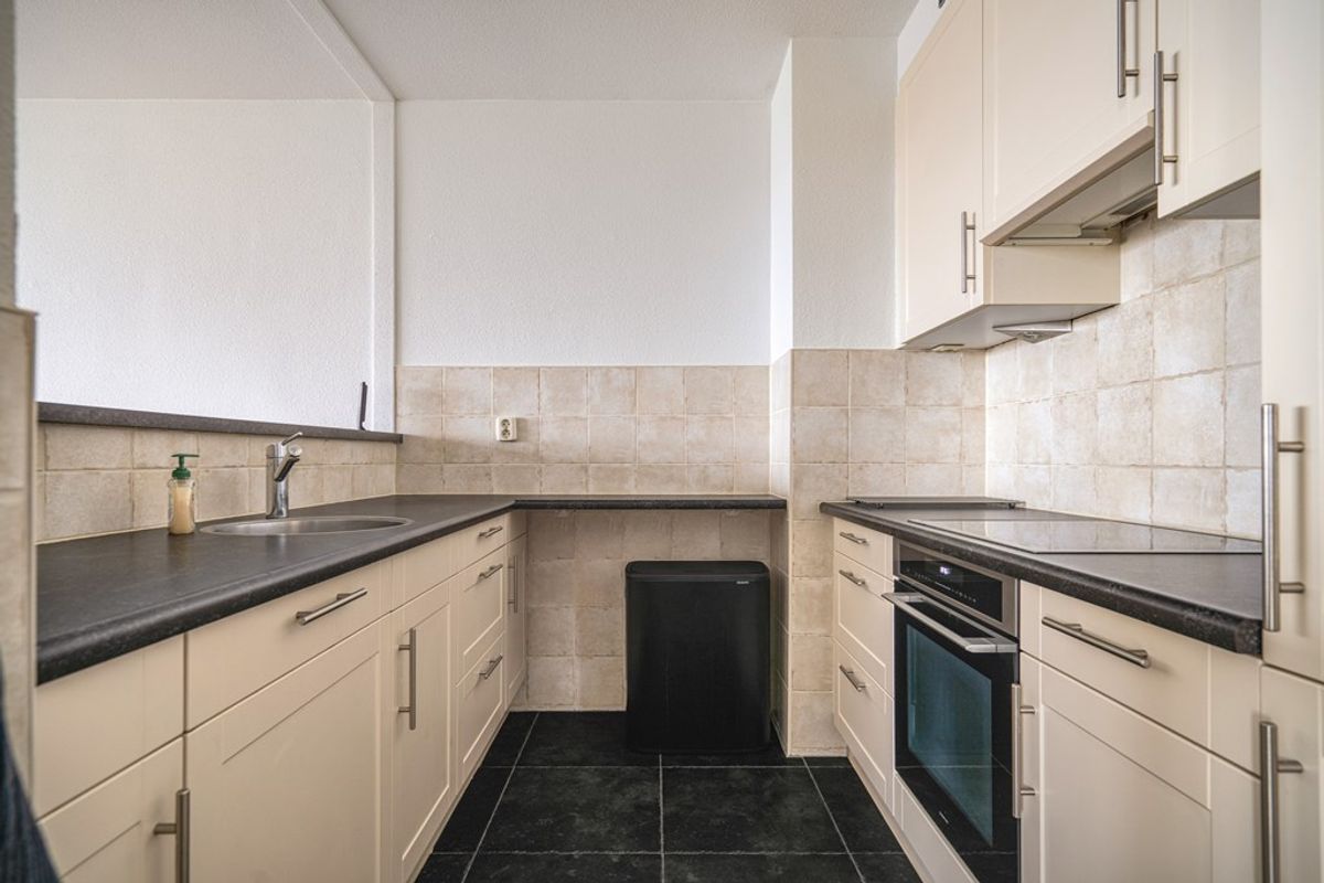 Entreehal met bergkast, meterkast en intercom. De royale woonkamer biedt, net als het balkon, vrij uitzicht op het Oude Dorp. De semi-open keuken heeft een parallelopstelling en is uitgerust met een vaatwasser (2024) ,combimagnetron, koel-/vriescombinatie, elektrische kookplaat en afzuigkap.