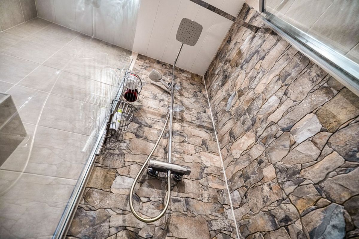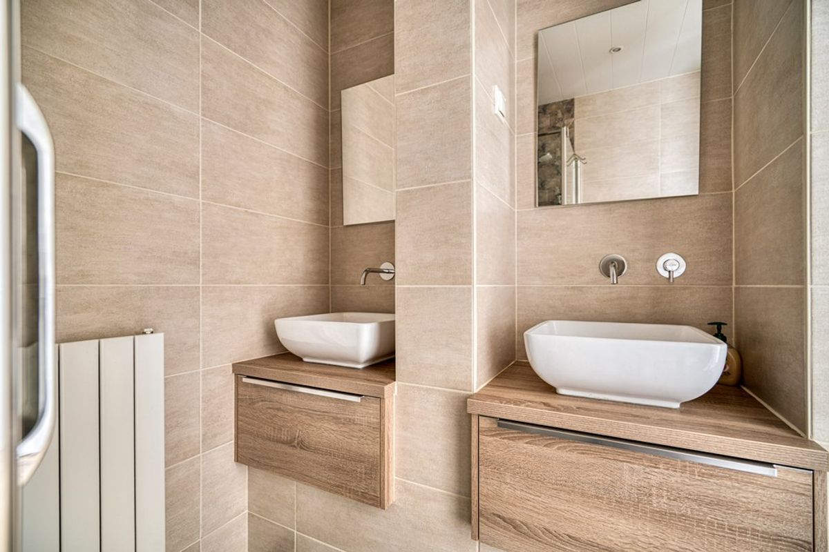 De luxe badkamer welke volledig is betegeld is voorzien van een dubbele wastafel, inloopdouche met drain, radiator, hangend toilet en heeft een verlaagd plafond met inbouwspots.
