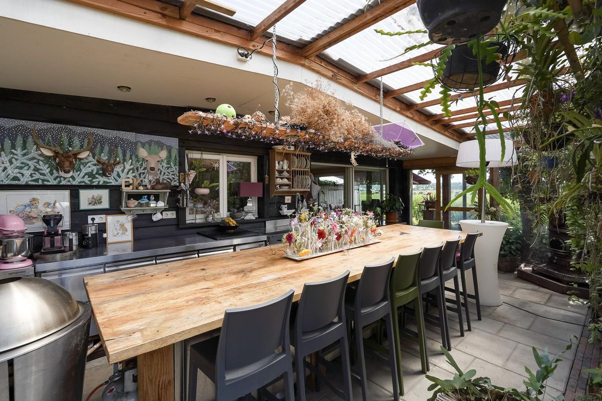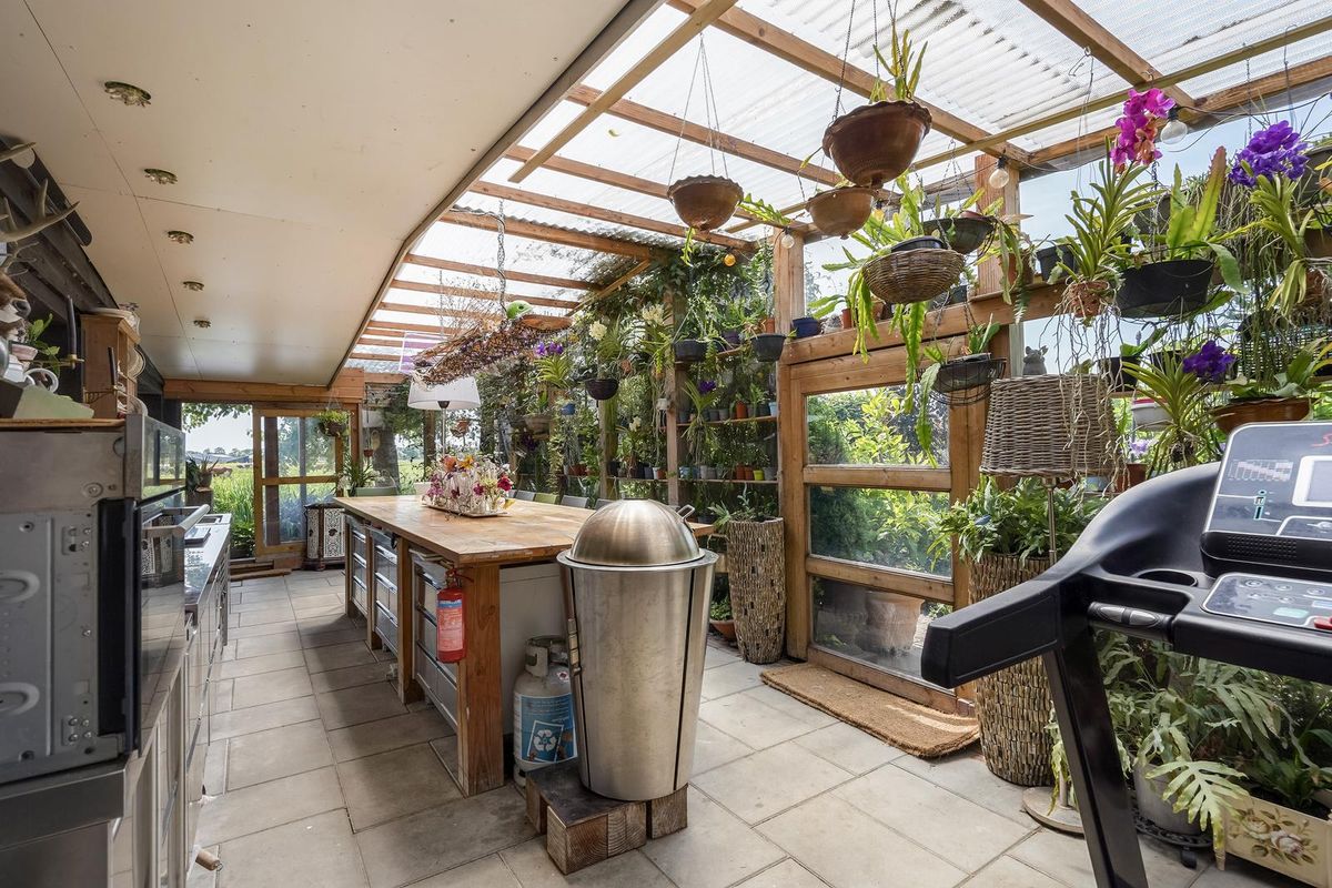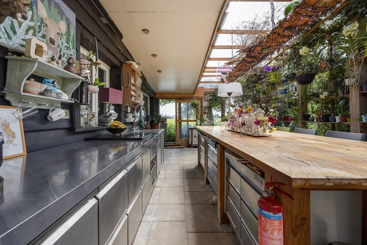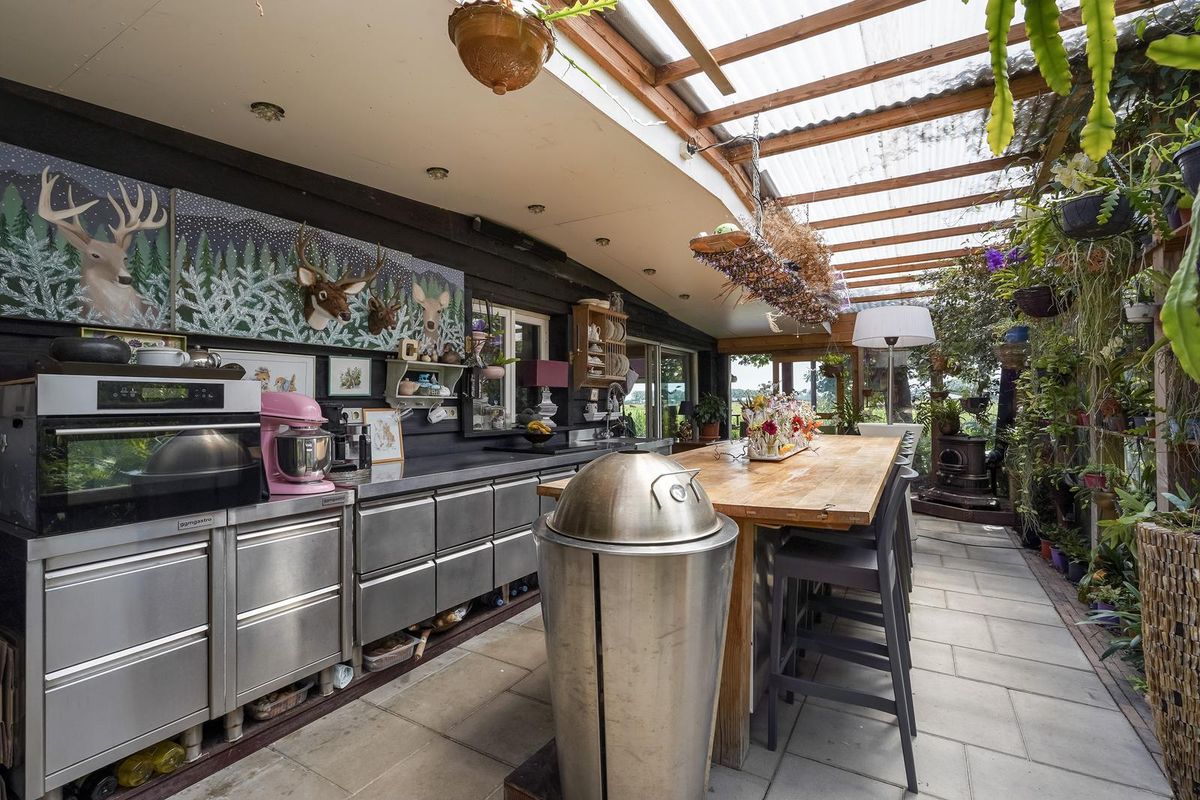 De ruime serre vormt het hart van het huis: hier is een tweede keuken geplaatst met spoelbak, koeling, vaatwasser en volop werk- en bergruimte. Aan de robuuste houten eettafel kun je uitgebreid dineren met vrienden en familie. Dankzij de houtkachel is dit een heerlijke plek om ook in de winter te verblijven.