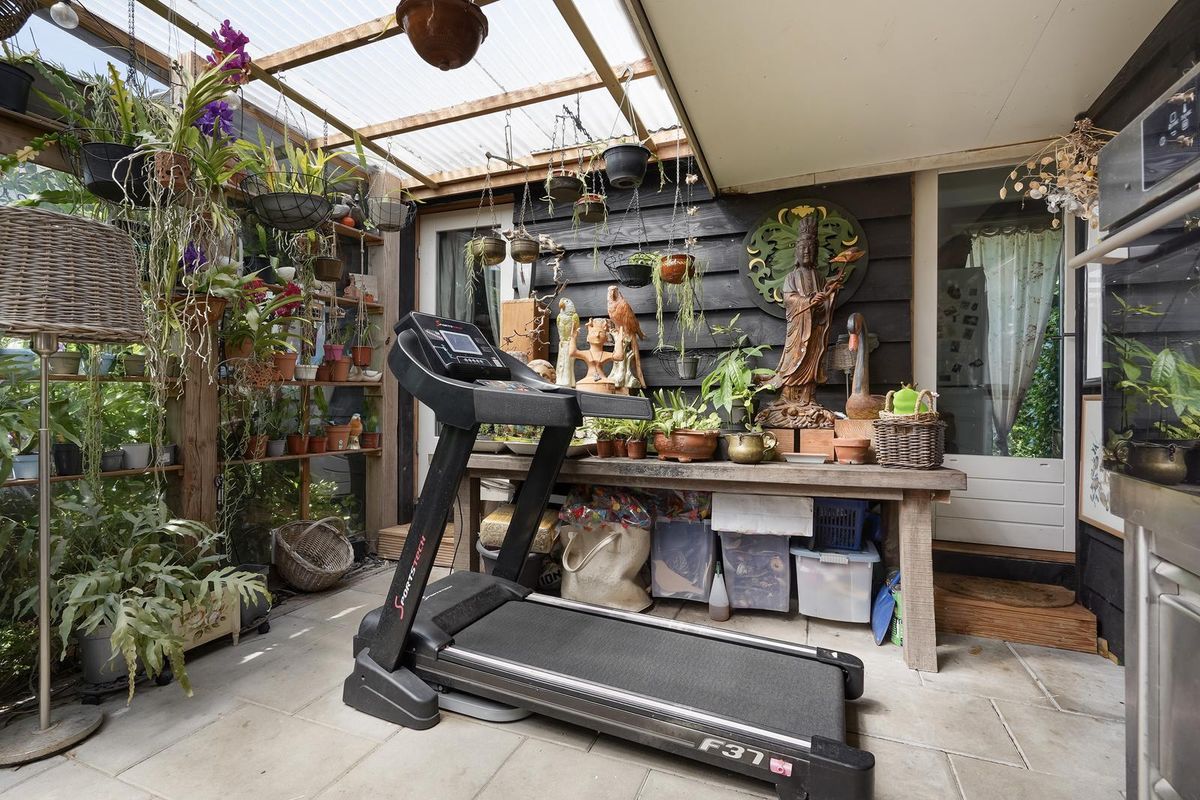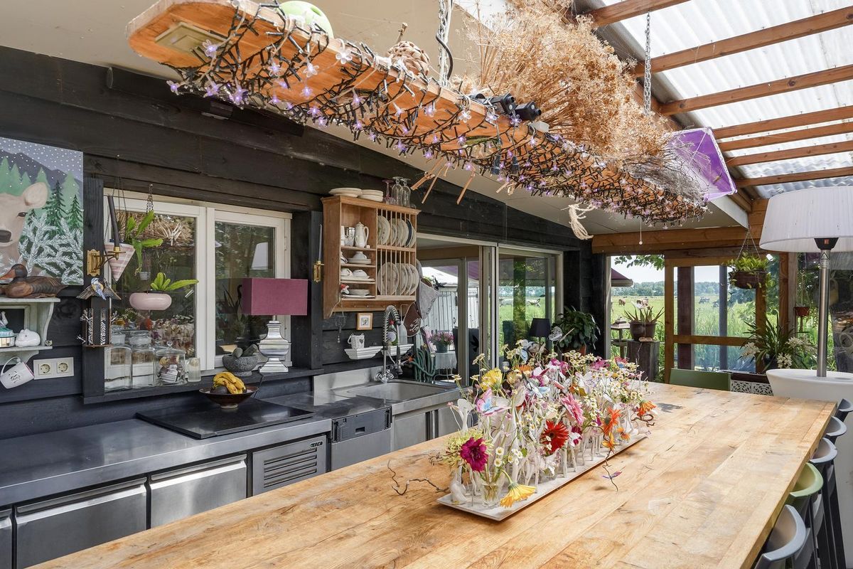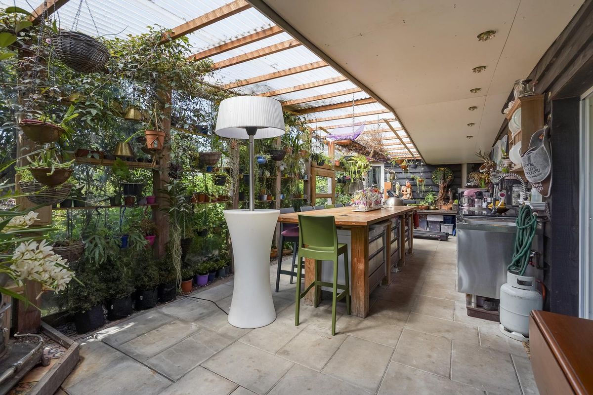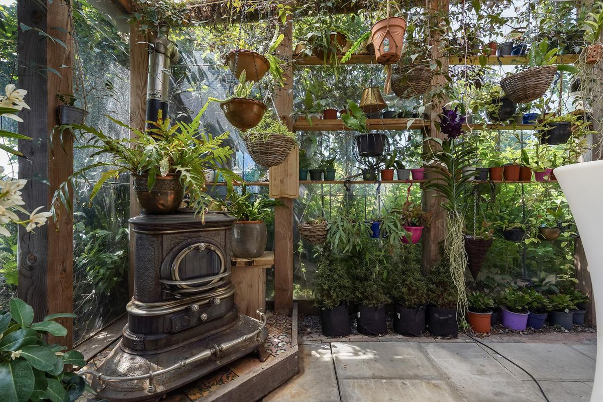 De ruime serre vormt het hart van het huis: hier is een tweede keuken geplaatst met spoelbak, koeling, vaatwasser en volop werk- en bergruimte. Aan de robuuste houten eettafel kun je uitgebreid dineren met vrienden en familie. Dankzij de houtkachel is dit een heerlijke plek om ook in de winter te verblijven.