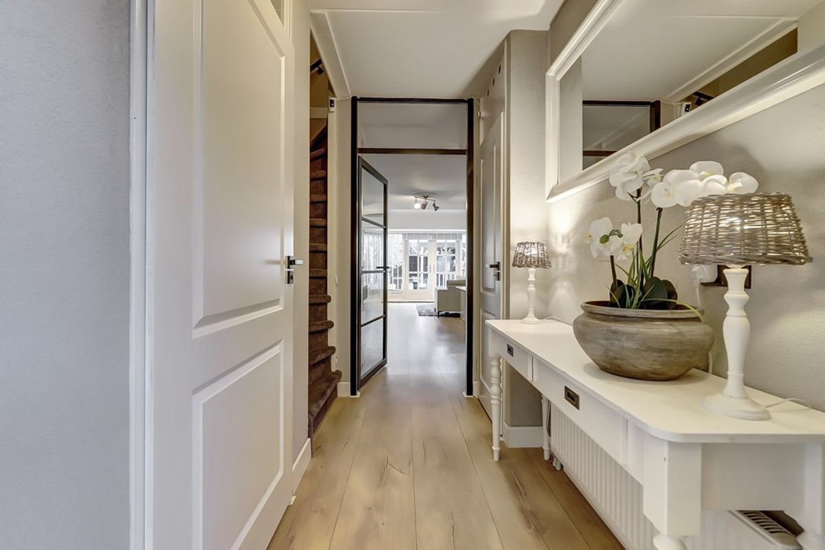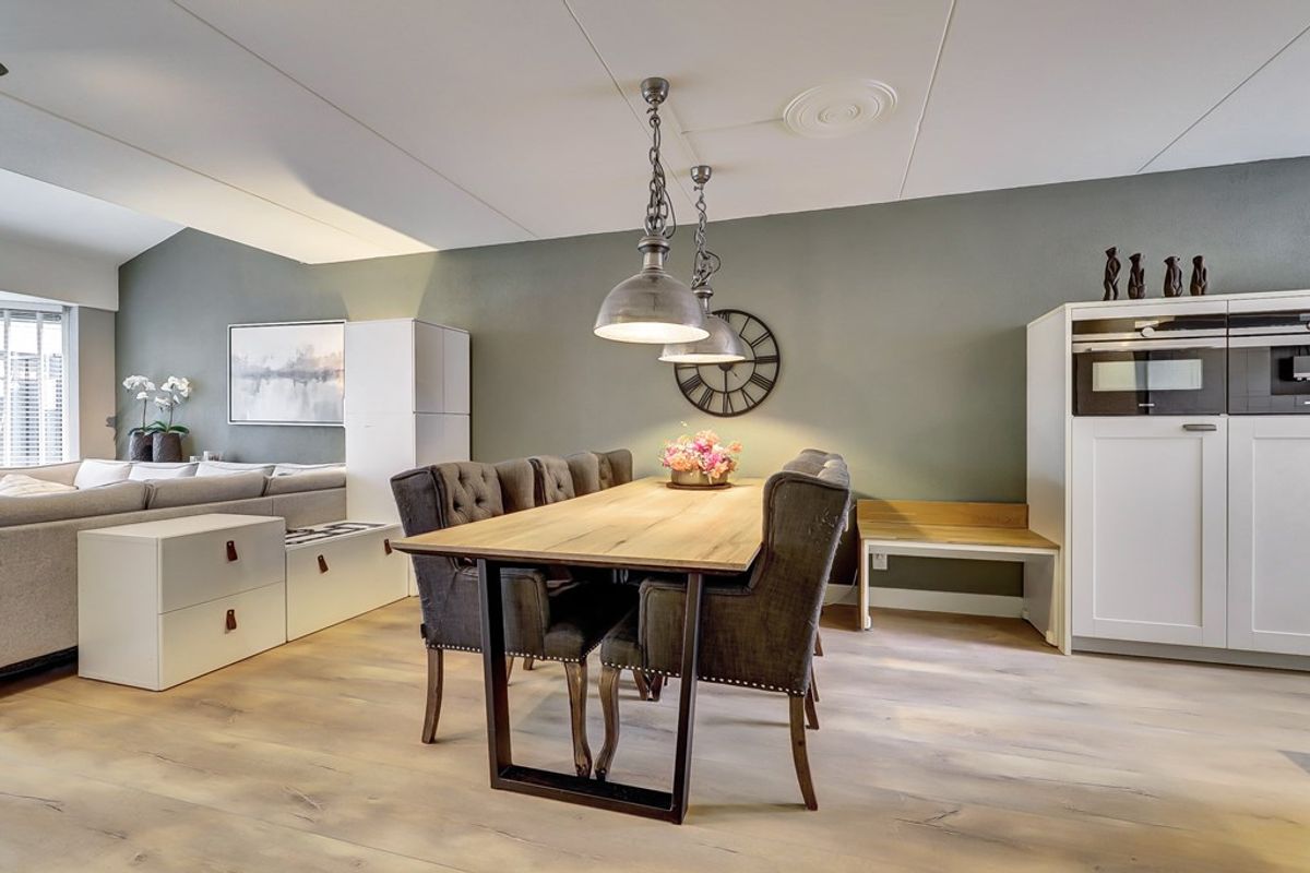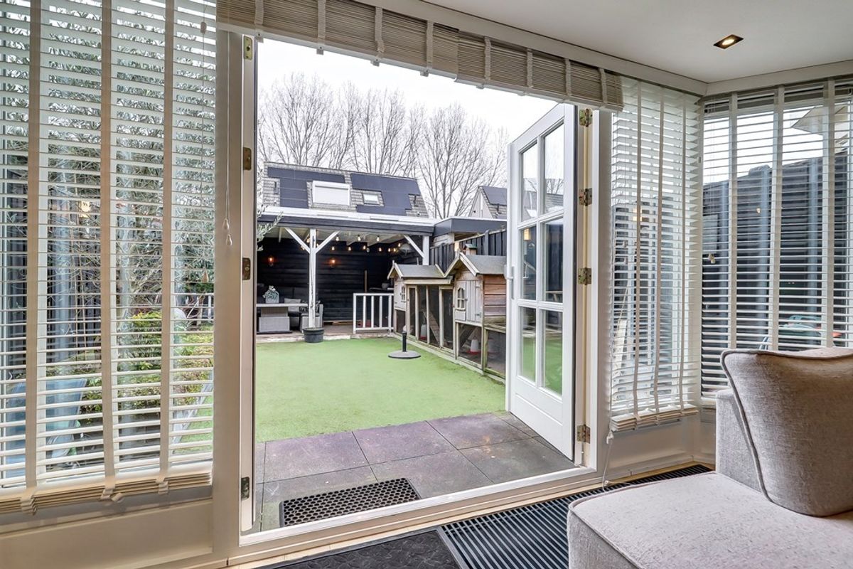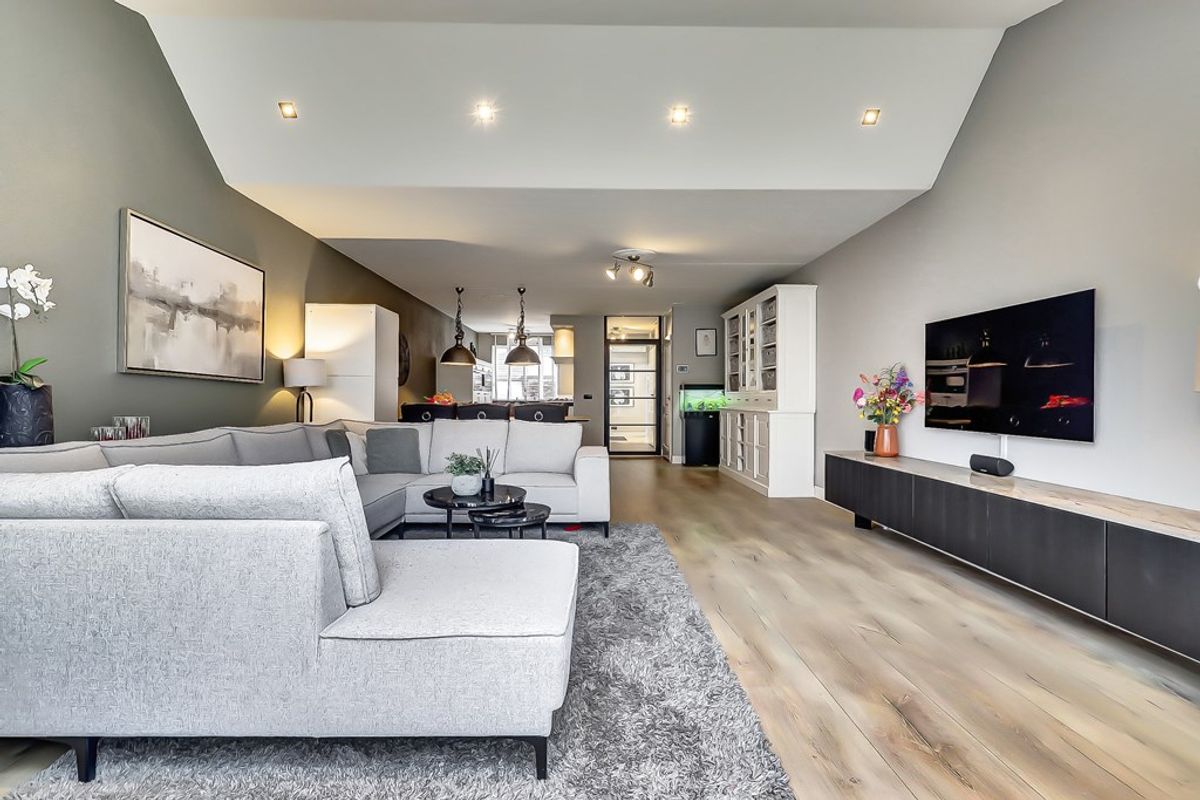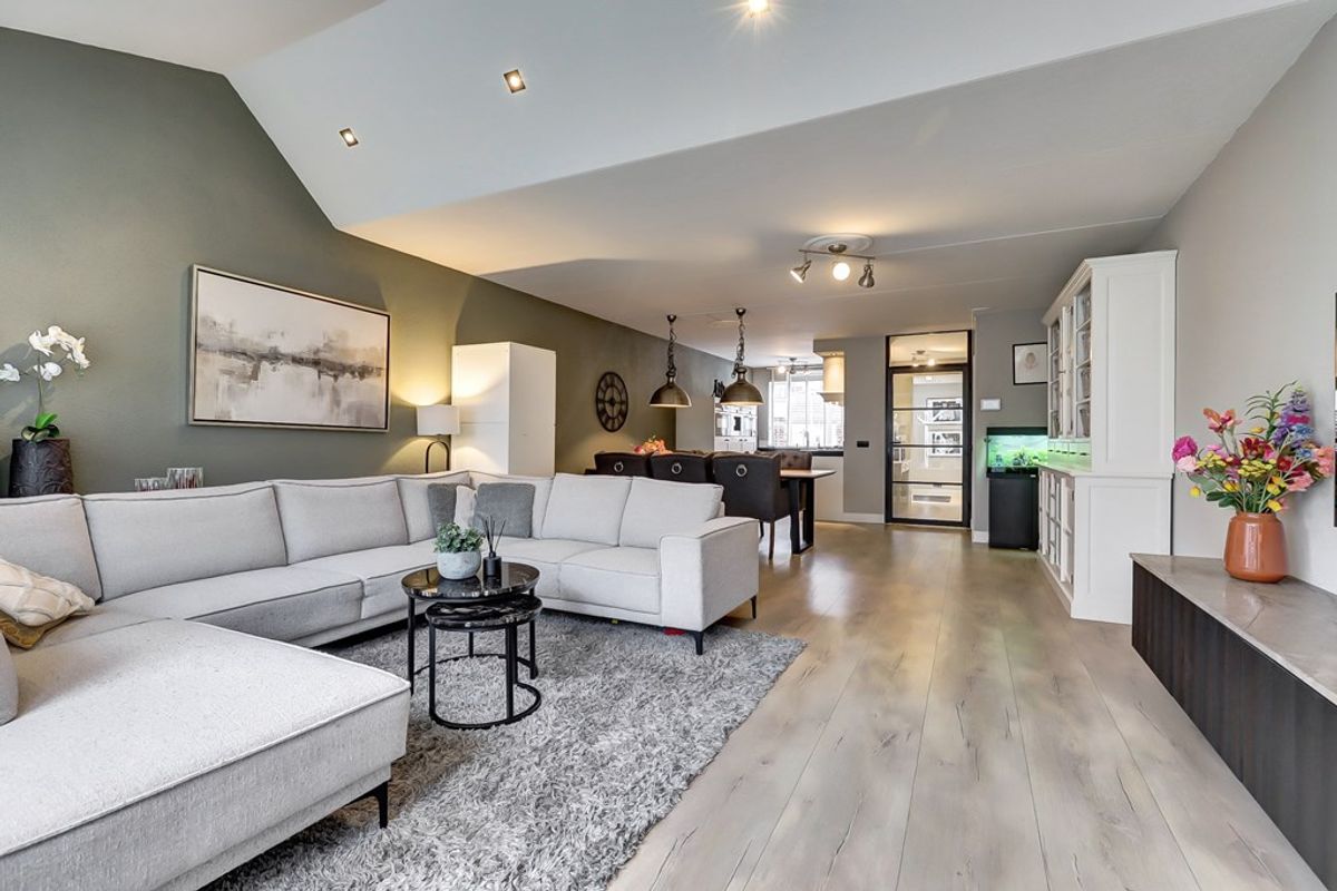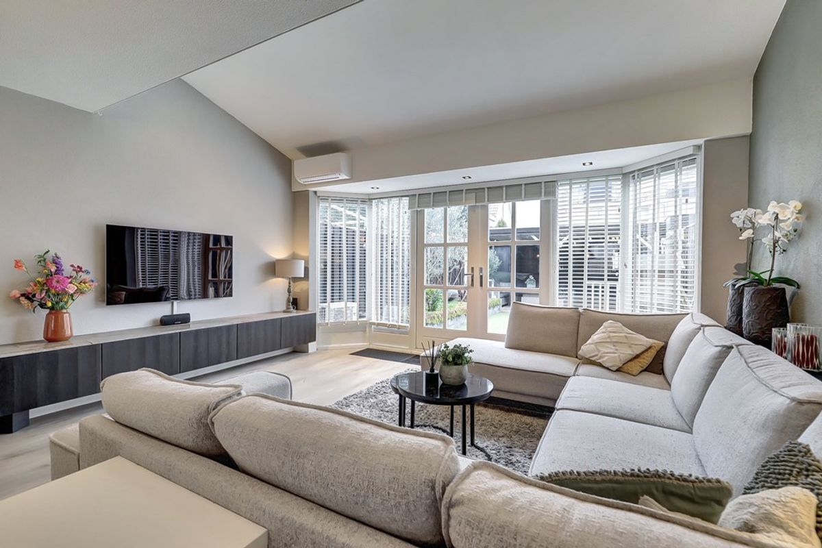 De royale woonkamer is aan de achterzijde uitgebouwd met maar liefst 15 m² en voelt heerlijk licht en ruim aan. De woonkamer is voorzien van een keurige laminaatvloer, praktische trapkast, een airco-unit en dubbele openslaande deuren naar de tuin.