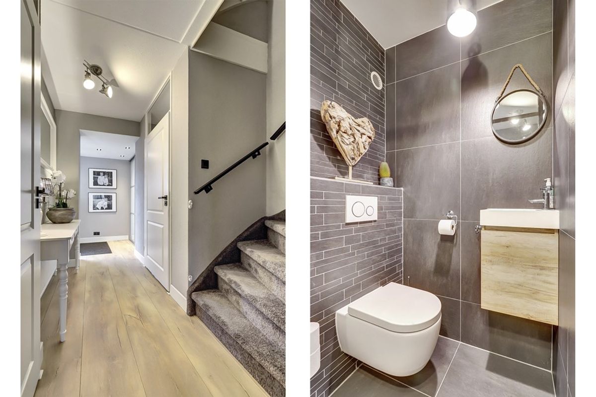 Entree, uitgebouwde hal met vaste garderobekast, toilet met fonteintje, meterkast en trapopgang.