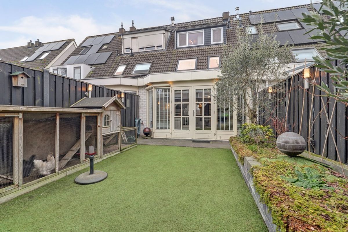 De keurig aangelegde achtertuin ligt op het oosten, is circa 5 meter breed en 9,5 meter diep en onderhoudsvriendelijk ingericht met kunstgras. Achterin bevindt zich een fraaie en gezellige veranda van ca. 15 m² (3 x 5 m), een heerlijke plek om in de zomer te genieten.