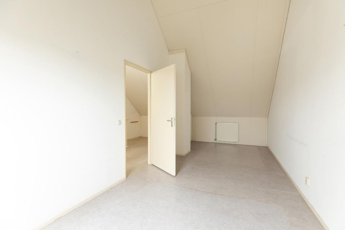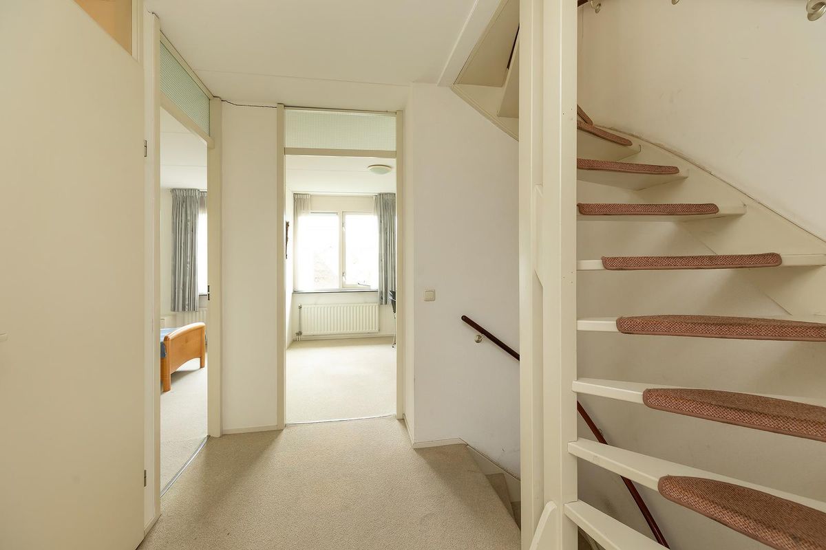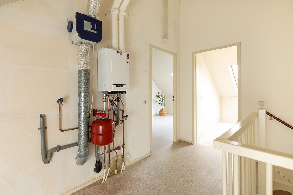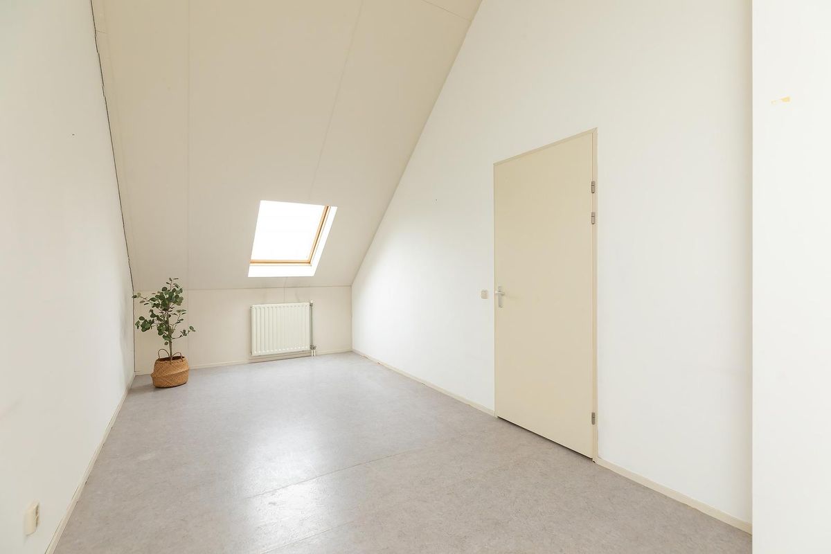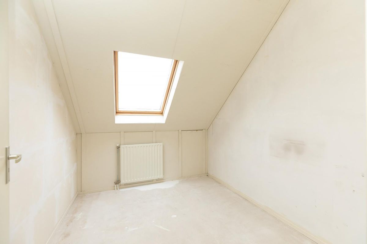Vaste trap naar tweede verdieping. Ruime voorzolder met aansluitingen voor wasmachine en droger en de CV-ketel (2017). Daarnaast twee slaapkamers waarvan één van circa 18 m² en één slaapkamer van 8 m², beiden met Velux-dakraam. Extra bergruimte is aanwezig achter de knieschotten.