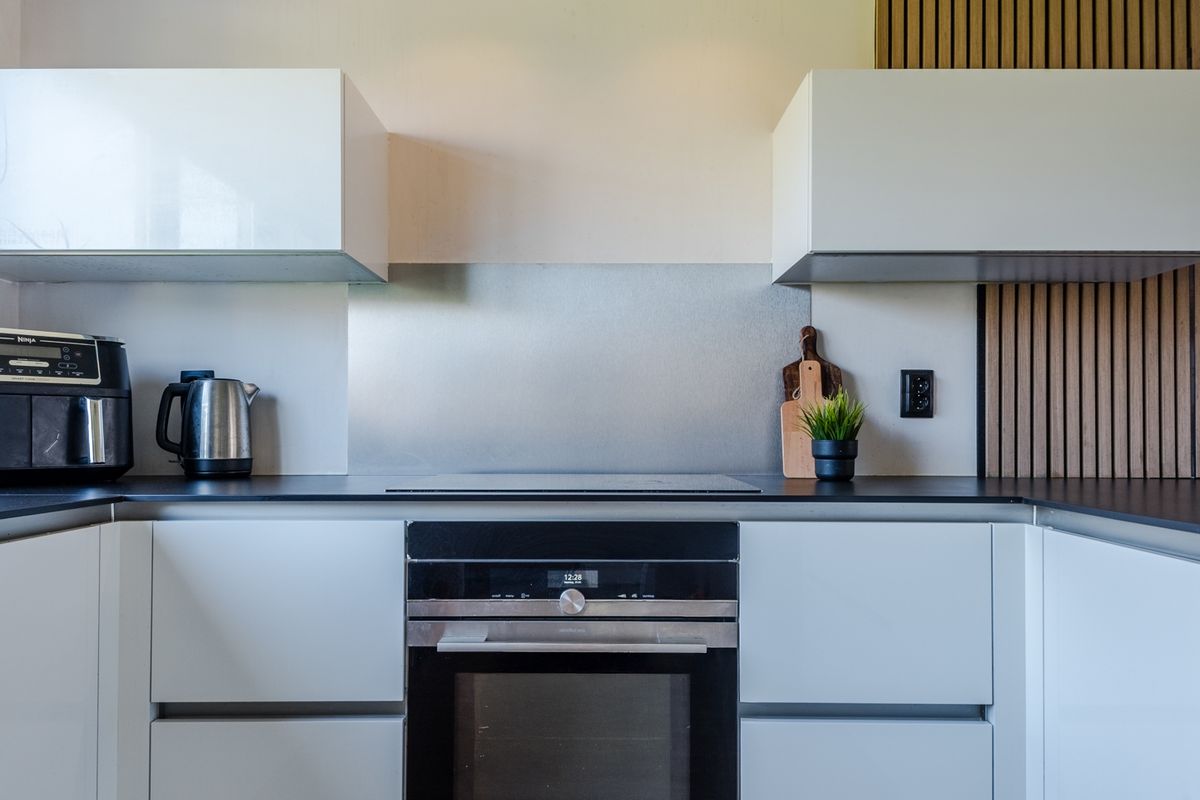 The living room has a bright, modern look and provides access to the sunny backyard through large sliding doors. At the front of the house is the stylish kitchen, complete with a breakfast bar with four stools and among others high-quality Siemens built-in appliances (hob, combi-oven, dishwasher, fridge/freezer, and extractor hood). Clever corner carousel cabinets offer extra storage space.