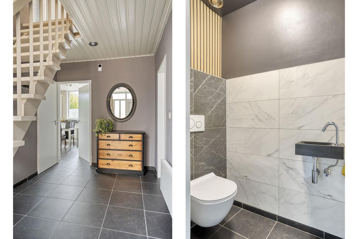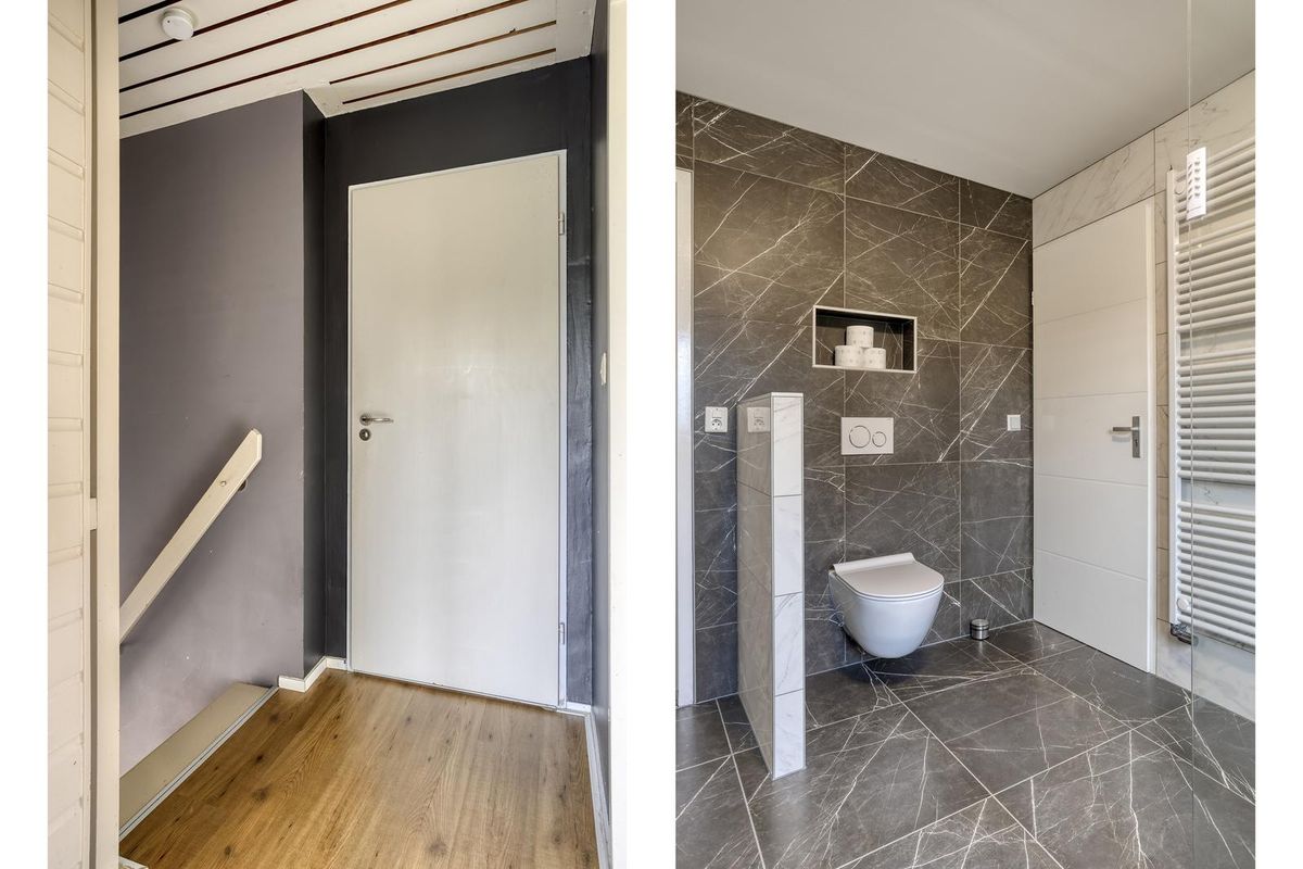 De moderne badkamer is een echte blikvanger: smaakvol afgewerkt met een inloopdouche met rainshower, toilet en een dubbel wastafelmeubel. Achter een kast vindt u de cv-installatie (Remeha HR combiketel, bouwjaar 2021).