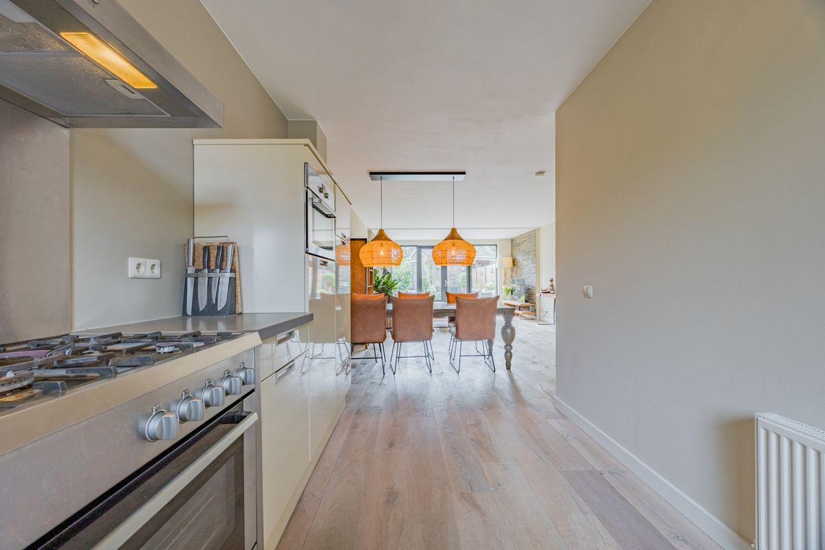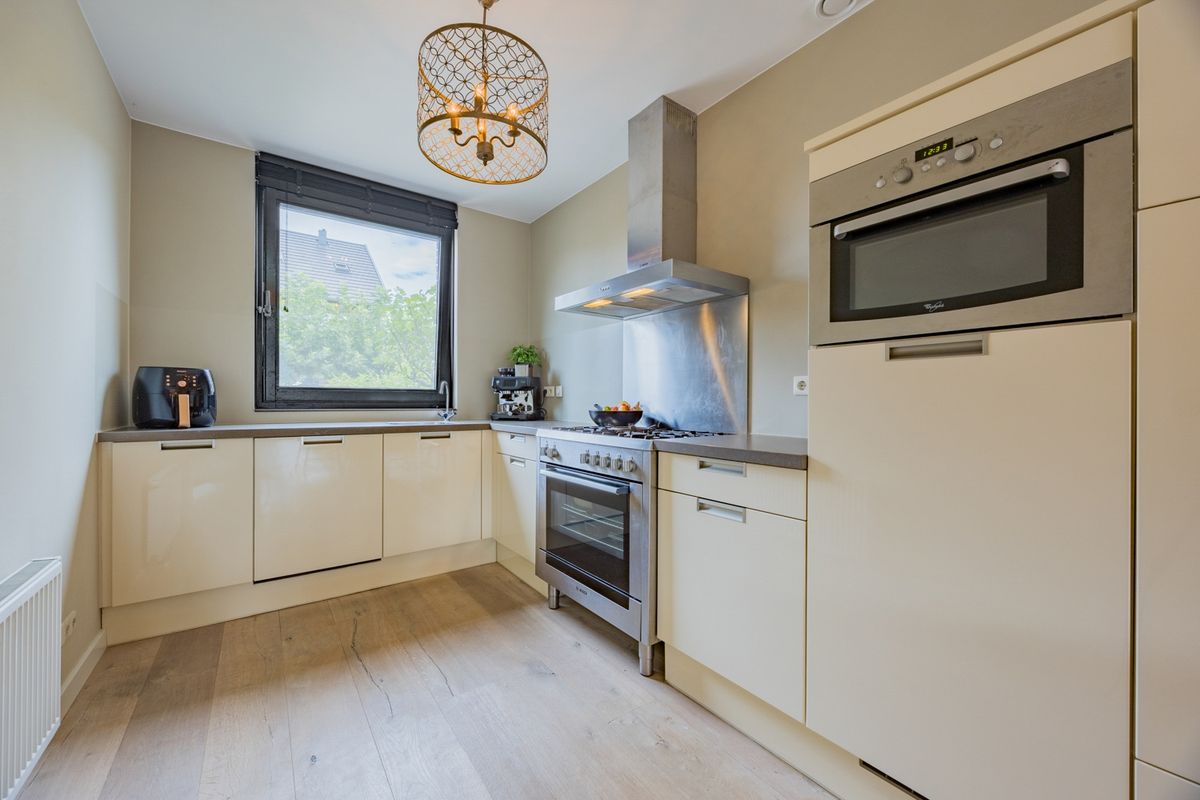 Begane grond: Hal, meterkast, trapopgang, toilet met fonteintje, tuingerichte uitgebouwde woonkamer met grote glazen pui met openslaande deuren naar de tuin, provisiekast, open keuken is voorzien van een moderne inrichting voorzien van alle inbouw apparatuur waaronder een vaatwasser, combioven/magnetron, 5-pits gasfornuis met oven, afzuigschouw, vriezer en koelkast. De gehele begane grond is voorzien van een fraaie eiken houtenvloer.