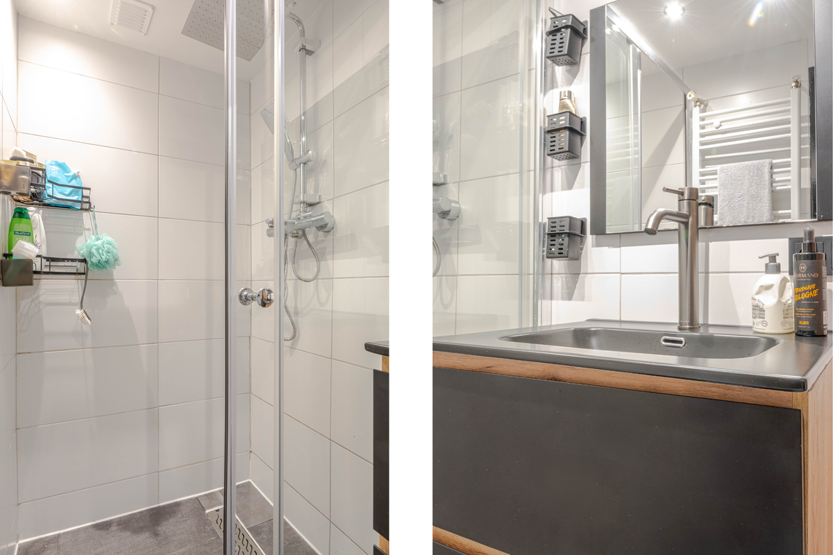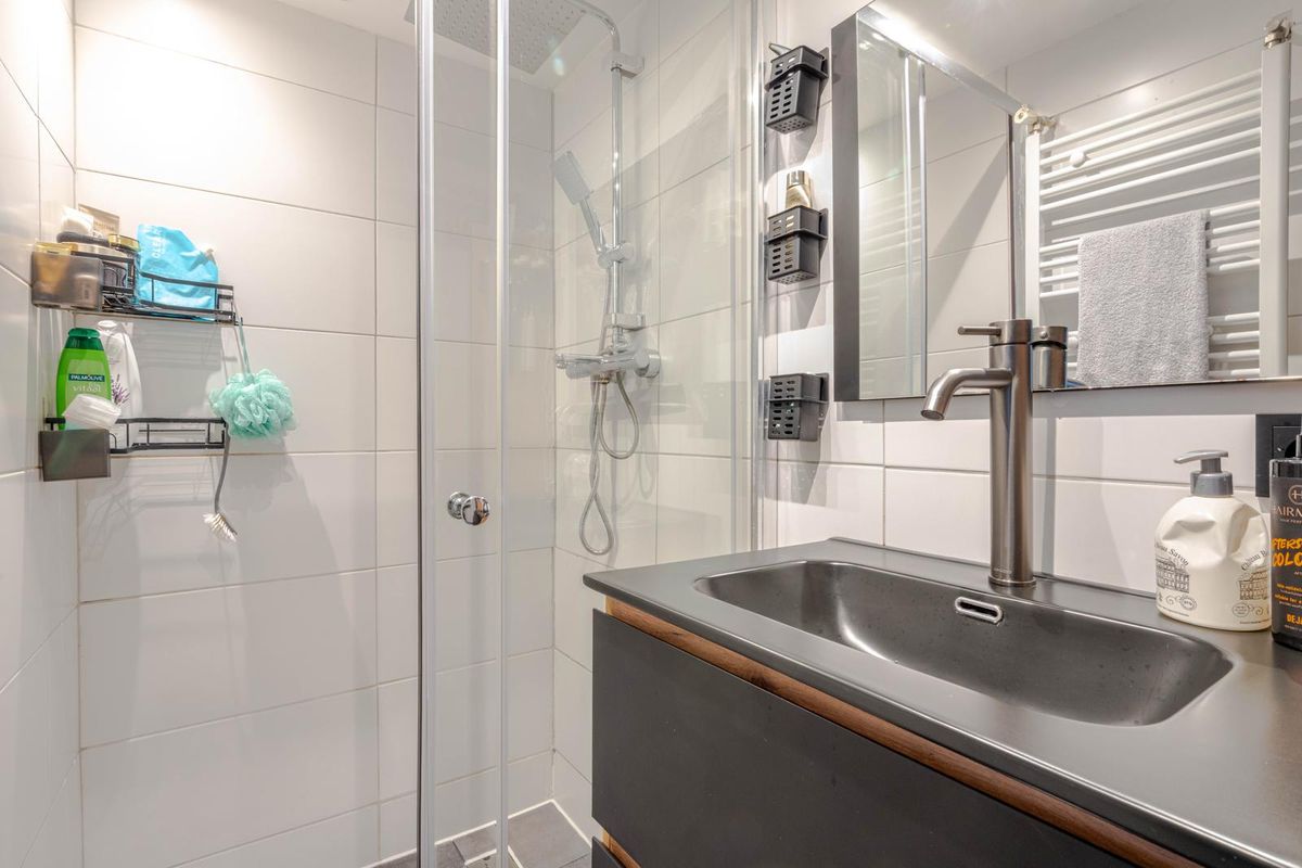 * Badkamer voorzien van betegeling, inloopdouche, wastafelmeubel en designradiator.