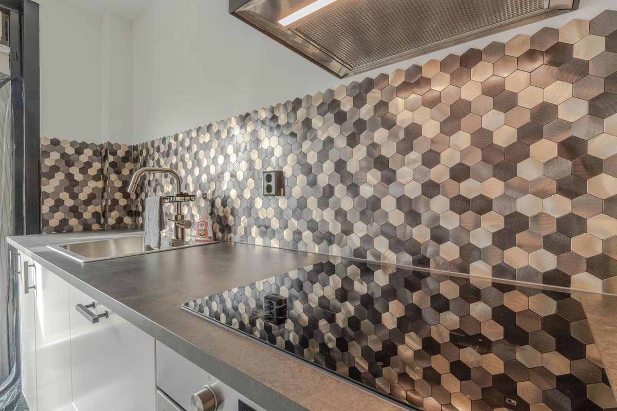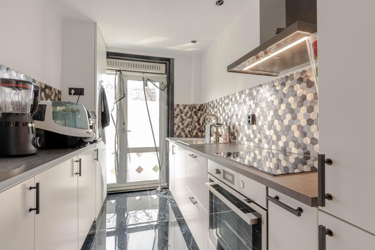* Keukenruimte voorzien van tegelvloer met vloerverwarming, inbouwkeuken voorzien van inductiekookplaat, oven, koel-vriescombinatie, afzuigkap. Verder is er een vaste kast met de opstelling van de C.V.-combiketel en een deur naar balkon I.