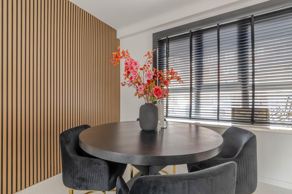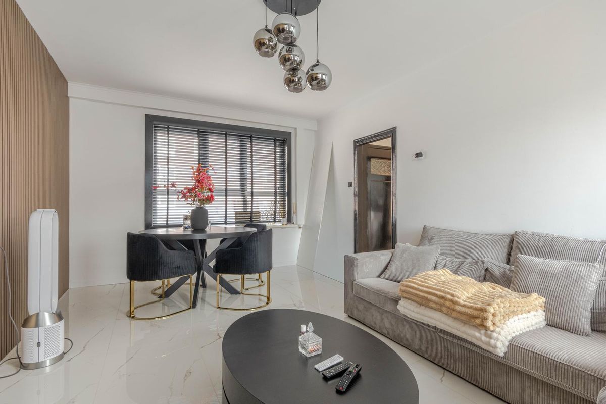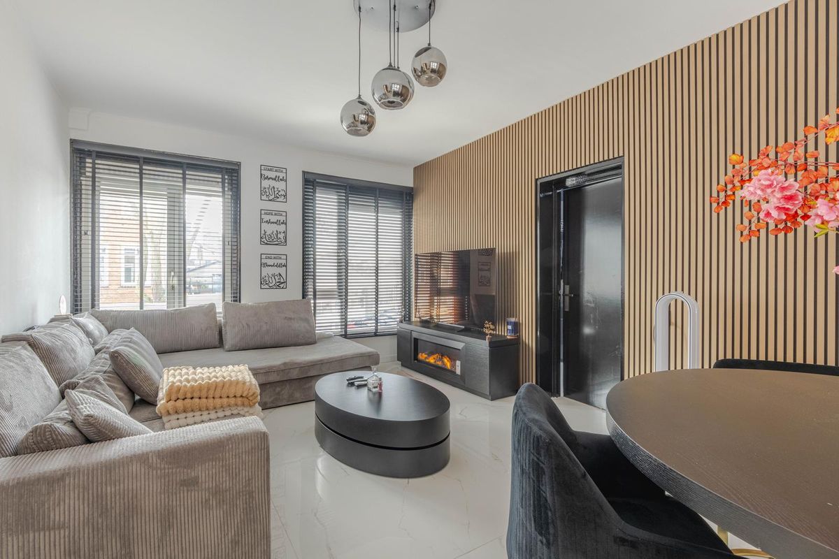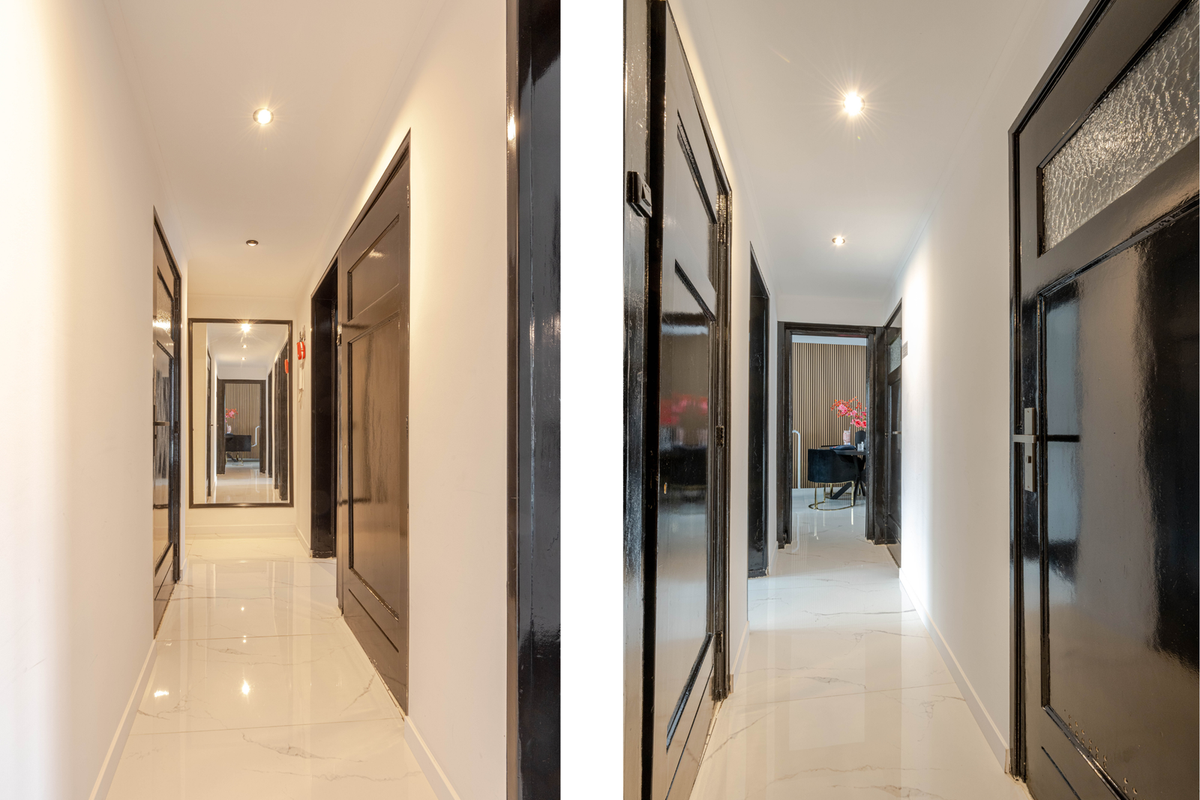 * Doorzon woonkamer voorzien van tegelvloer met vloerverwarming, gestucte wanden (gedeeltelijk wandpanelen) en plafond, toegang tot slaapkamer II en een deur naar balkon II.