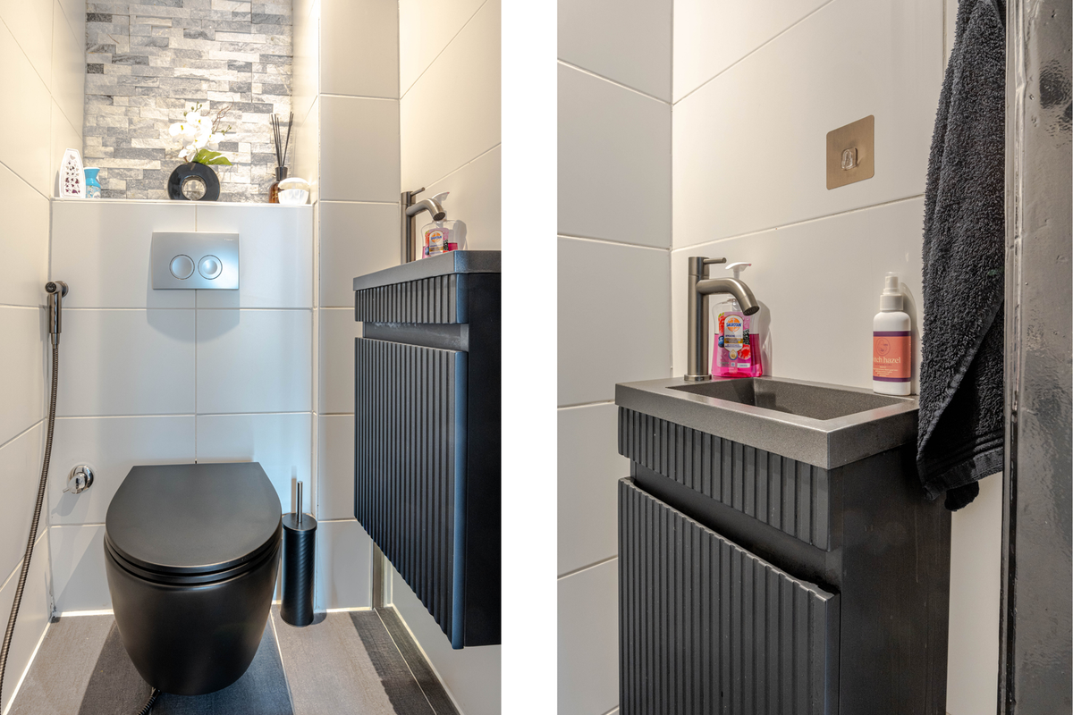* Toiletruimte voorzien van wandtoilet, bidetsproeier, fonteintje, en geheel keurig betegeld.