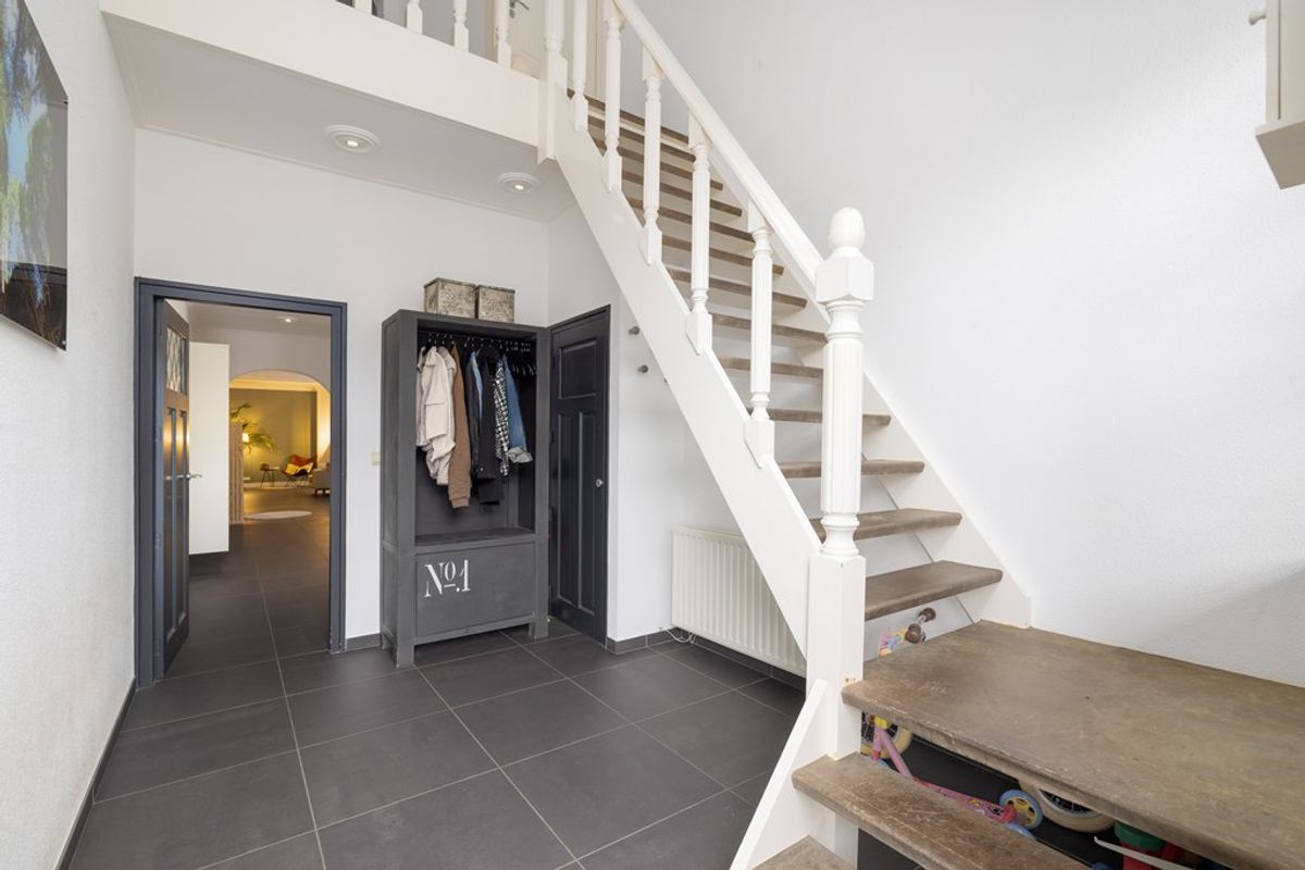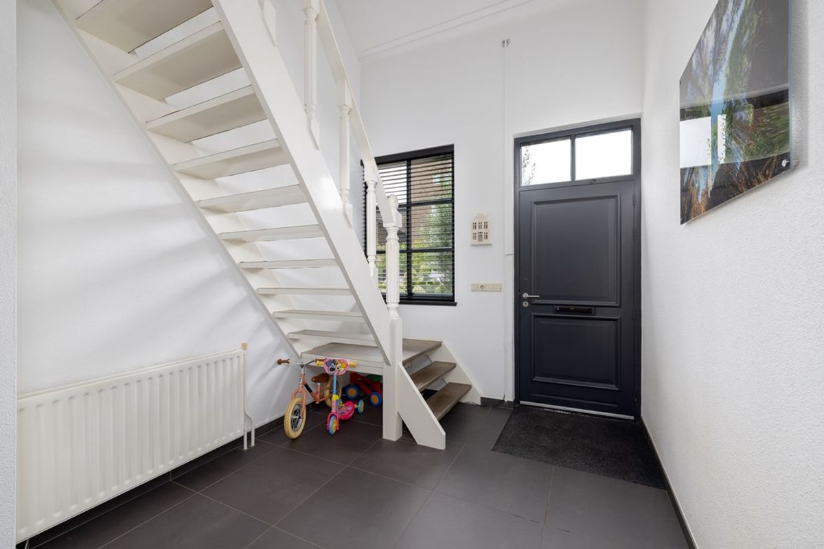 De witte gevel met donkere kozijnen en karakteristieke details geven het huis direct zijn charme. Binnen word je verwelkomd in een ruime hal met vide en houten trap. De woonkamer is royaal en licht, met hoge plafonds, een sfeervolle schouw en openslaande deuren naar de tuin. De moderne tegelvloer met vloerverwarming vormt een stijlvolle basis en zorgt voor comfort in elk seizoen.
