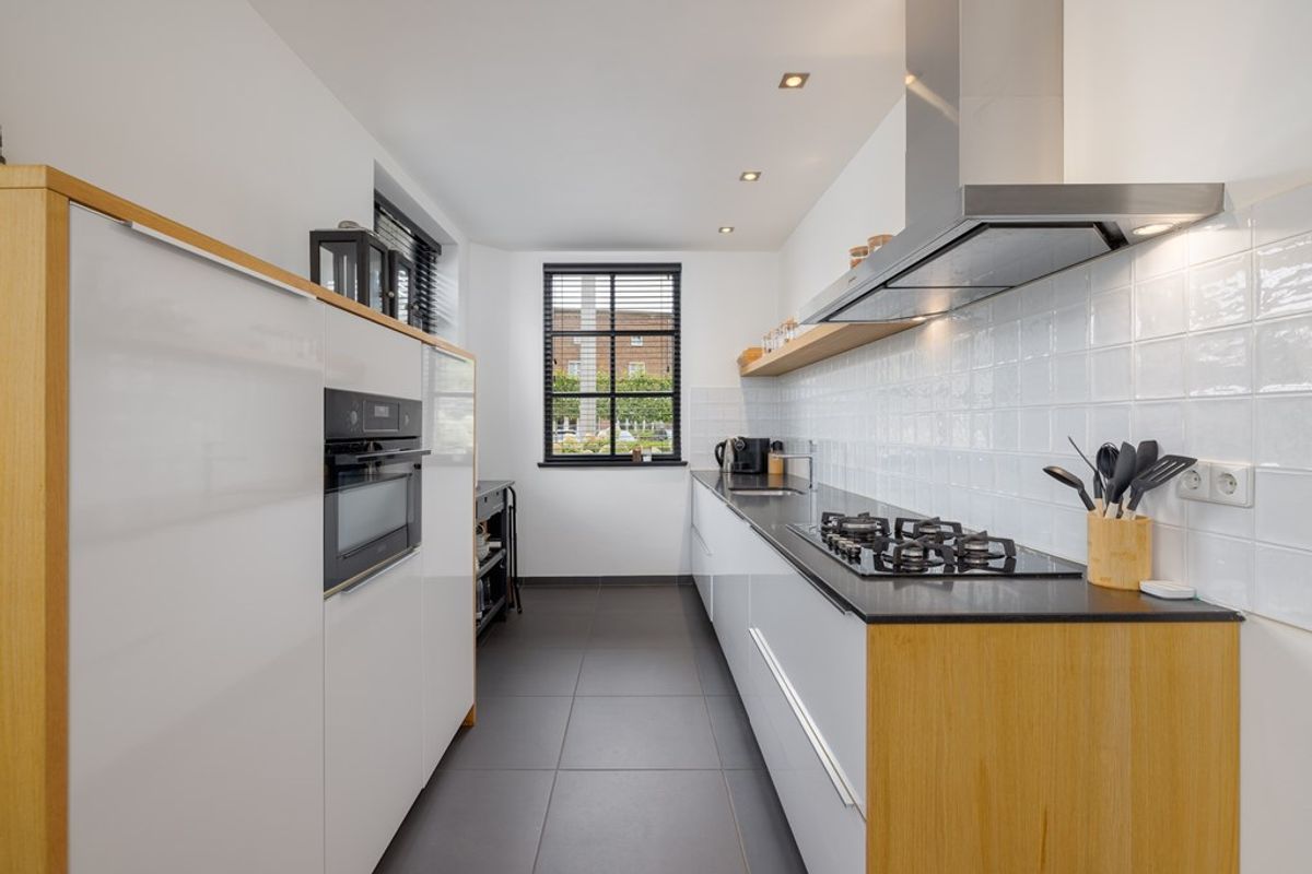 Vanuit hier loop je door naar de keuken, die strak en praktisch is ingericht in een moderne uitvoering met lichte fronten, houten accenten en een donker werkblad.
