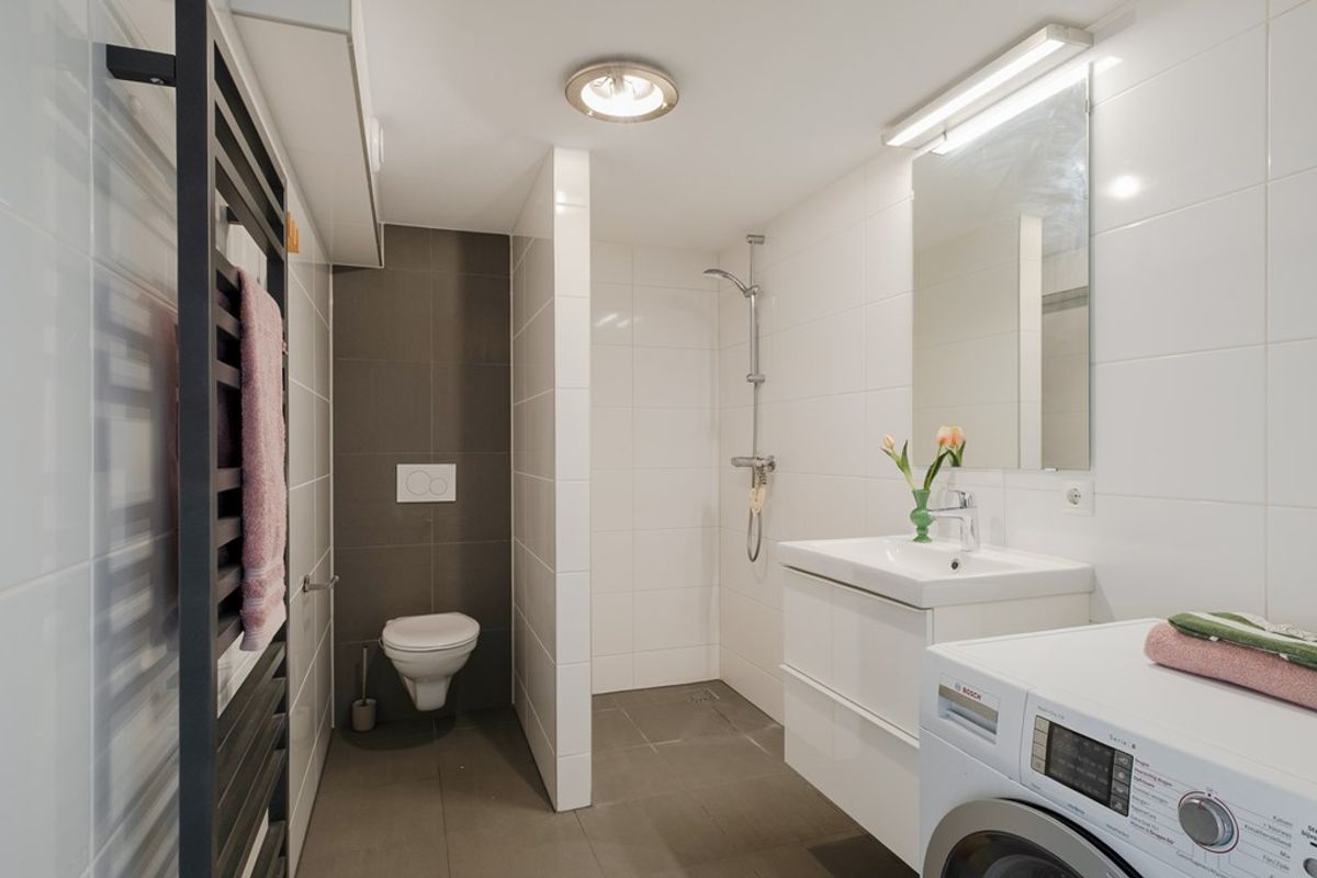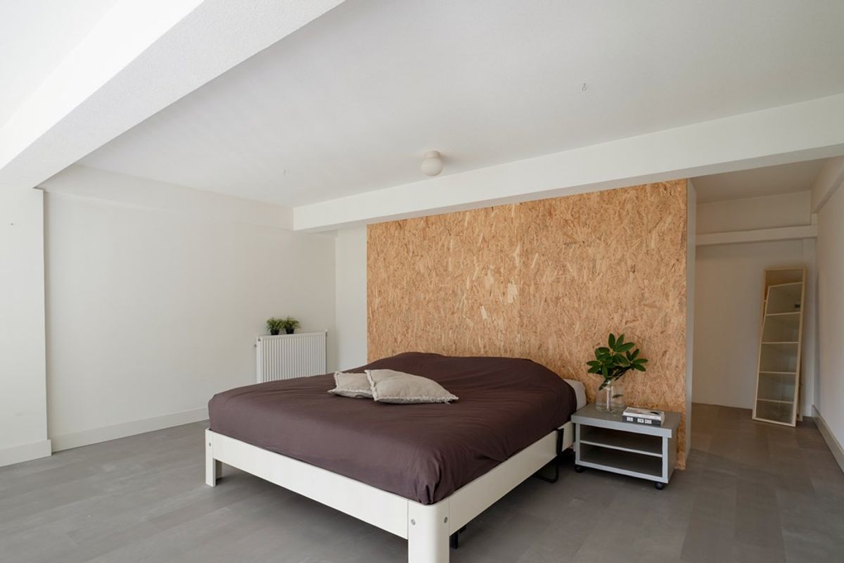 De badkamer bevindt zicht op de begane grond en is praktisch, modern en verzorgd ingericht met de mogelijkheid om de wasmachine te plaatsen, de ruime lichte slaapkamer is gesitueerd op de vide, wat zorgt voor een speels en ruimtelijk effect. Daarnaast bevindt zich achter de slaapkamer een walk in closet.