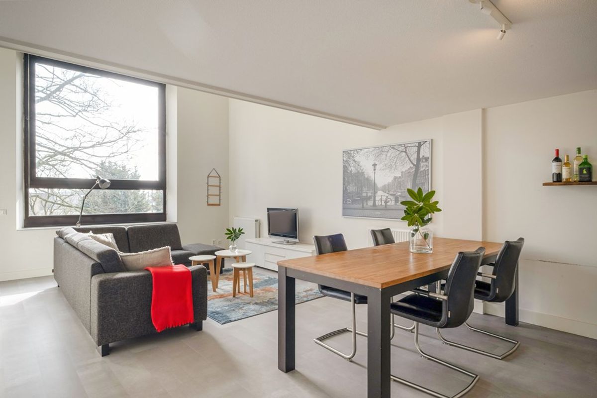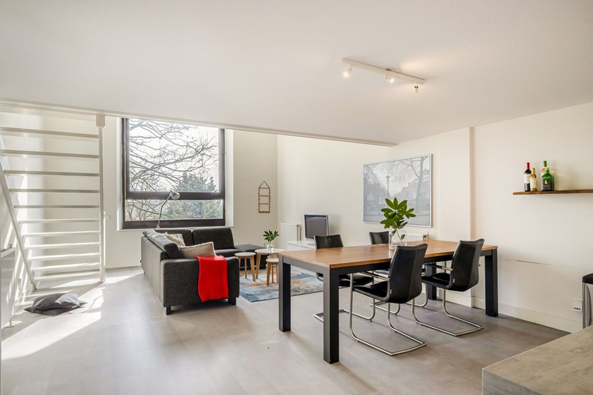 De woonkamer wordt gekenmerkt door een indrukwekkende raampartij die zich over twee verdiepingen uitstrekt. Deze zorgt voor een uitzonderlijke lichtinval en biedt een prachtig, vrij uitzicht op de fraai aangelegde tuin aan de achterzijde van het gebouw, gelegen op het zuidoosten.