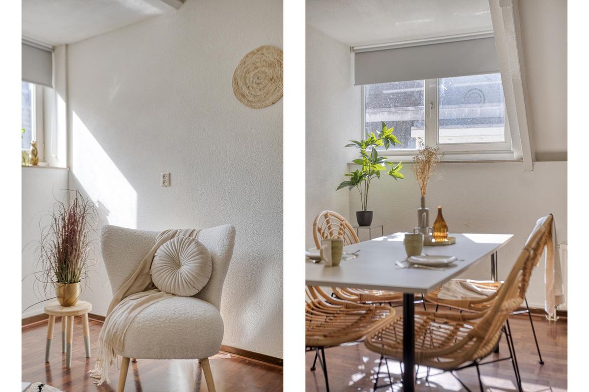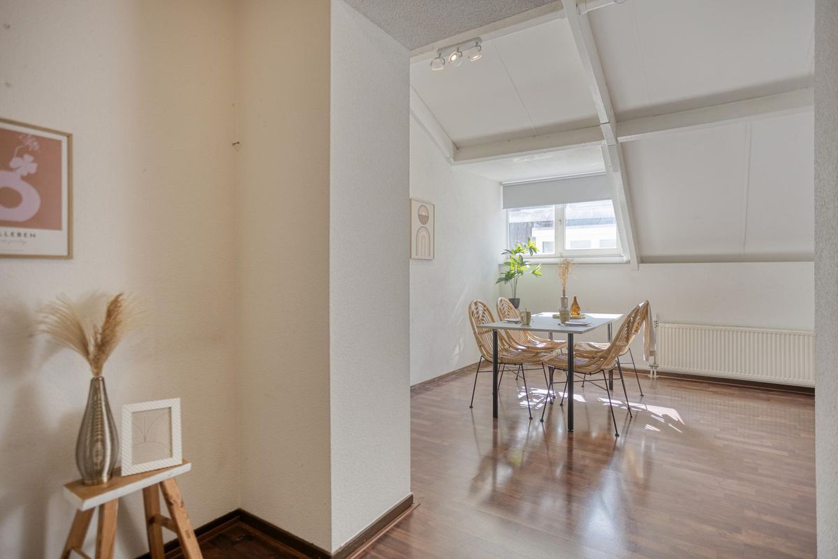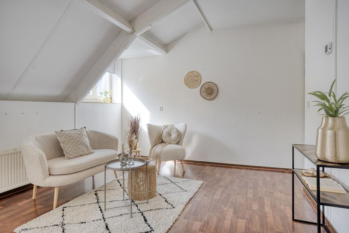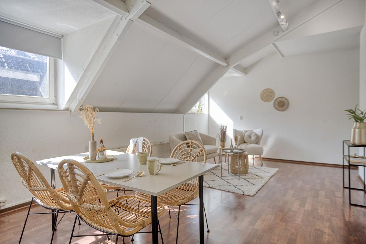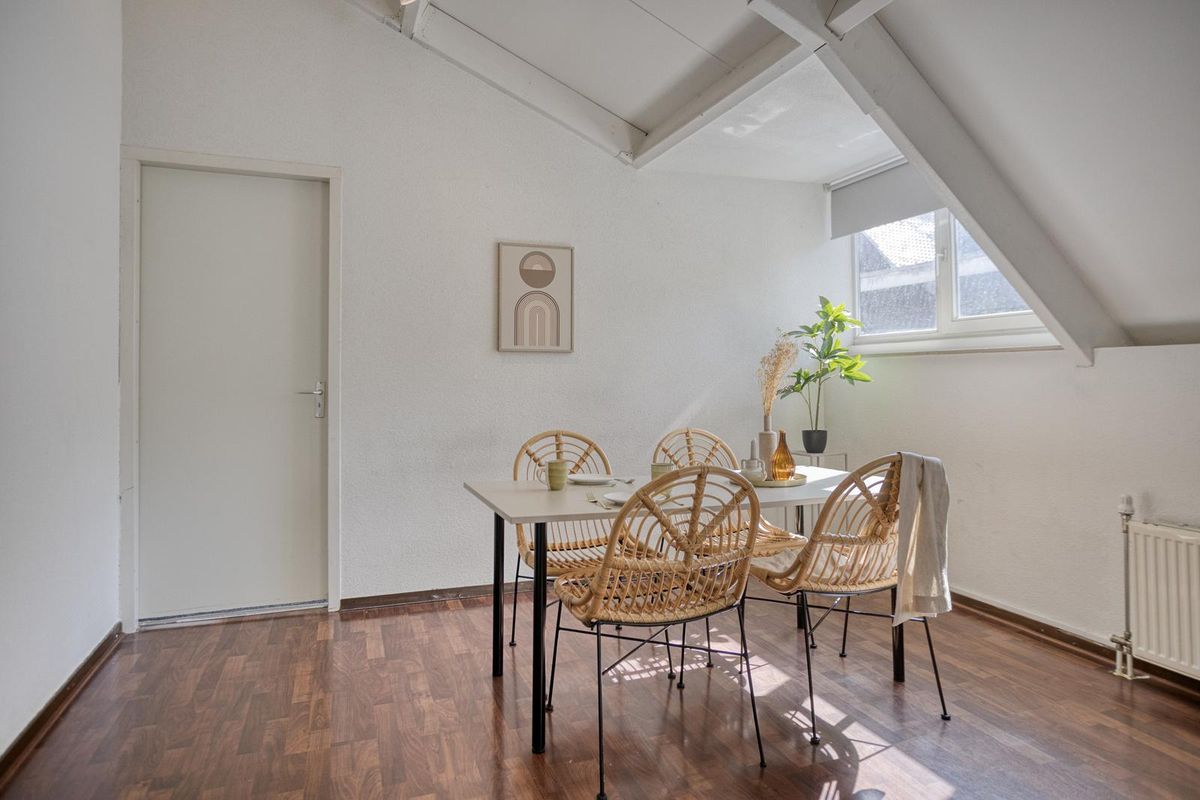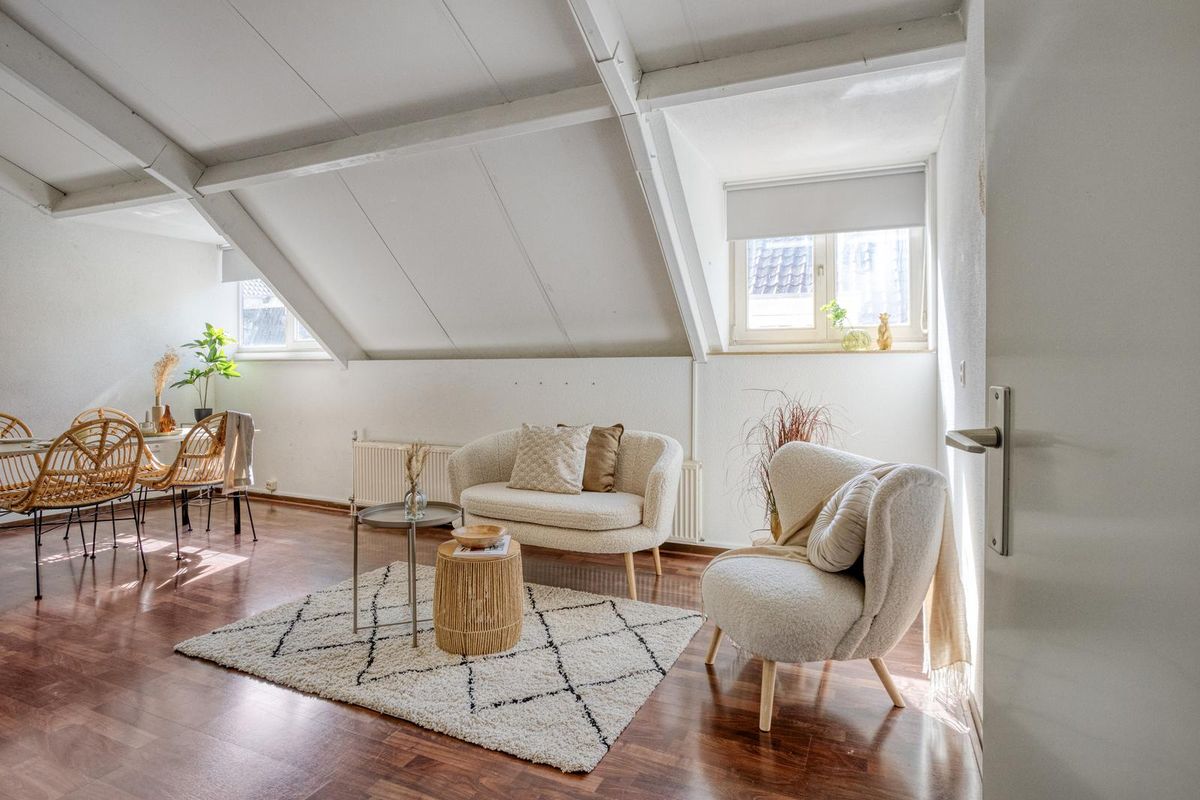 Sfeervolle woonruimte van bijna 24m² met twee dakkapellen aan de west kant (voorzijde) van het complex.