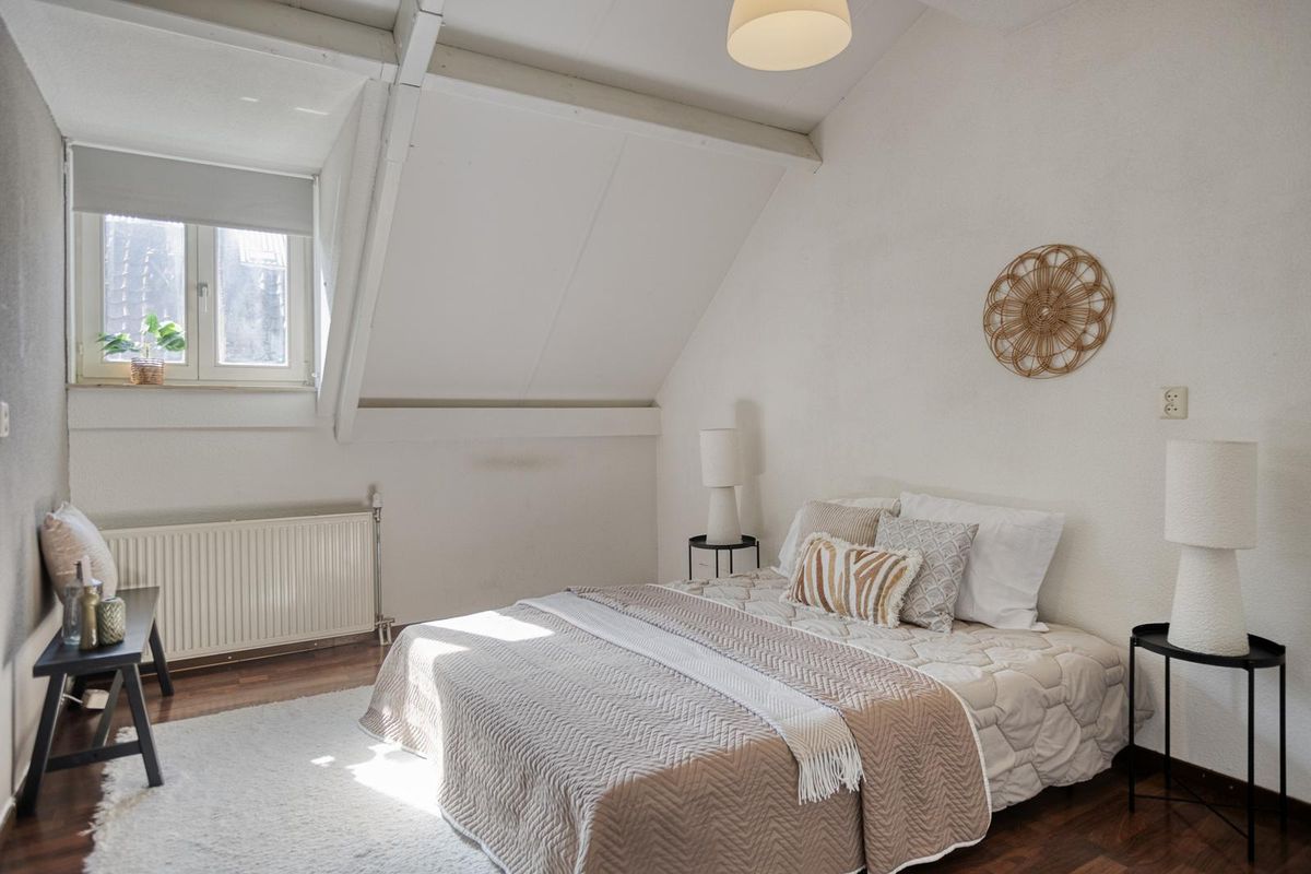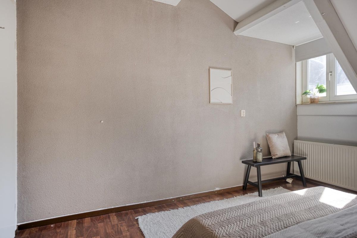 Slaapkamer 2 (12m²) heeft een laminaatvloer en is aan de andere zijde gelegen en heeft een dakkapel.