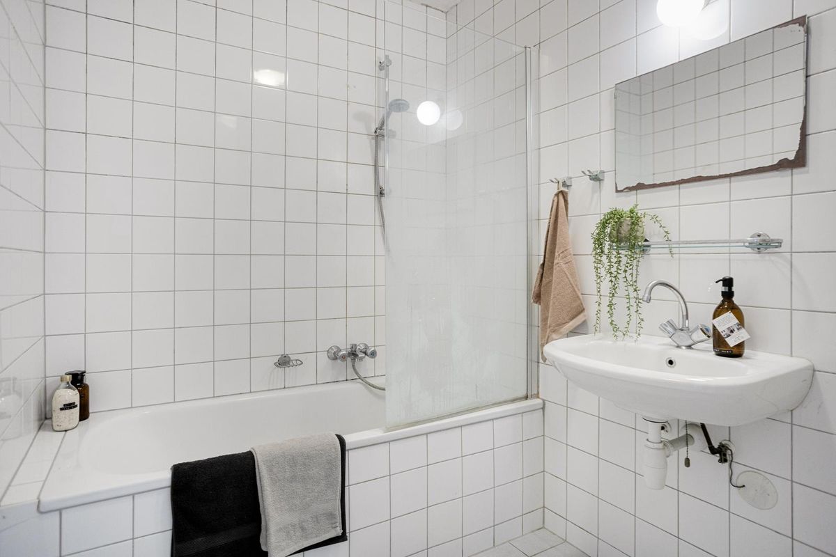 De badkamer (circa 4m²) is voorzien van een bad-douche combinatie, een wasmeubel met wasbak en een radiator.