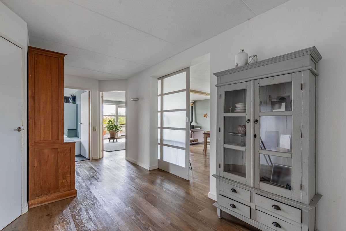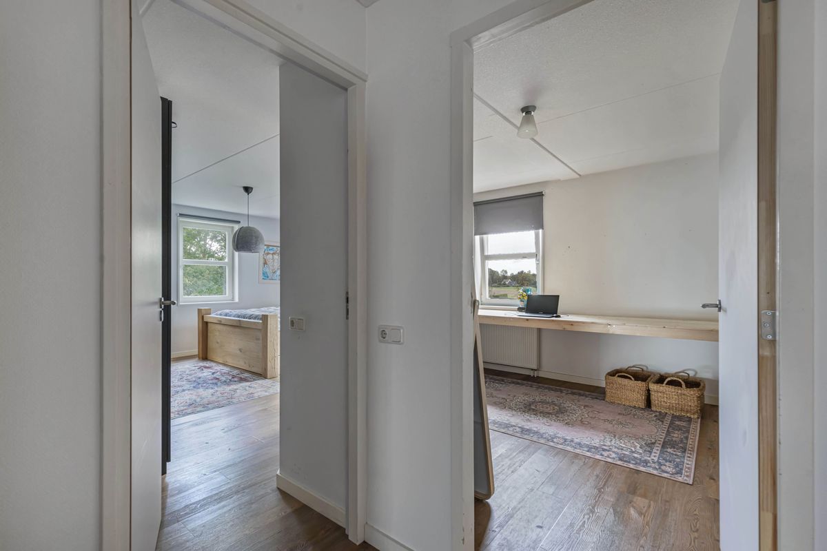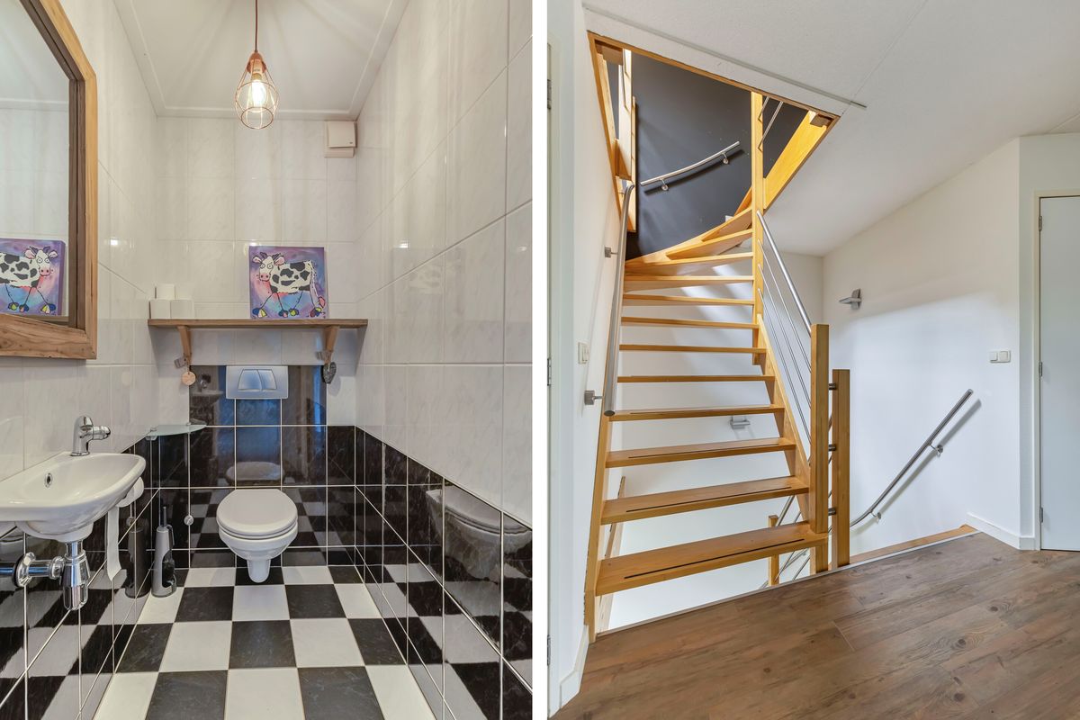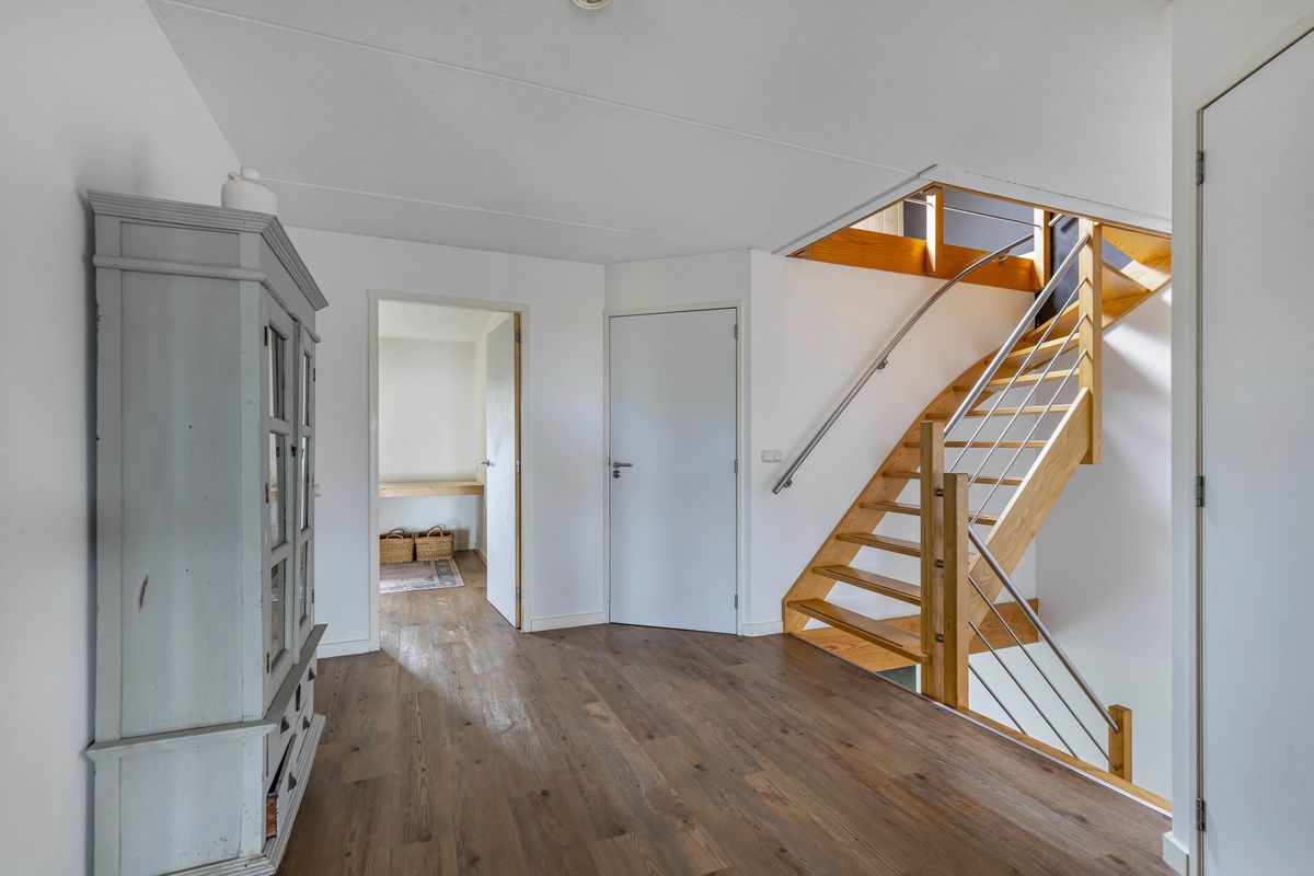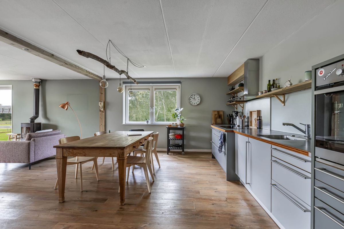 overloop, berging met witgoedvoorzieningen en deur naar de verdieping van de berdrijfshal. Toilet met fontein, 3 slaapkamers, badkamer voorzien van dubbele wastafel, ligbad en douchecabine. Ruime woonkamer met houtkachel, toegang tot het ruime balkon, moderne keuken met inbouwapparatuur zoals: inductiekookplaat met afzuigkap, oven, vaatwasser en koelkast.