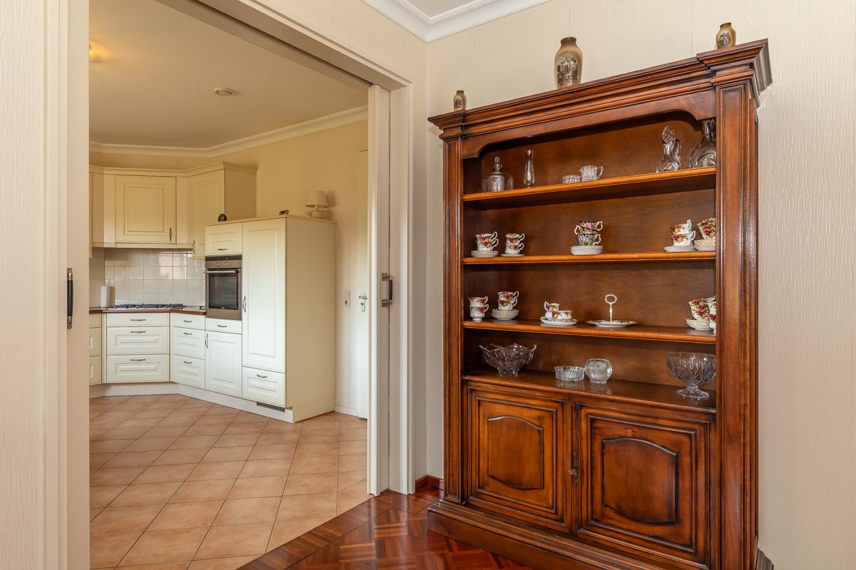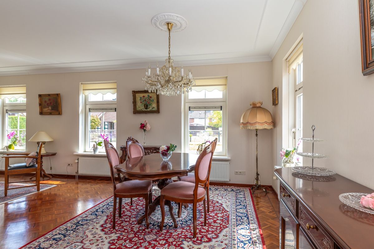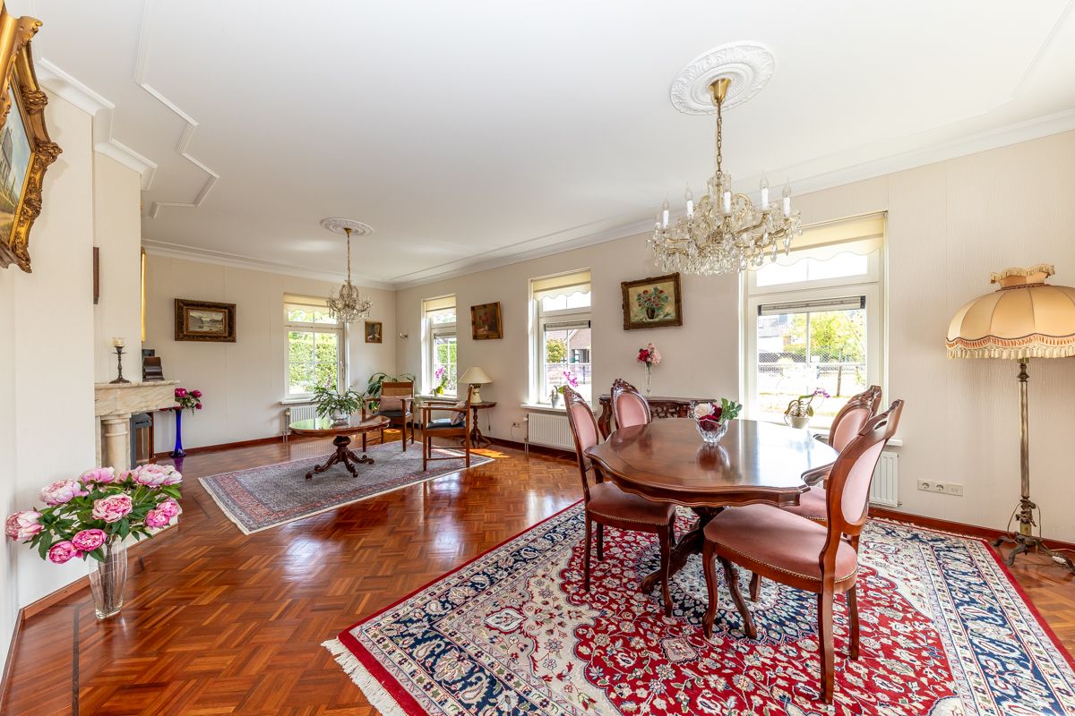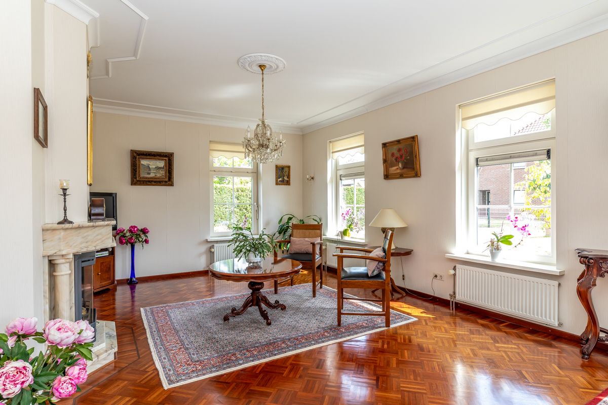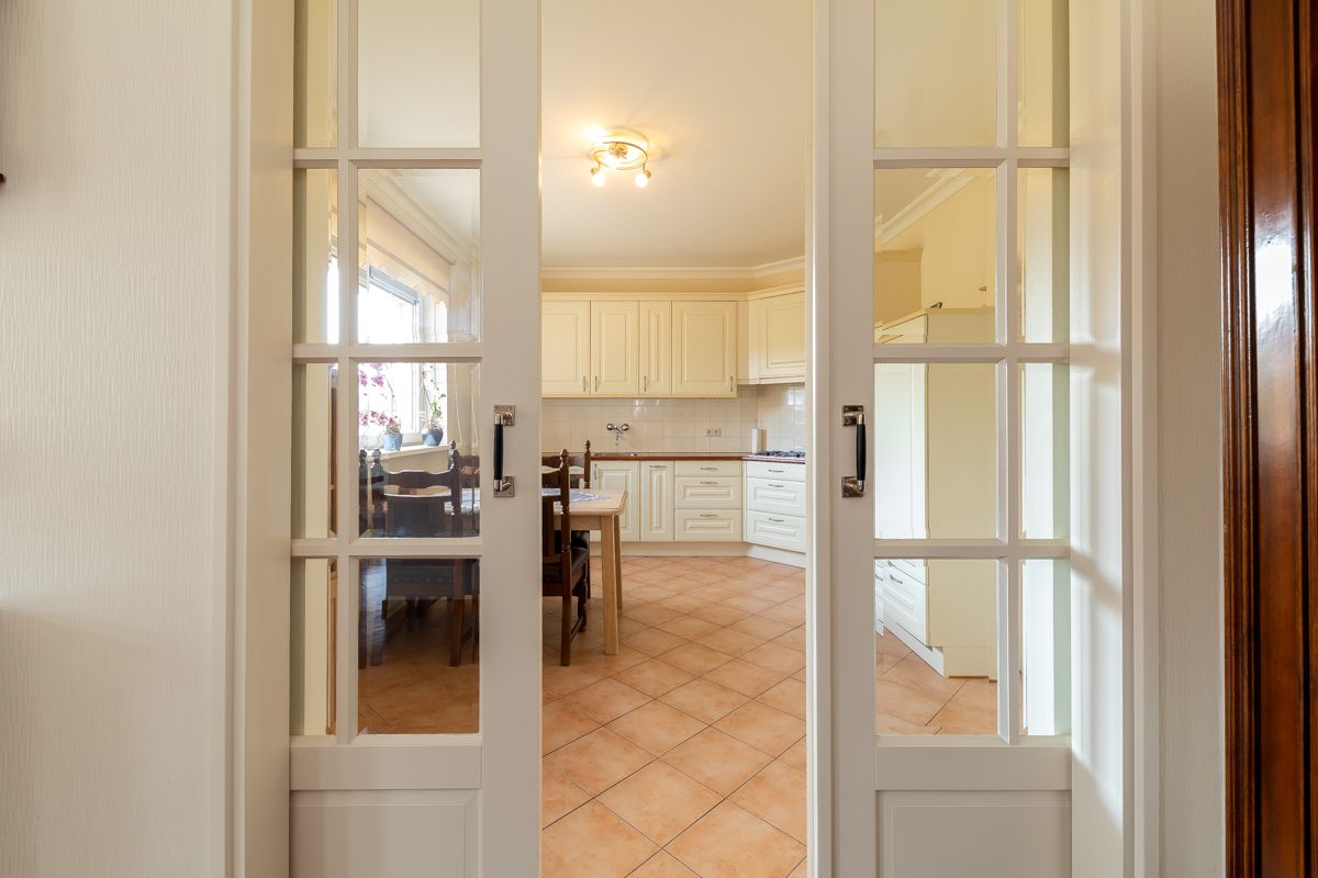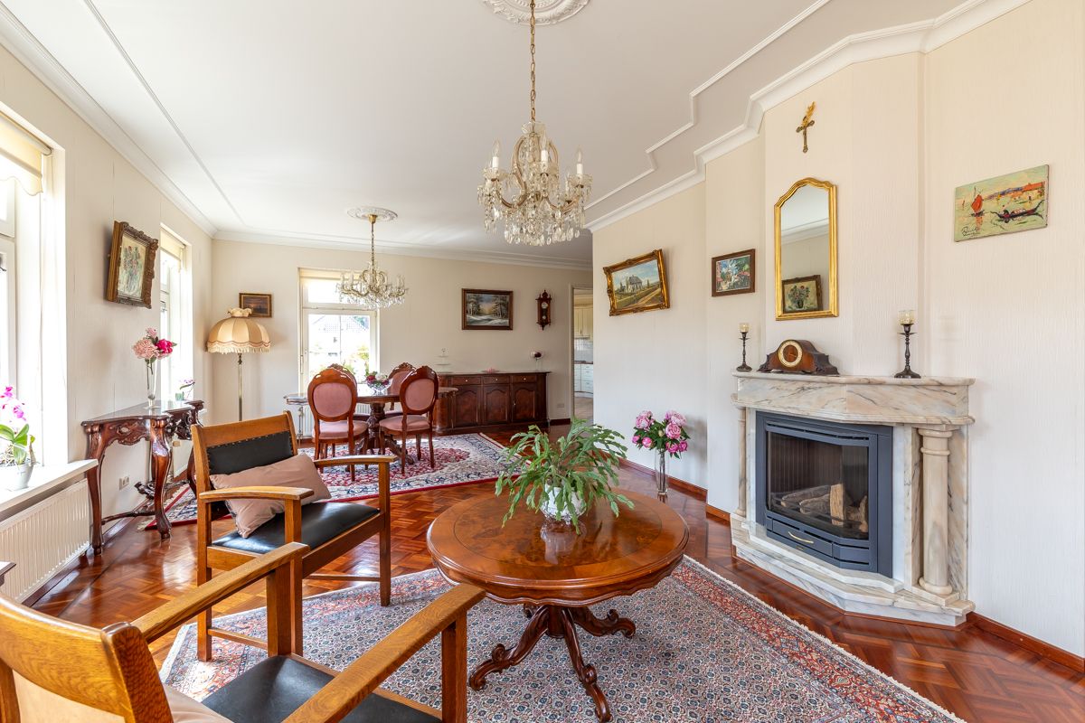 De woonkamer is licht en ruim, voorzien van een merbau parket en een sfeervolle gashaard. Via de grote schuifdeuren bereikt u de eetkamer en keuken.
