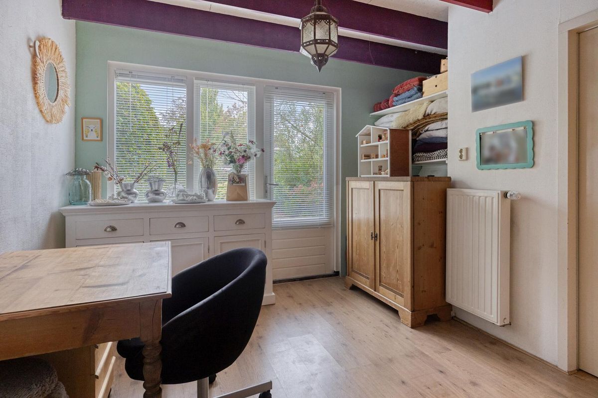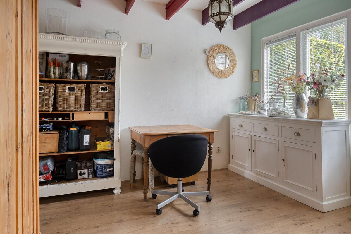 De voormalige garage is volledig geïsoleerd en voorzien van een radiator, wastafel en eigen toegangsdeur, waardoor deze ruimte heel goed kan dienen als kantoorruimte of slaapkamer. Tussen deze ruimte en de keuken bevindt zich nog de bijkeuken, met opstelplaats voor de cv-ketel, de unit heteluchtverwarming en de wasmachine en -droger.