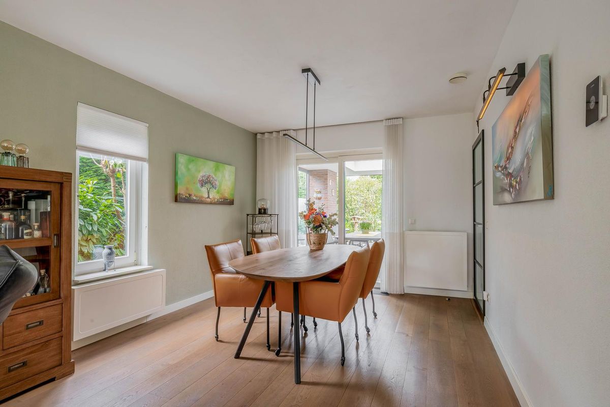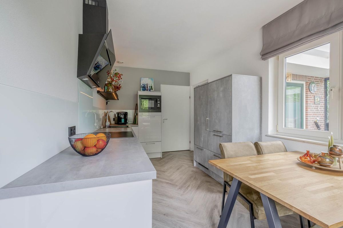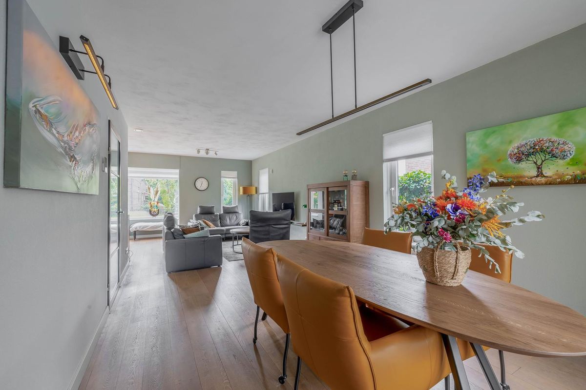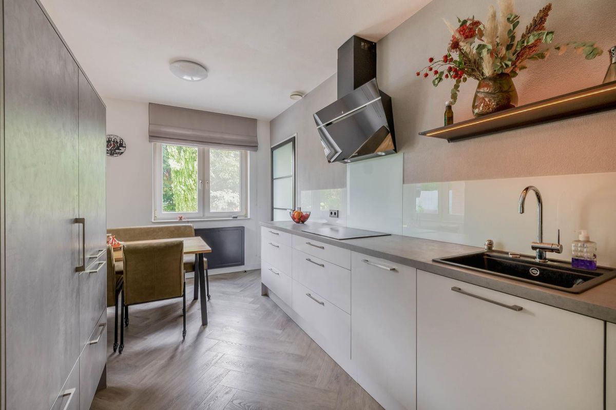 De lichte en ruime L-vormige woonkamer (ca. 42m²) heeft een erker aan de voorzijde en een schuifpui richting de overkapping in de achtertuin. Er ligt een mooie, doorlopende houten vloer vanuit de hal. In de keuken (2021) ligt een pvc-vloer. De keuken is ca. 13m². Er zijn een combi oven/magnetron, koelkast, vaatwasser, inductiekookplaat en afzuigkap aanwezig. De grote bergkast zorgt voor veel opbergruimte. De pvc-vloer loopt door in de bijkeuken.