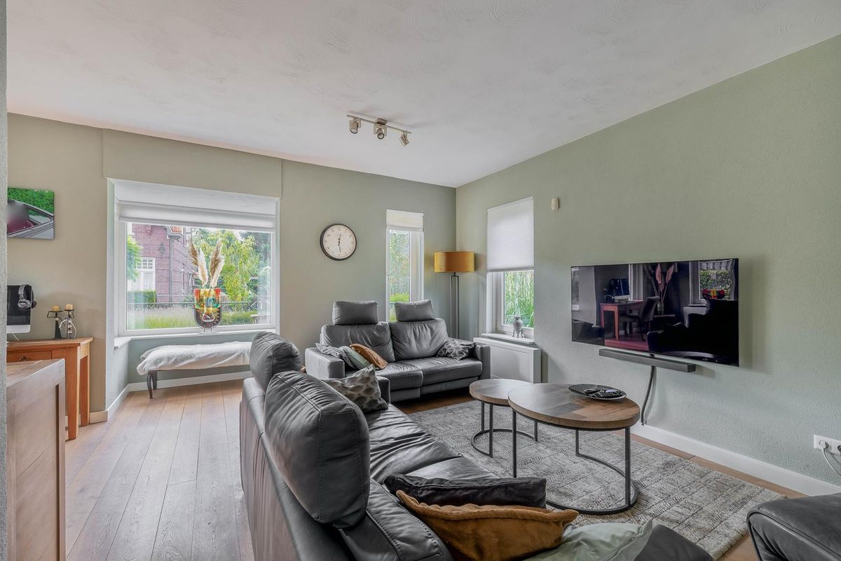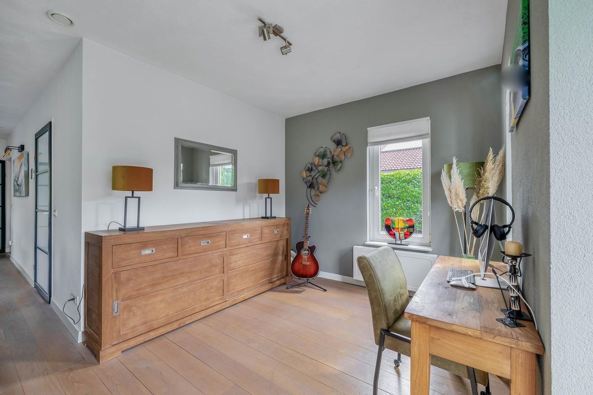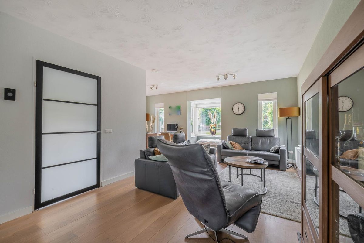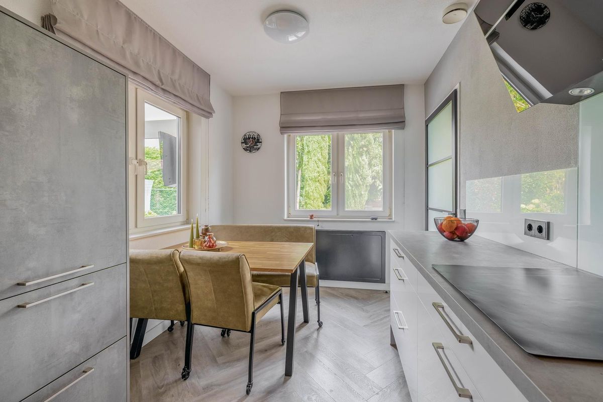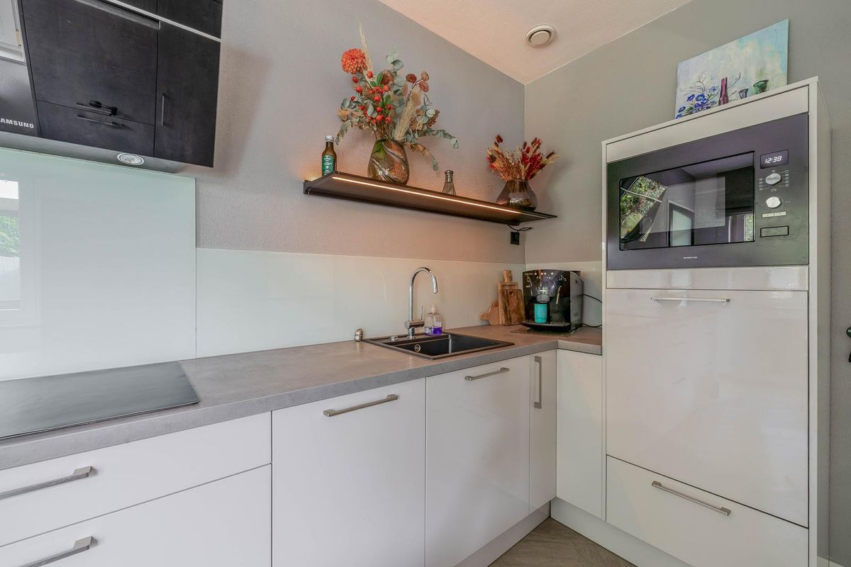 De lichte en ruime L-vormige woonkamer (ca. 42m²) heeft een erker aan de voorzijde en een schuifpui richting de overkapping in de achtertuin. Er ligt een mooie, doorlopende houten vloer vanuit de hal. In de keuken (2021) ligt een pvc-vloer. De keuken is ca. 13m². Er zijn een combi oven/magnetron, koelkast, vaatwasser, inductiekookplaat en afzuigkap aanwezig. De grote bergkast zorgt voor veel opbergruimte. De pvc-vloer loopt door in de bijkeuken.