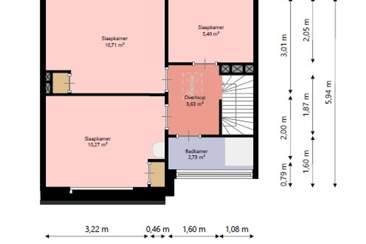 Ruime overloop, 3 slaapkamers van respectievelijk 11 , 11 en 5,5m2 en een nette badkamer.