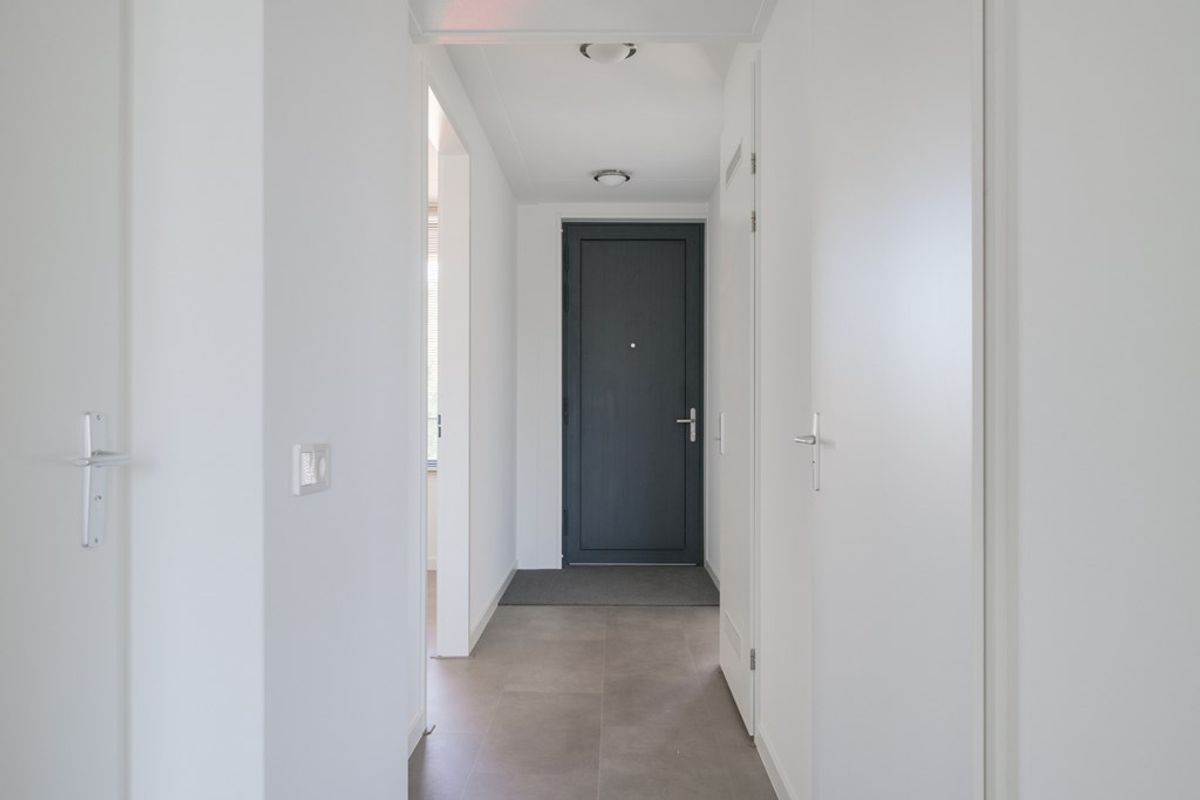 Via de centrale entree van het complex, voorzien van brievenbussen, bereikt u met de trap of lift de eerste verdieping waar dit appartement zich bevindt. De hal van het appartement biedt direct toegang tot alle vertrekken en is afgewerkt met een strakke PVC-vloer die doorloopt in de gehele woning. Hier vindt u ook het moderne toilet met wandcloset en fonteintje, uitgevoerd in witte wandtegels met een grijze vloer.