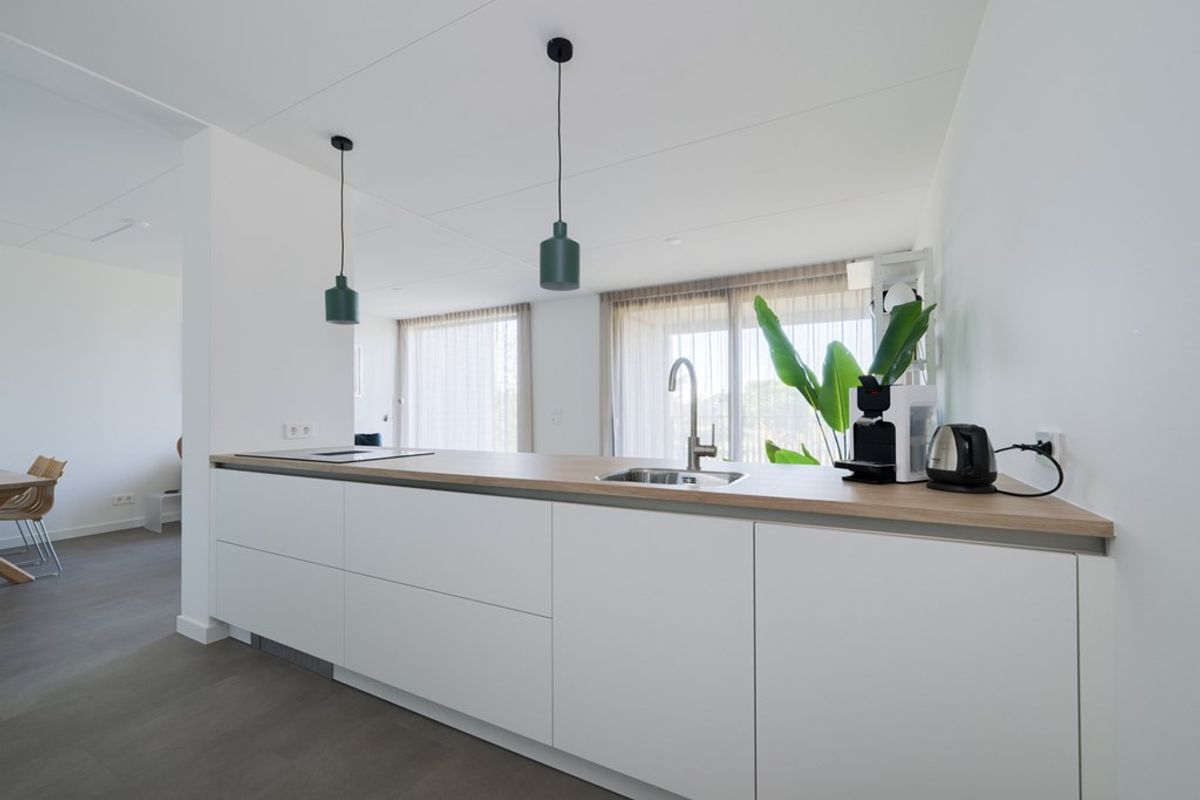 De witte kastfronten in combinatie met het kunststof werkblad geven de keuken een frisse, tijdloze uitstraling. Alle benodigde apparatuur is aanwezig: een inductiekookplaat met geïntegreerde afzuiging (geen storende afzuigkap in het zicht), koel-vriescombinatie, vaatwasser, combimagnetron en een praktische boiler. De doordachte indeling zorgt ervoor dat alles binnen handbereik is tijdens het koken.