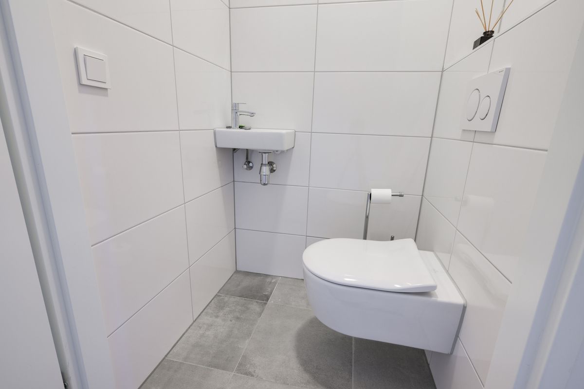 De luxe badkamer is volledig betegeld in strakke witte wandtegels met een grijze vloertegel. Deze ruimte biedt zowel een ligbad als een inloopdouche met glazen wand. De compacte wastafel met spiegel maakt het geheel compleet. Tevens is er vloerverwarming en mechanische ventilatie aanwezig.