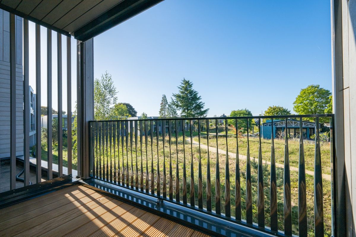 Het overdekte balkon is een heerlijk verlengstuk van uw woonruimte. Via de schuifpui vanuit de woonkamer stapt u zo het balkon op, dat is afgewerkt met fraai houten vlonders. De overkapping biedt beschutting tegen zon en regen, waardoor u hier het hele jaar door kunt genieten. Het balkon kijkt uit over de gezamenlijke groene tuin en biedt voldoende ruimte voor een gezellige zithoek.