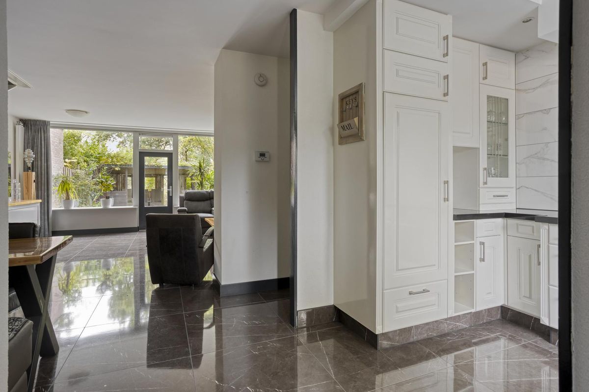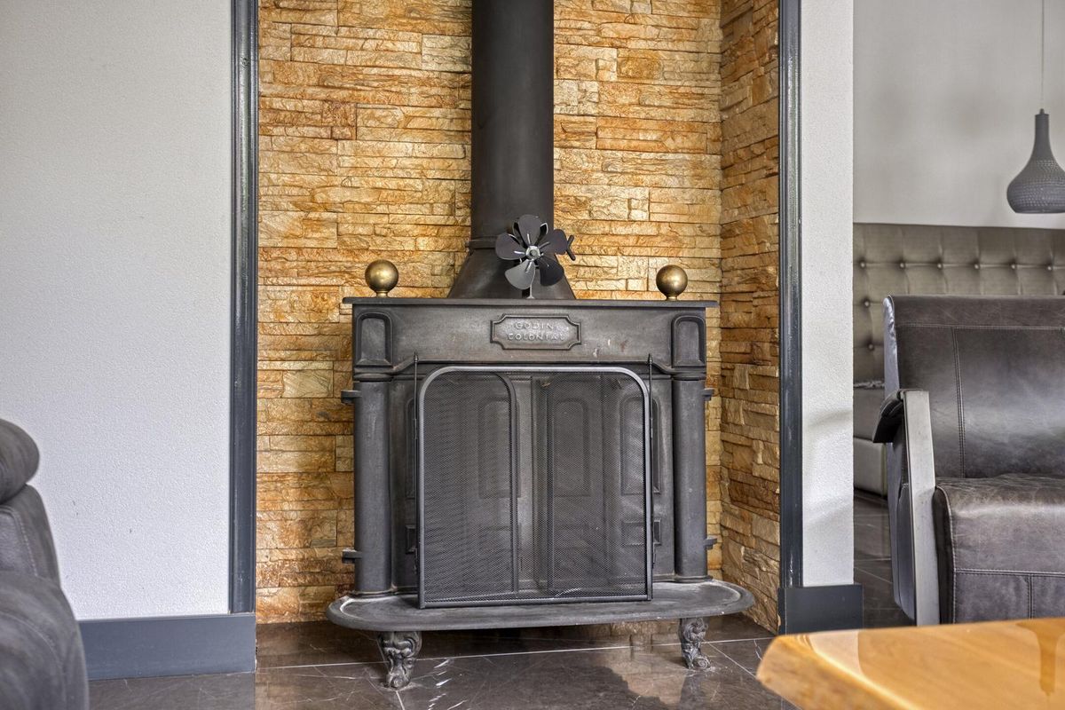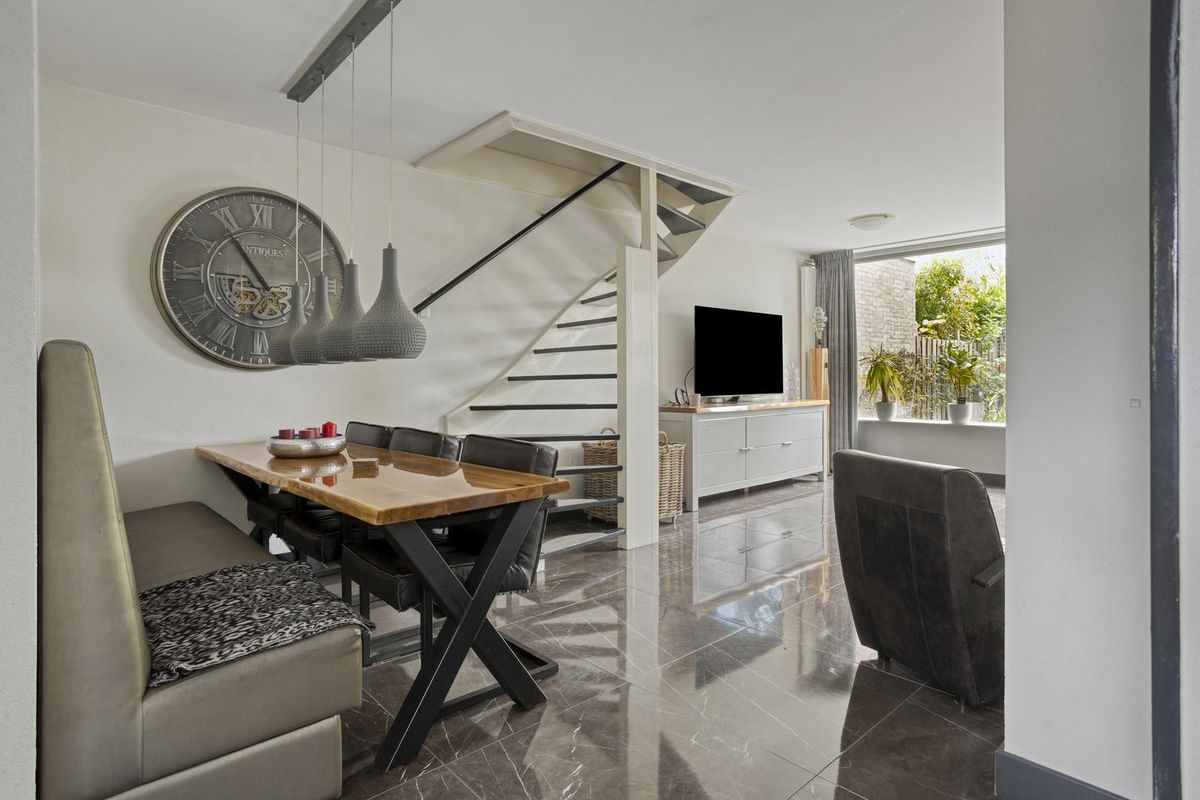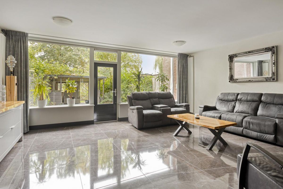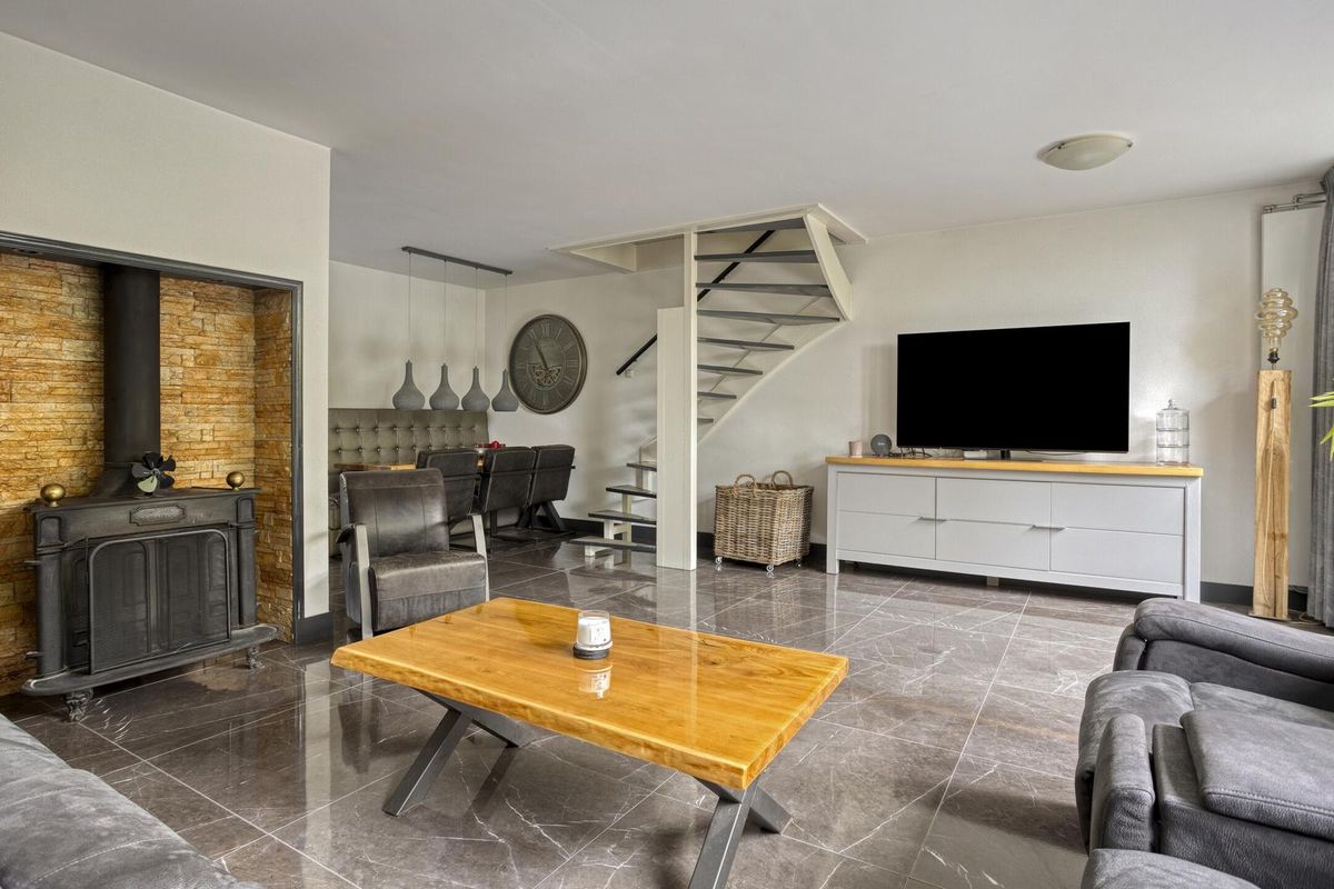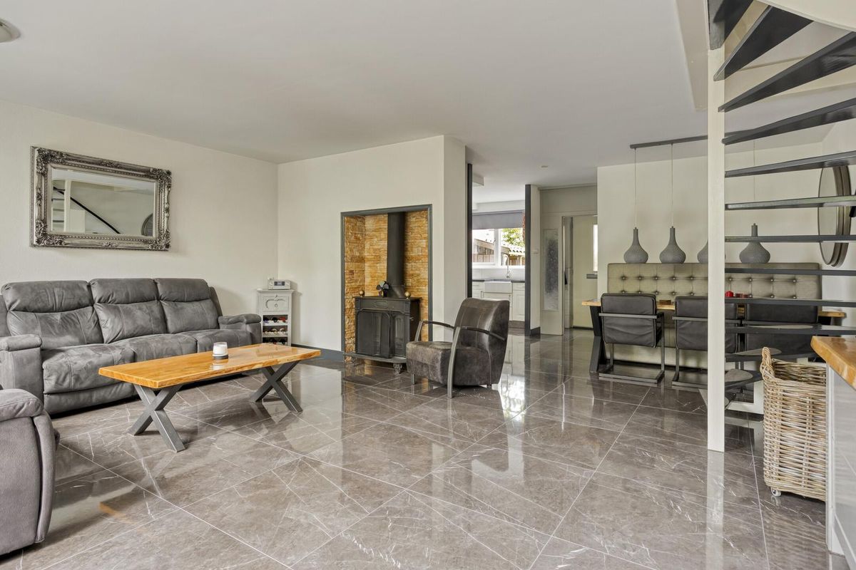 De tuingerichte woonkamer (circa 6 meter breed) is een fijne, lichte ruimte dankzij de grote raampartijen en heeft een sfeervolle houtkachel in een nis met goudkleurige steenstrips – perfect voor de koude avonden. Vanuit de woonkamer is er fraai zicht op de zonnige achtertuin. De achtergevel beschikt over een zonnescherm dat voor aangename schaduw zorgt op warme dagen.