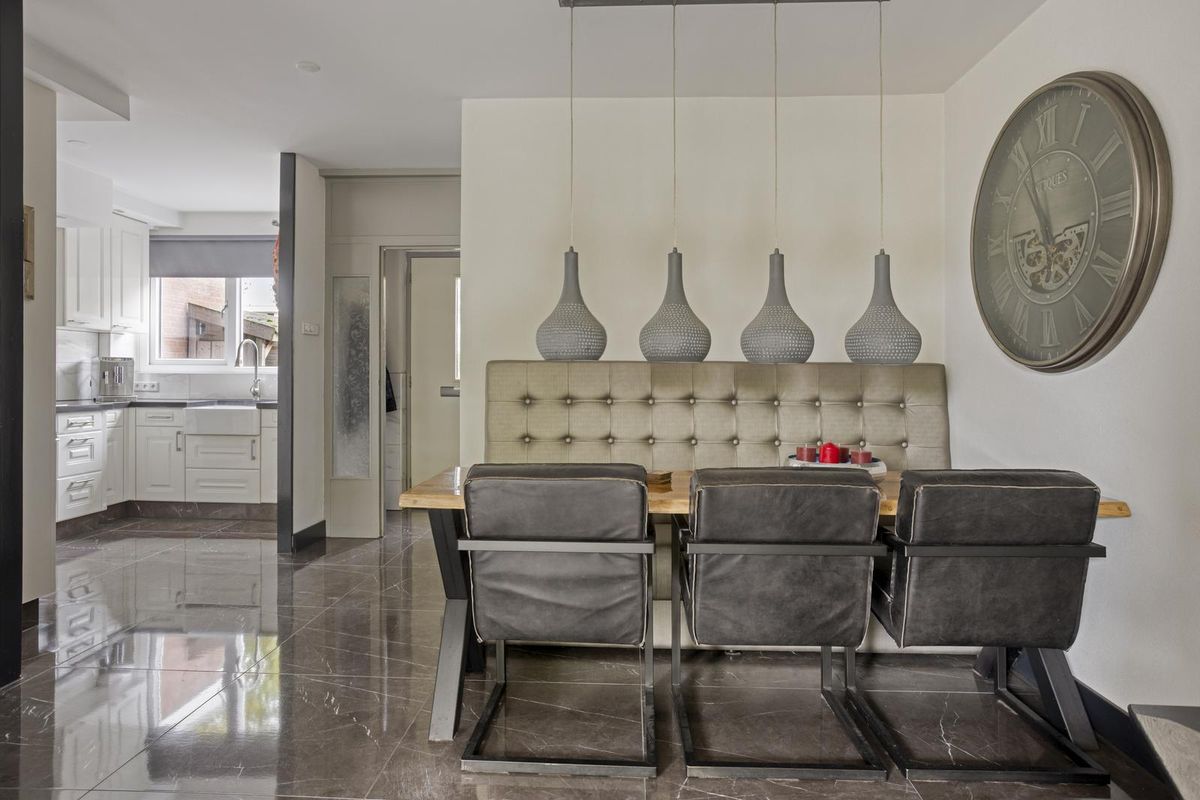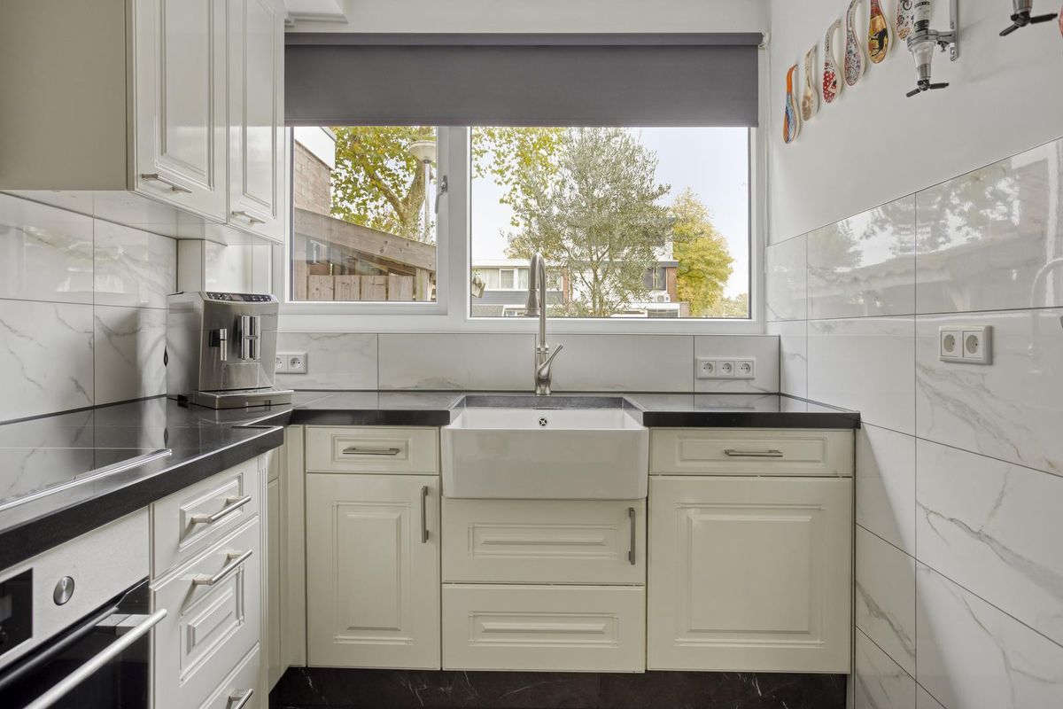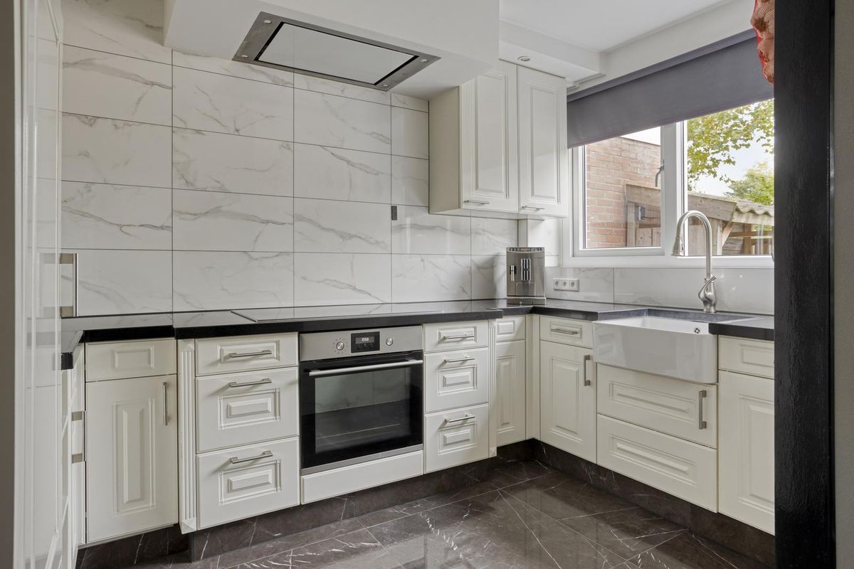 De halfopen keuken, uitgevoerd in een lichte kleurstelling, is gesitueerd aan de voorzijde van de woning. De keuken heeft een praktische U-opstelling en is uitgerust met diverse inbouwapparatuur, waaronder een inductiekookplaat, afzuigkap, boiler, oven, koelkast en vaatwasser. Daarnaast is er volop bergruimte in de kasten.