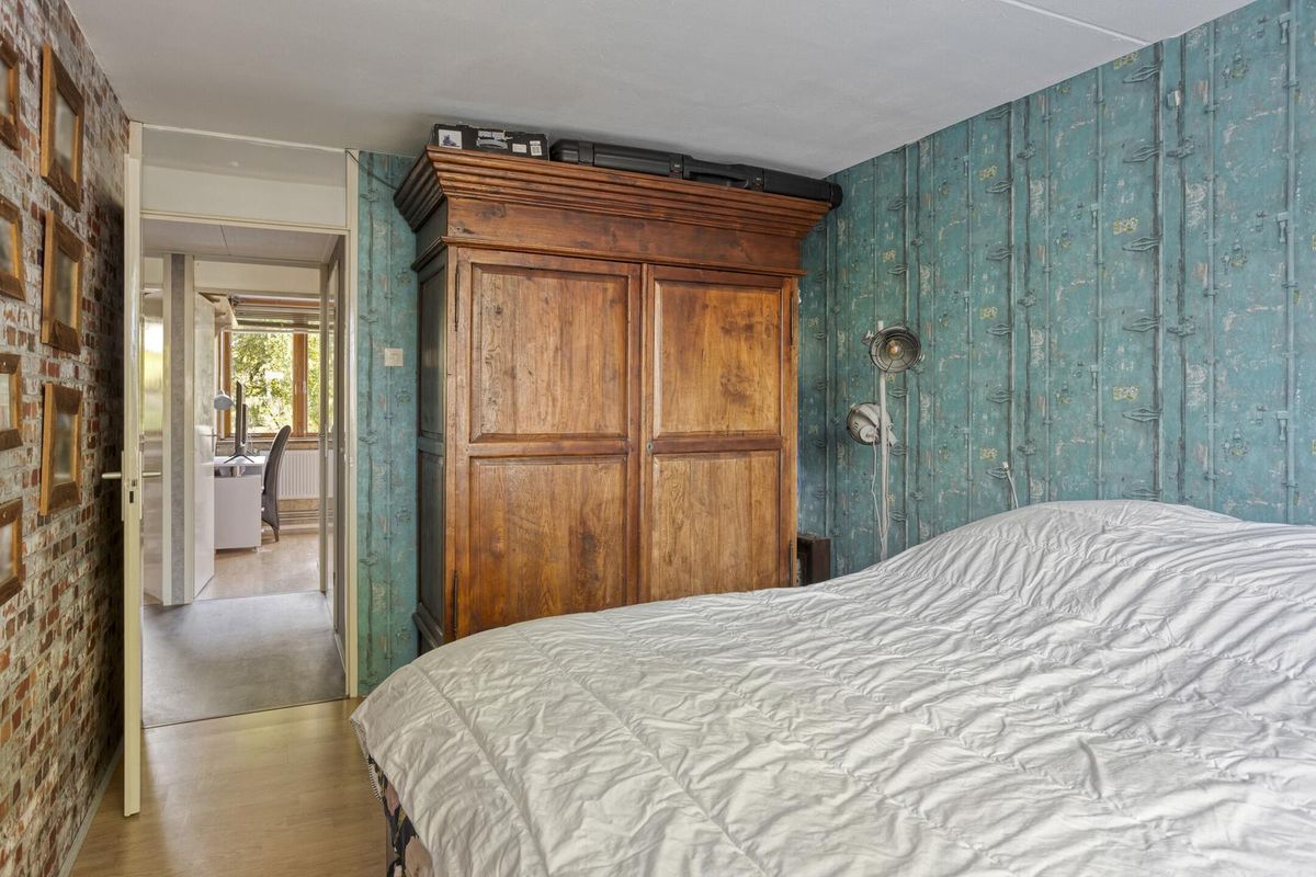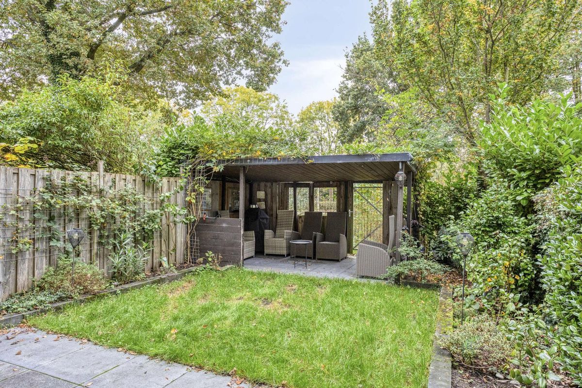 De achtertuin, gelegen op het zuiden, biedt rust, zon en privacy. Onder de overkapping kun je ook tijdens een zomerse bui heerlijk buiten zitten. De tuin is bereikbaar via een achterom en grenst aan een vijver.