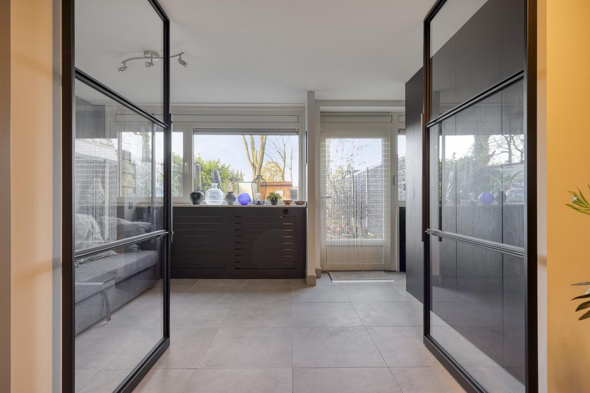 Entree met meterkast. Via een glazen deur kom je in de ruime hal met toegang tot de garage/berging, het toilet, de trap naar de eerste verdieping en via openslaande glazen deuren de tuinkamer. De tuinkamer beschikt over twee vaste kasten; in één daarvan bevinden zich de aansluitingen voor wasmachine en droger. Daarnaast is er een wastafel met spiegel, een boiler en extra opbergruimte. Via een deur bereik je de diepe achtertuin (18 meter), gelegen op het westen, met een berging en een achterom. Aan de achtergevel bevindt zich een elektrisch bedienbaar rolluik.