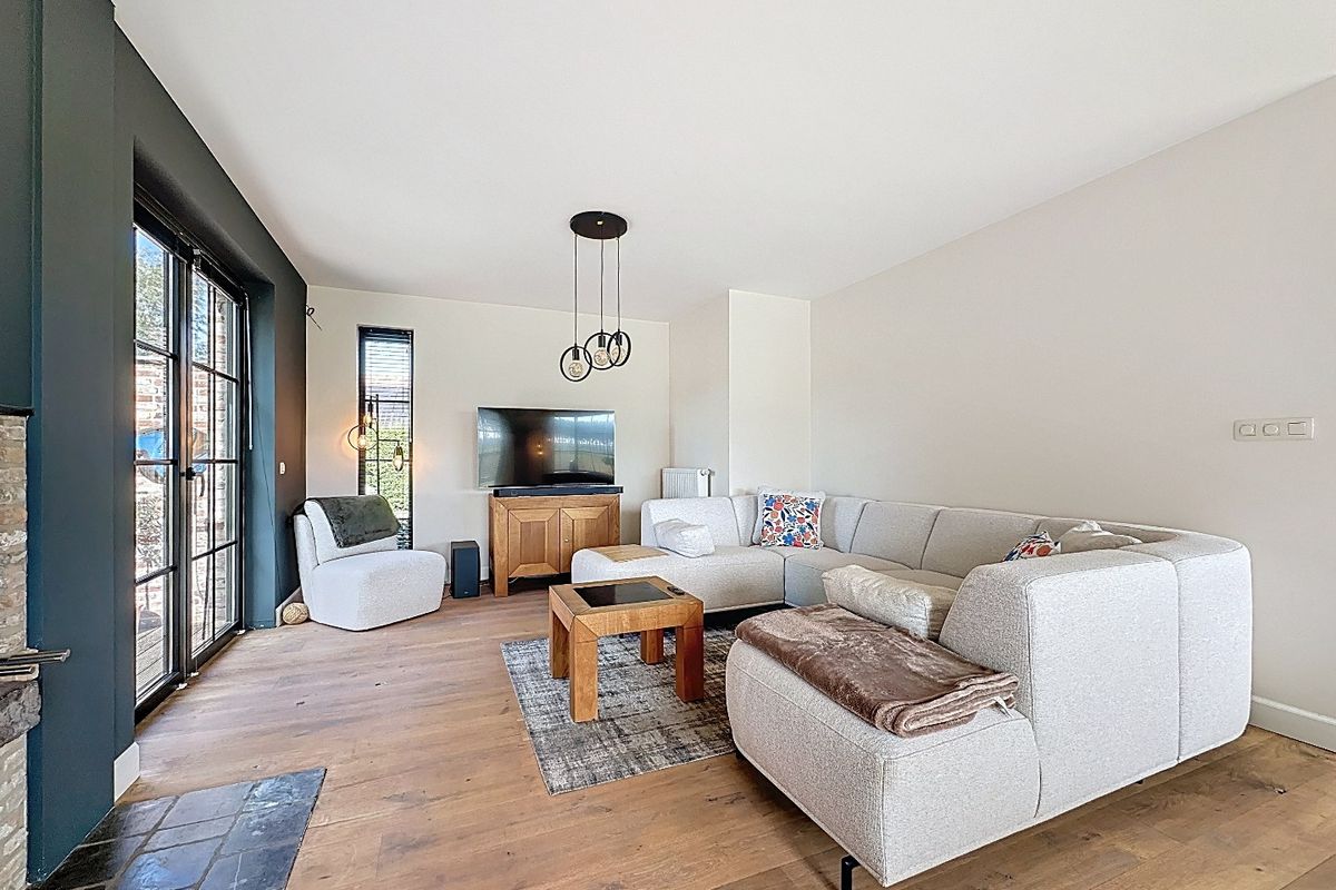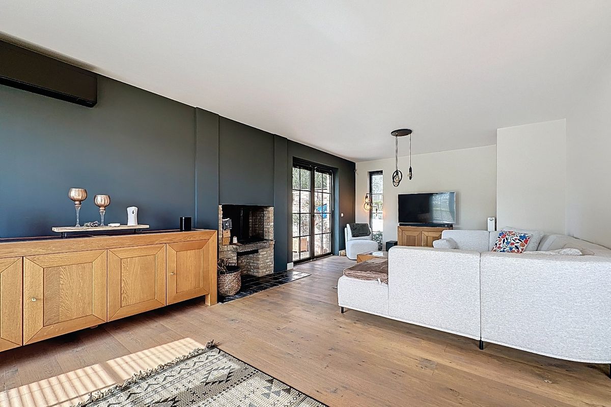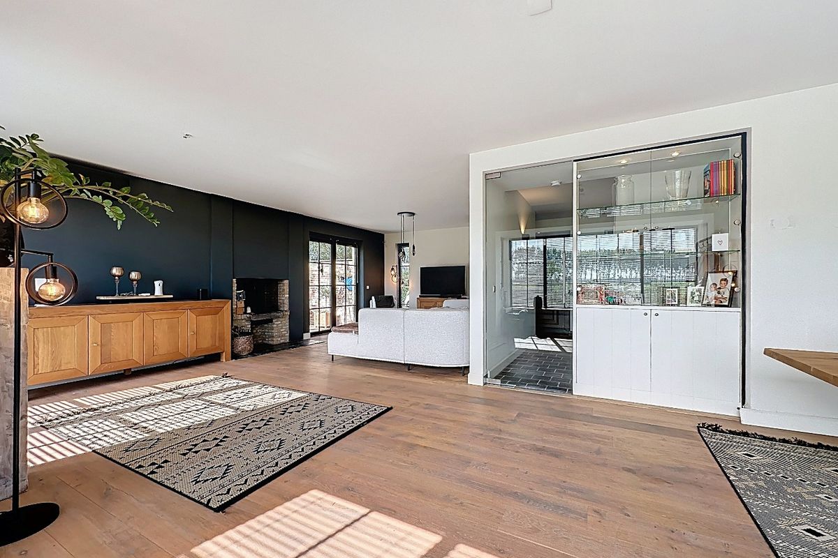 Via de hal met een prachtige natuurstenen tegelvloer kom je via een glazen deurwand in de lichtrijke en ruime U-vormige woonkamer—een echte eyecatcher met openslaande deuren naar de tuin en een grote raampartij die het schitterende landschap naar binnen haalt. De parketvloer en een sfeervolle open haard zorgen voor een warme, uitnodigende sfeer.