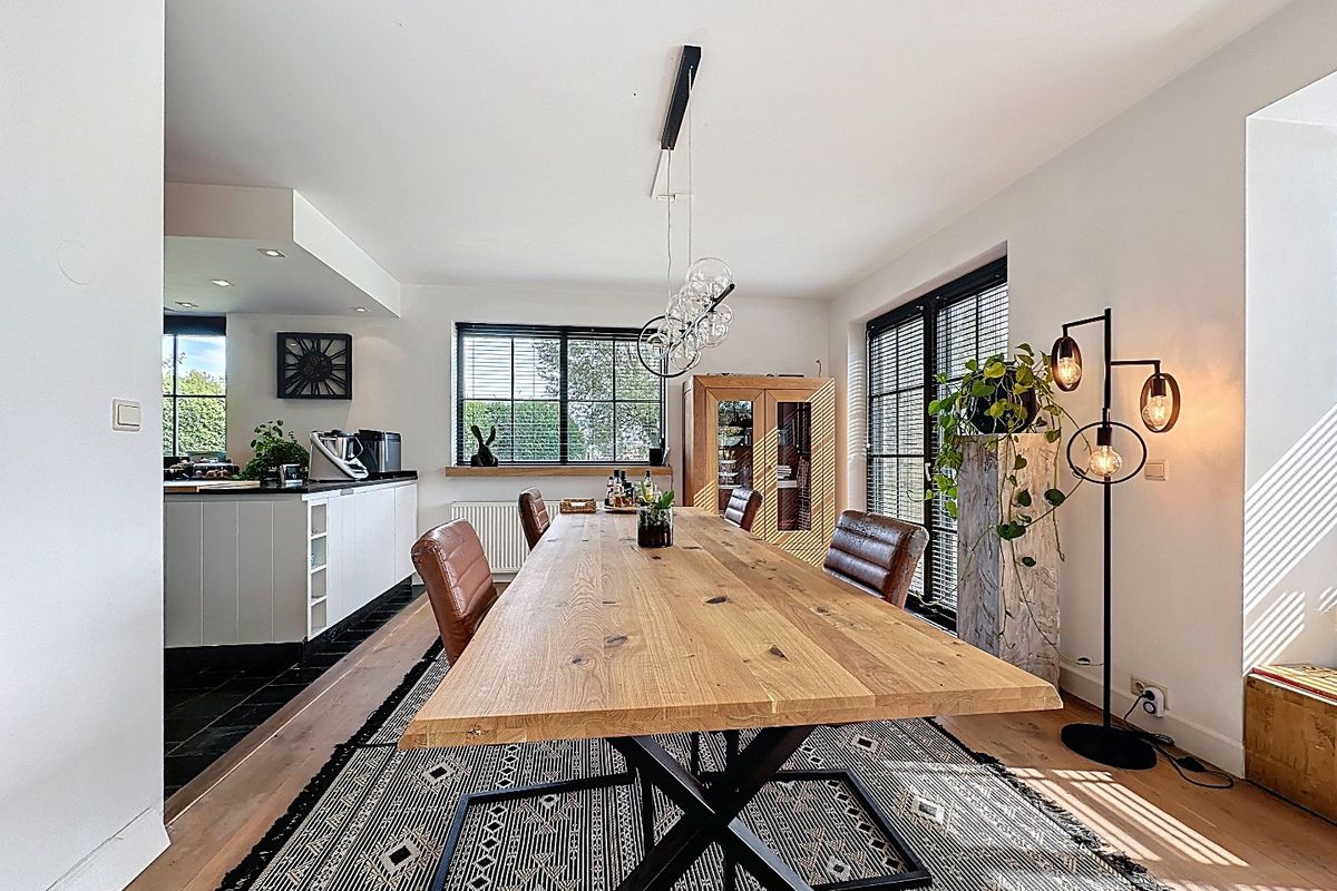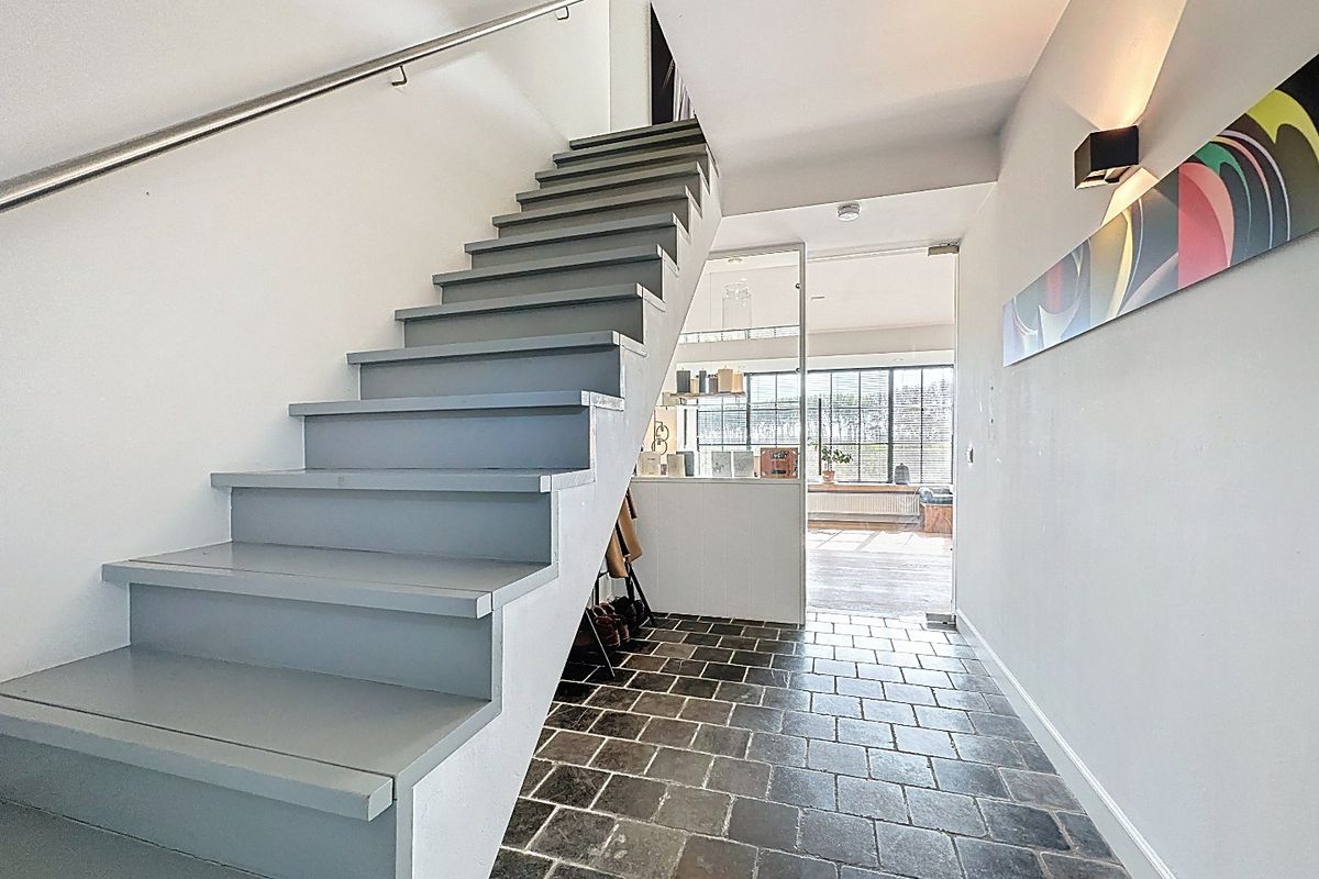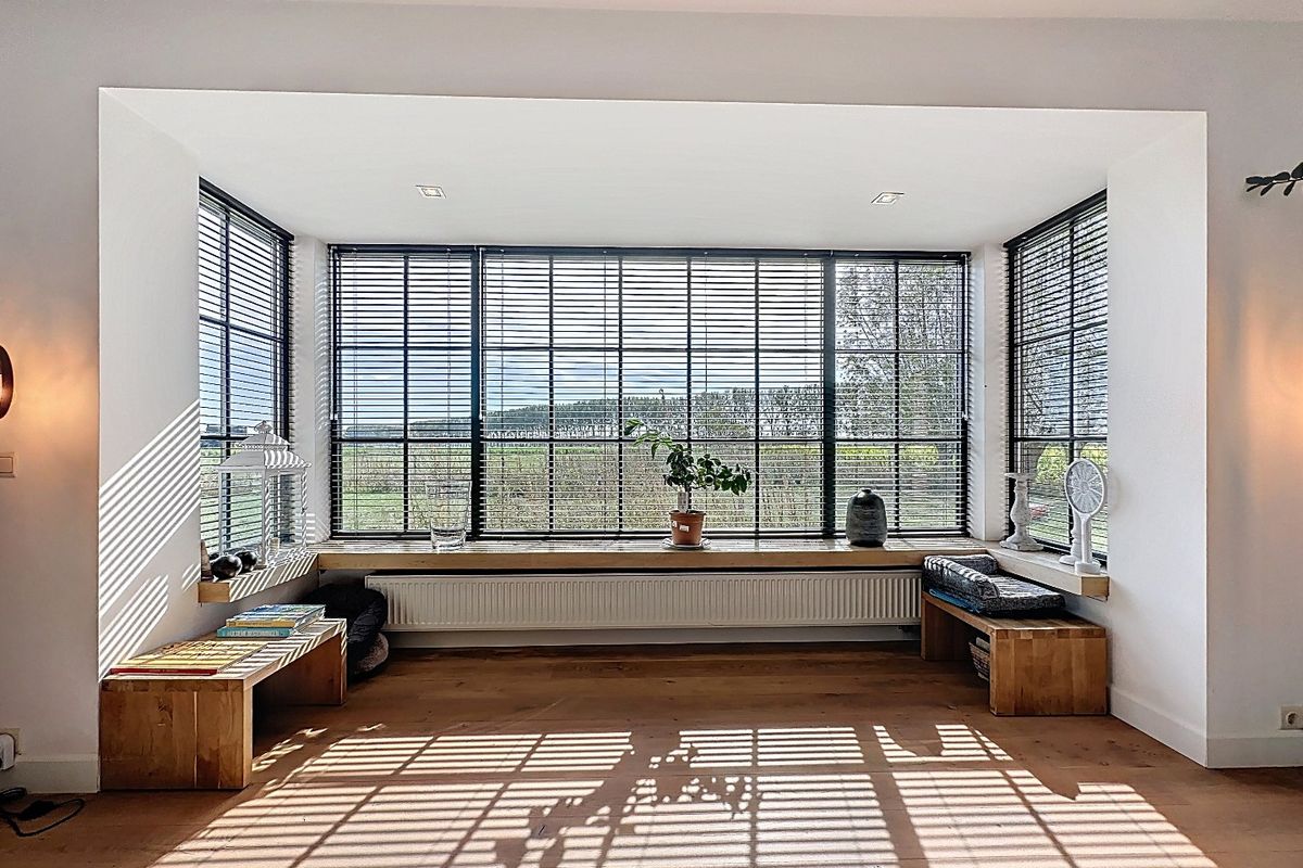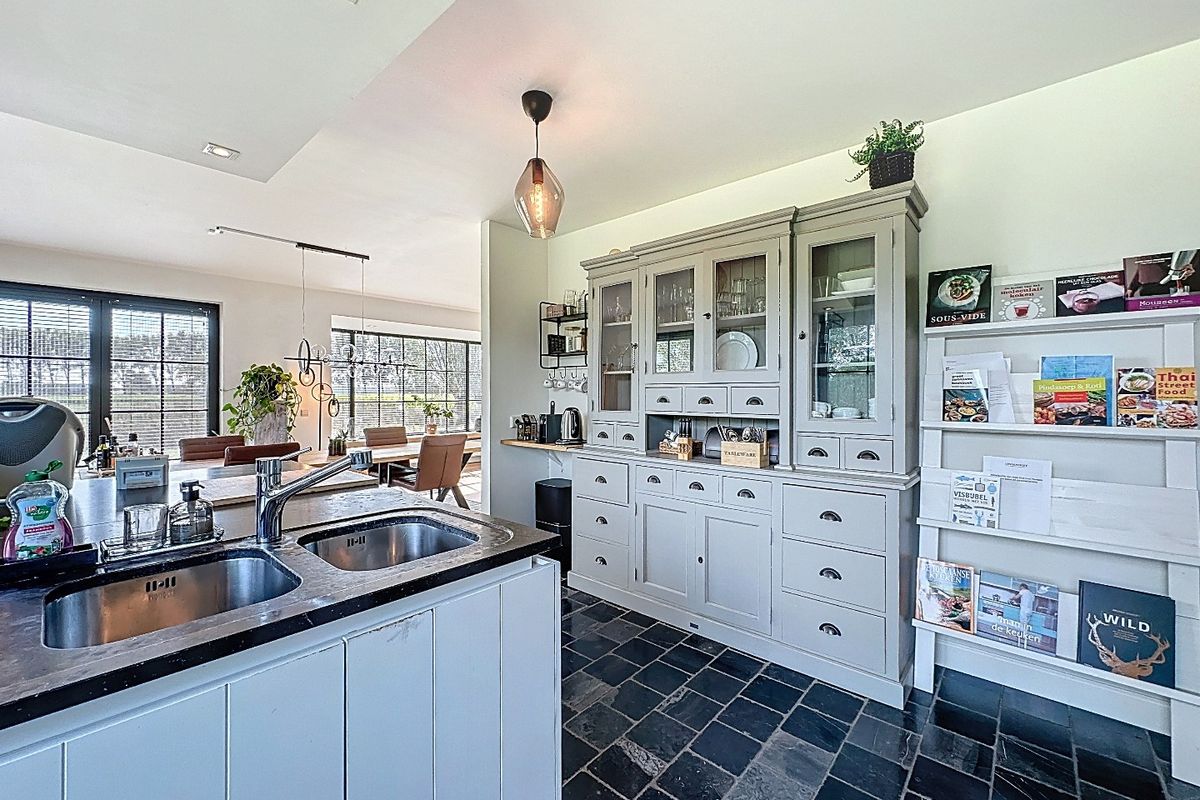 Via de hal met een prachtige natuurstenen tegelvloer kom je via een glazen deurwand in de lichtrijke en ruime U-vormige woonkamer—een echte eyecatcher met openslaande deuren naar de tuin en een grote raampartij die het schitterende landschap naar binnen haalt. De parketvloer en een sfeervolle open haard zorgen voor een warme, uitnodigende sfeer.