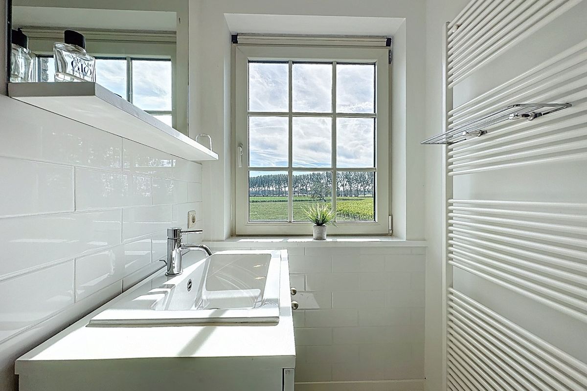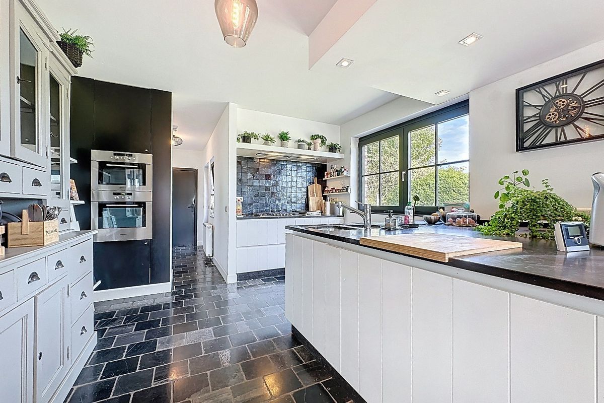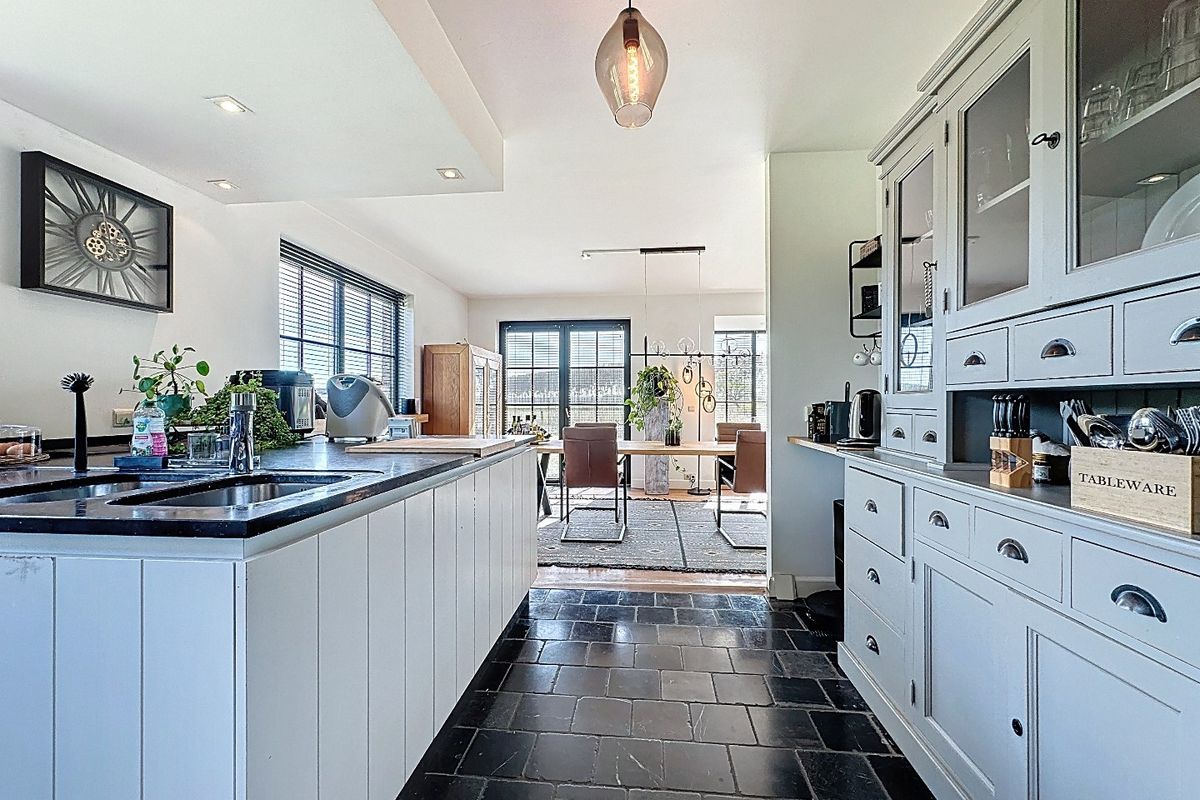 De moderne open keuken is strak gestuct en verlicht met inbouwspots. Hij is van alle gemakken voorzien, inclusief een royaal gasfornuis, geïntegreerde apparatuur en een handig spoeleiland. Aansluitend vind je een bijkeuken, met aansluiting voor het witgoed en extra kastruimte, met een aparte toegang naar de tuin. Vanuit hier bereik je ook de inpandige garage, voorzien van elektrische poort en geschikt voor één wagen en extra opslag.