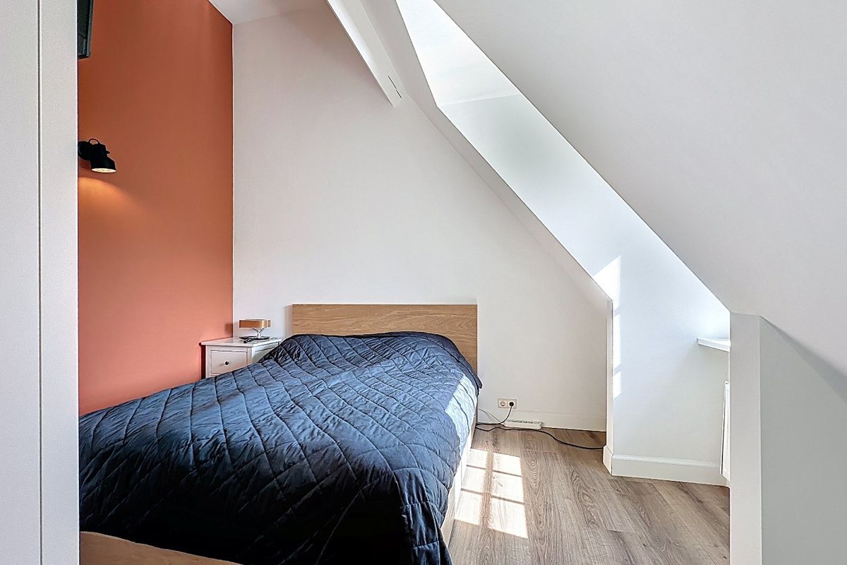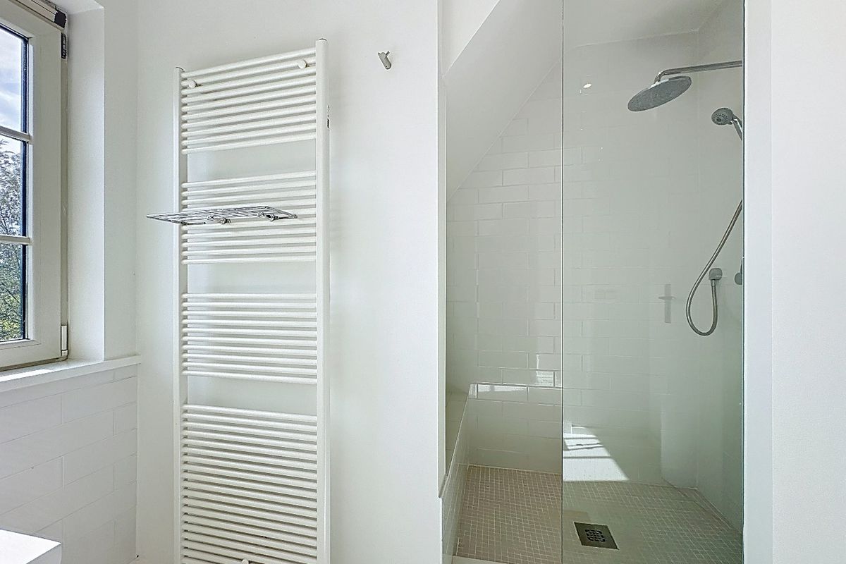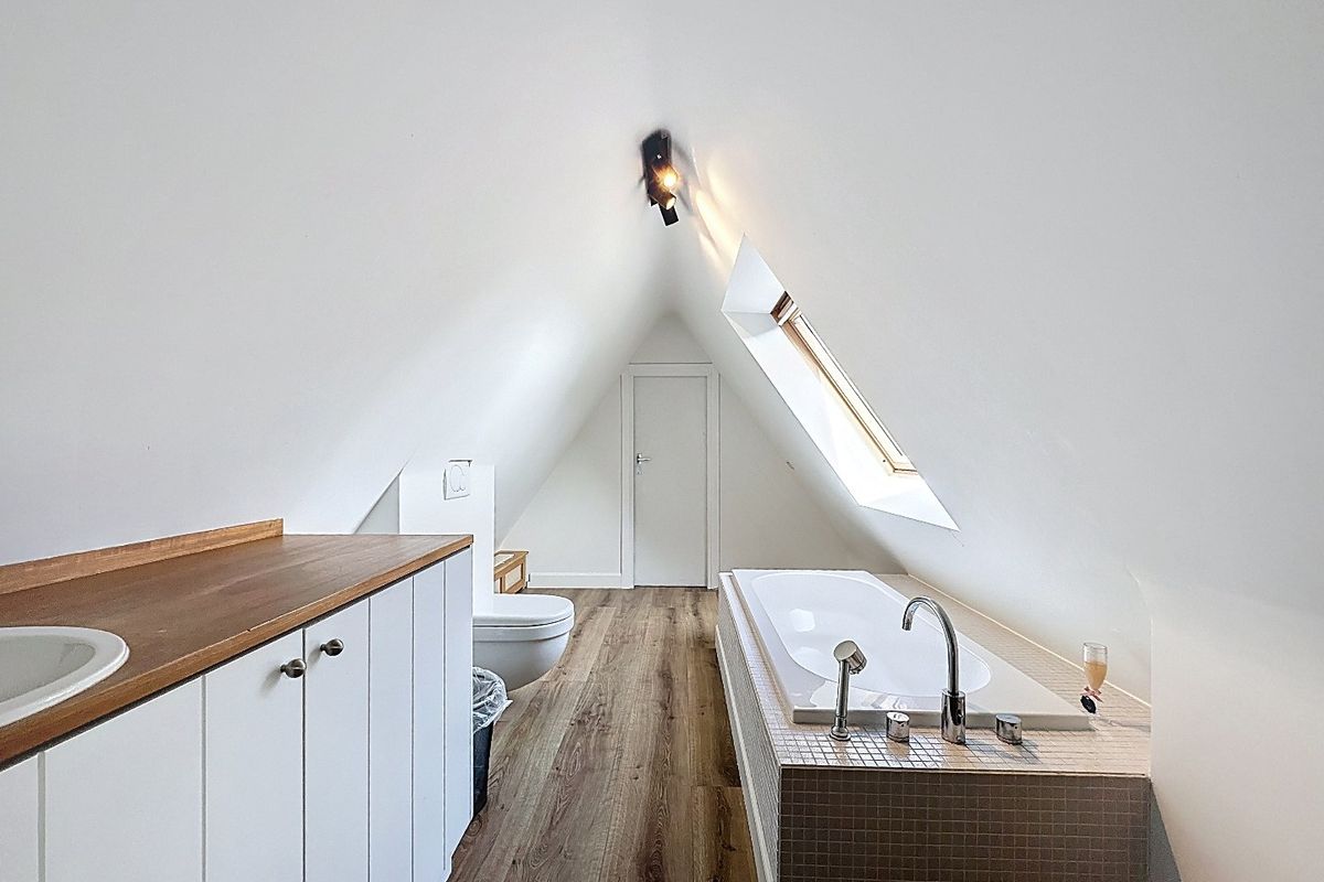Op de eerste verdieping bevinden zich drie ruime slaapkamers. De master bedroom beschikt over ingebouwde kasten en een luxe badkamer en suite met ligbad, inloopdouche, dubbele wastafel en toilet. De tweede slaapkamer heeft toegang tot een tweede badkamer met inloopdouche en wastafel; deze is eveneens via de overloop te bereiken. Een derde slaapkamer, momenteel ingericht als bureau, heeft een badkamer met ligbad, wastafel en toilet. De bovenverdieping boven de garage biedt nog een vierde slaapkamer— ideaal voor gasten of een tiener— en geeft toegang tot de derde slaapkamer. Alle slaapkamers zijn voorzien van inbouwkasten, waardoor ruimte nooit een tekort zal komen en alle vertrekken comfort ademen.
