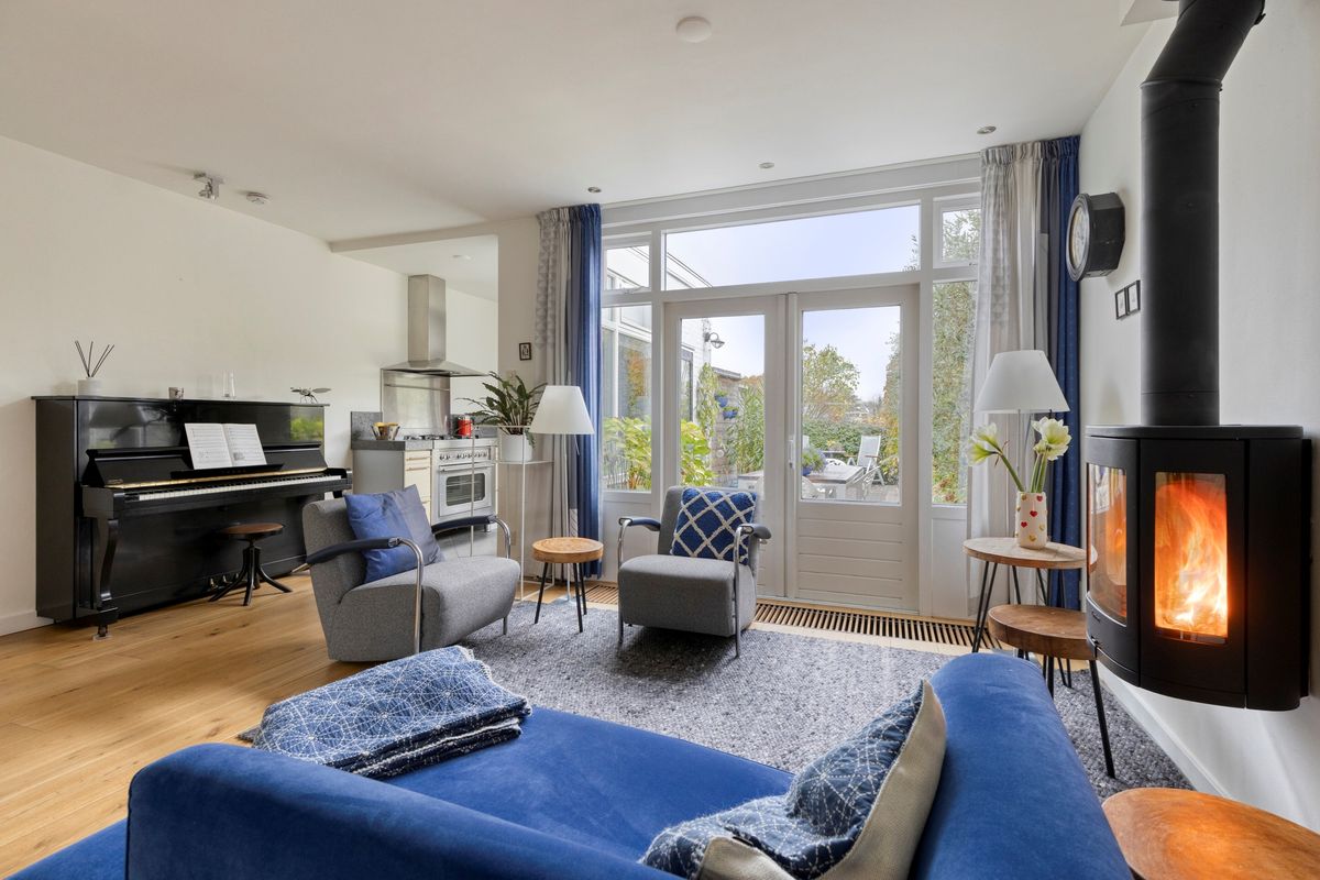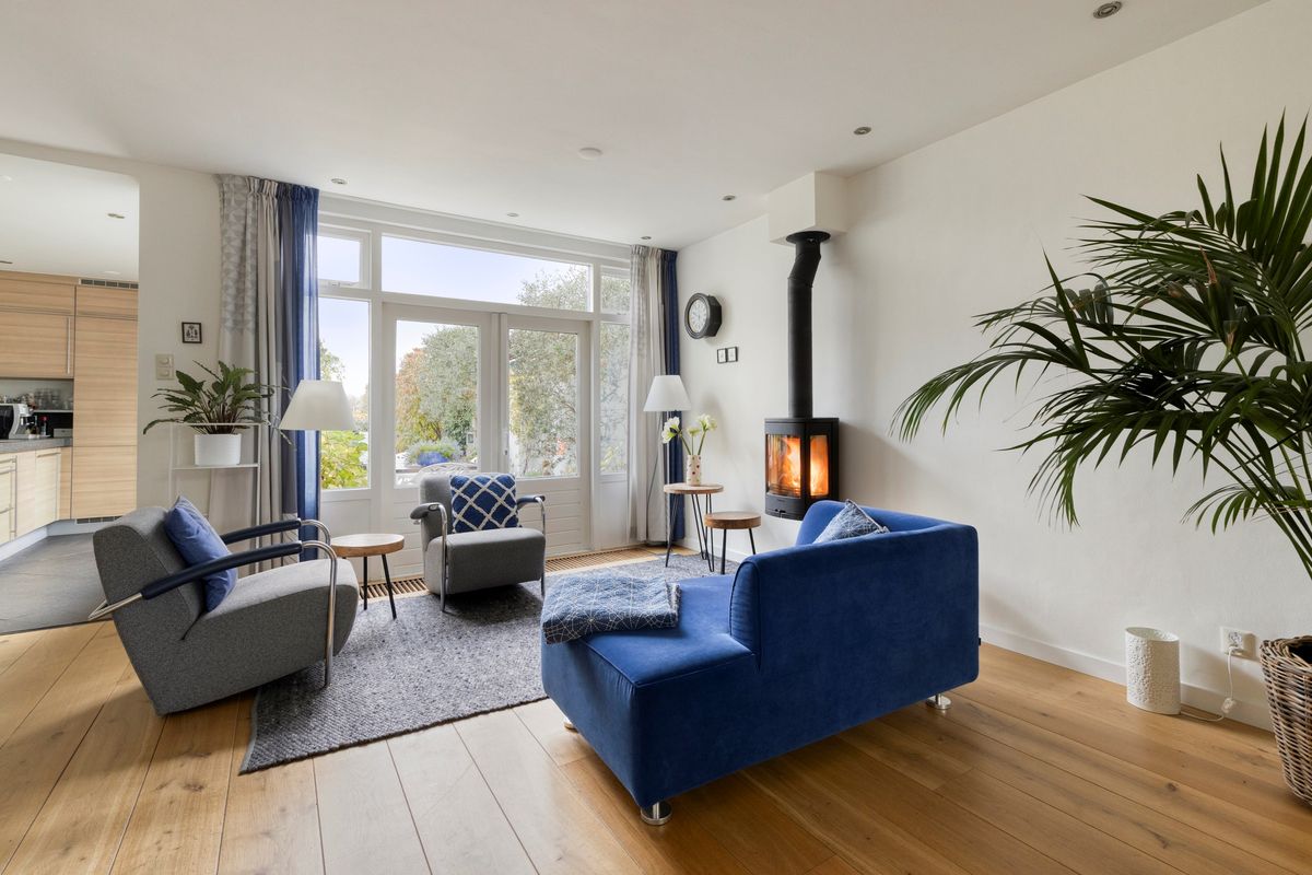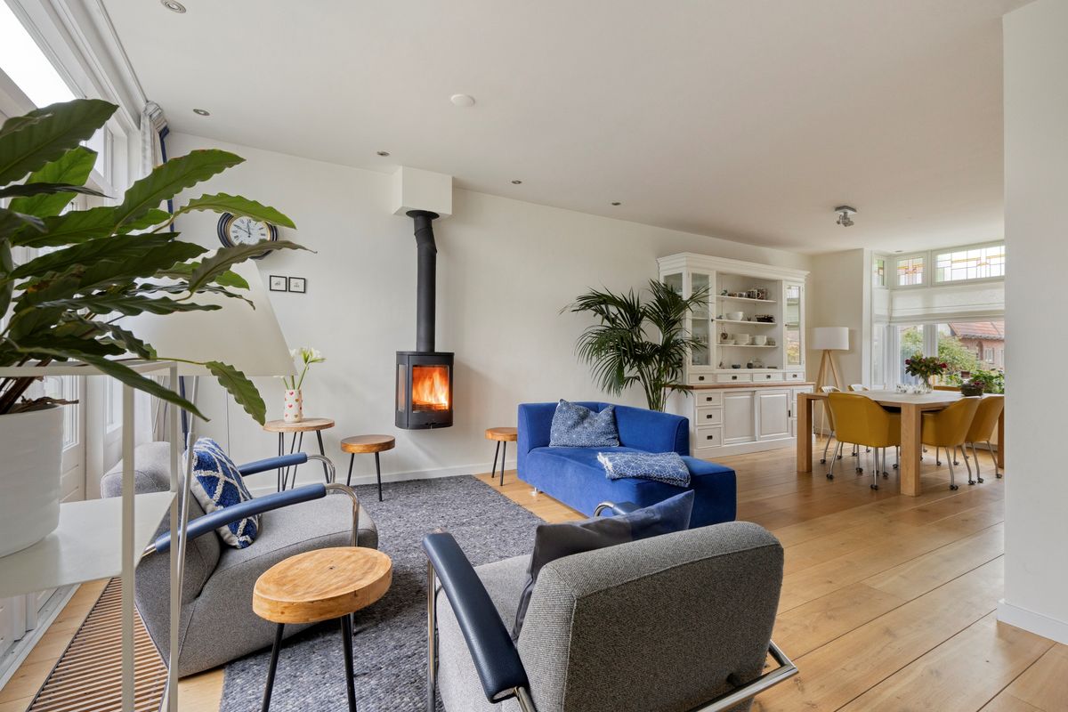 Sfeervolle woonkamer met een speelse indeling. De erker aan de voorkant geeft een mooi uitzicht over de straat en details zoals het glas-in-lood maken het plaatje compleet. Bij de houtkachel is het in de wintermaanden heerlijk vertoeven. De woonkamer staat doormiddel van de openslaande tuindeuren in verbinding met de tuin. De vaste kast zorgt voor extra opbergruimte. De kamer laat zich vrij natuurlijk inrichten met een leuke zit- en eethoek.