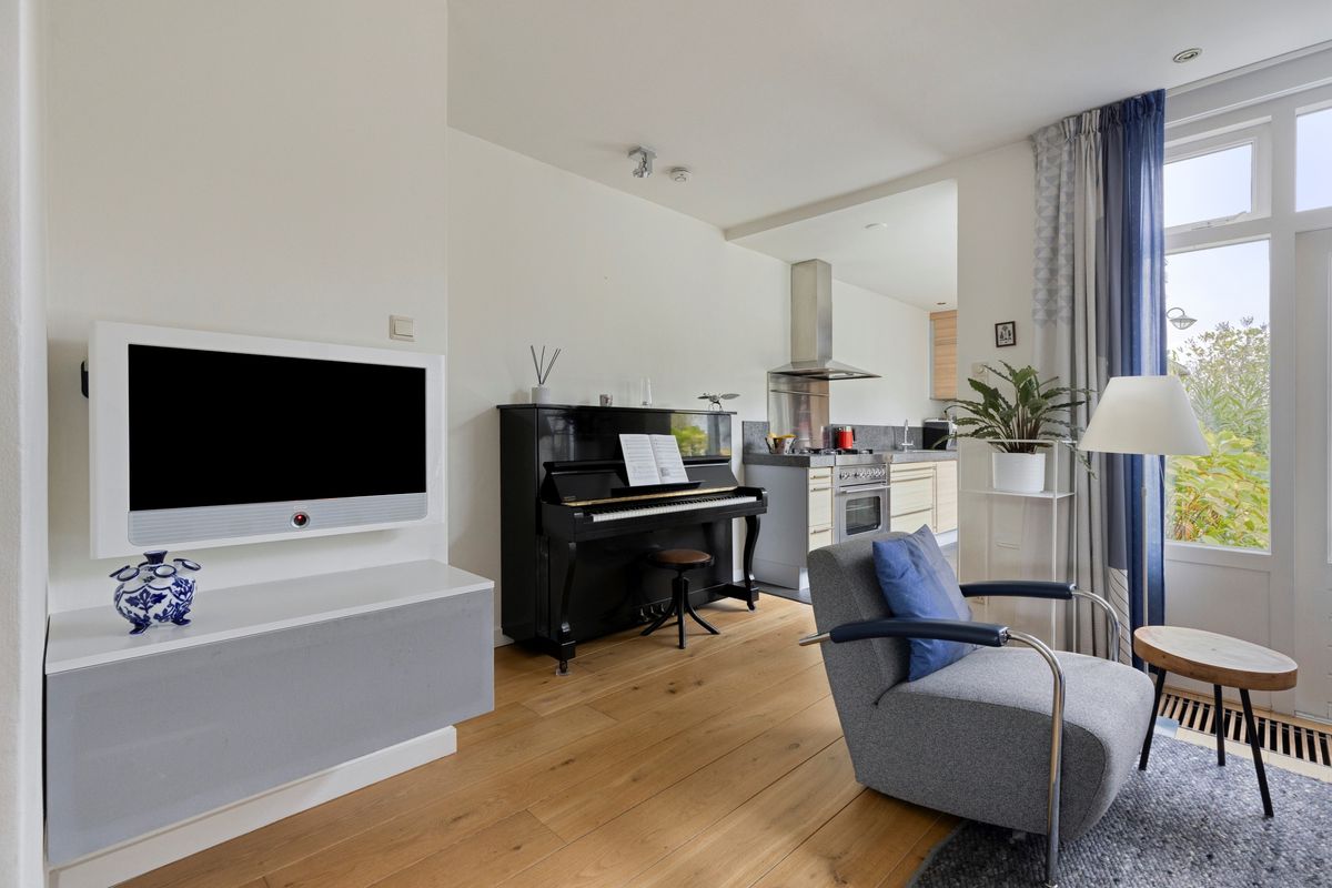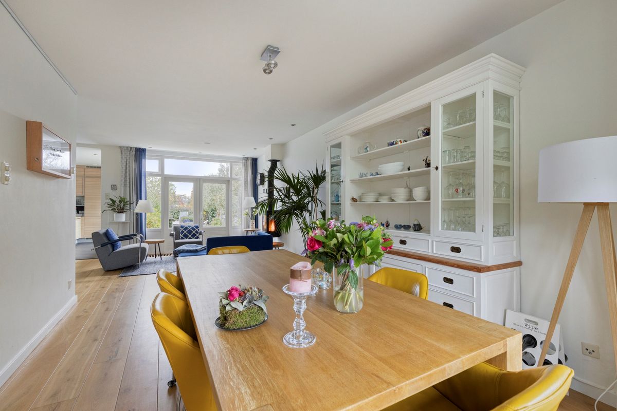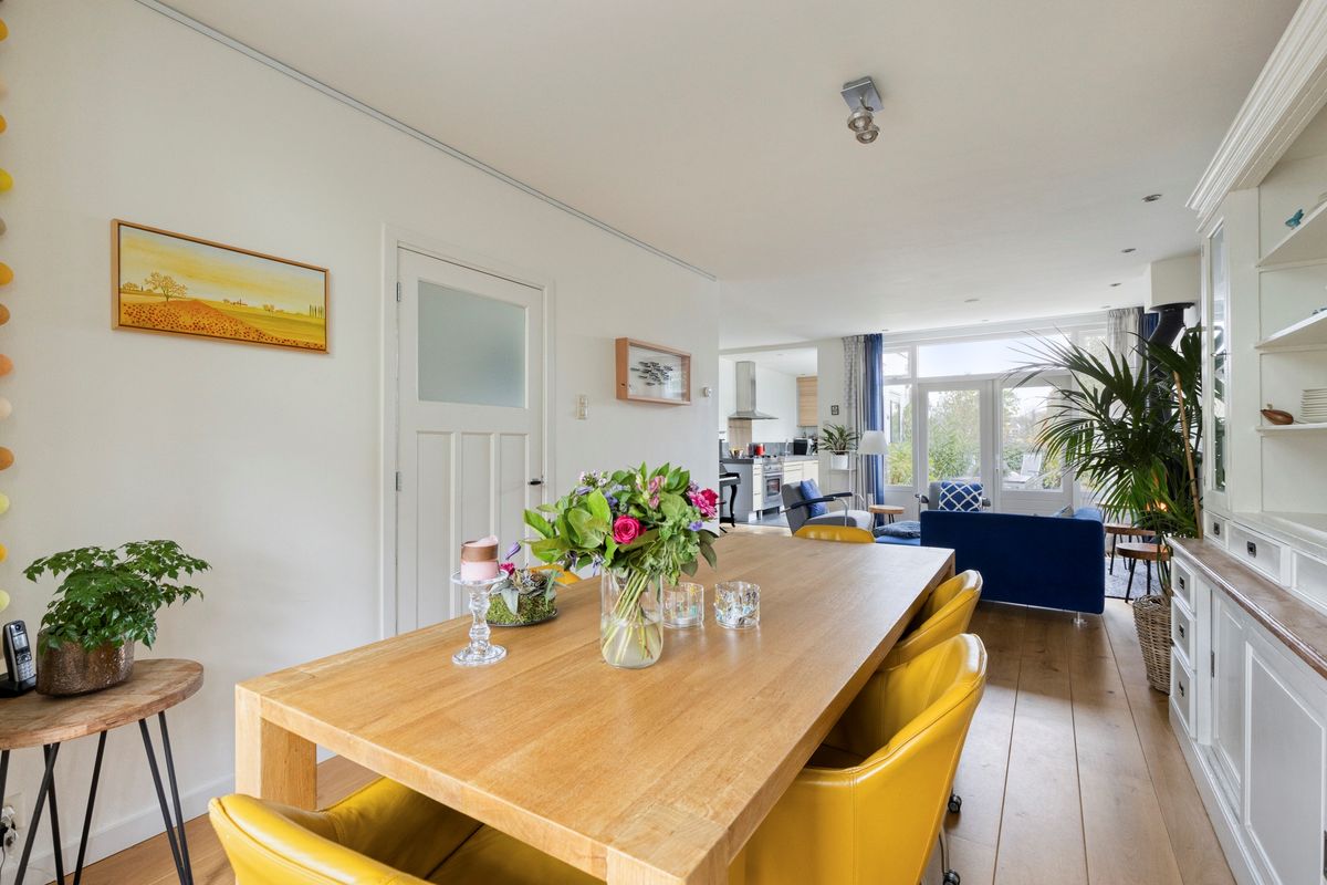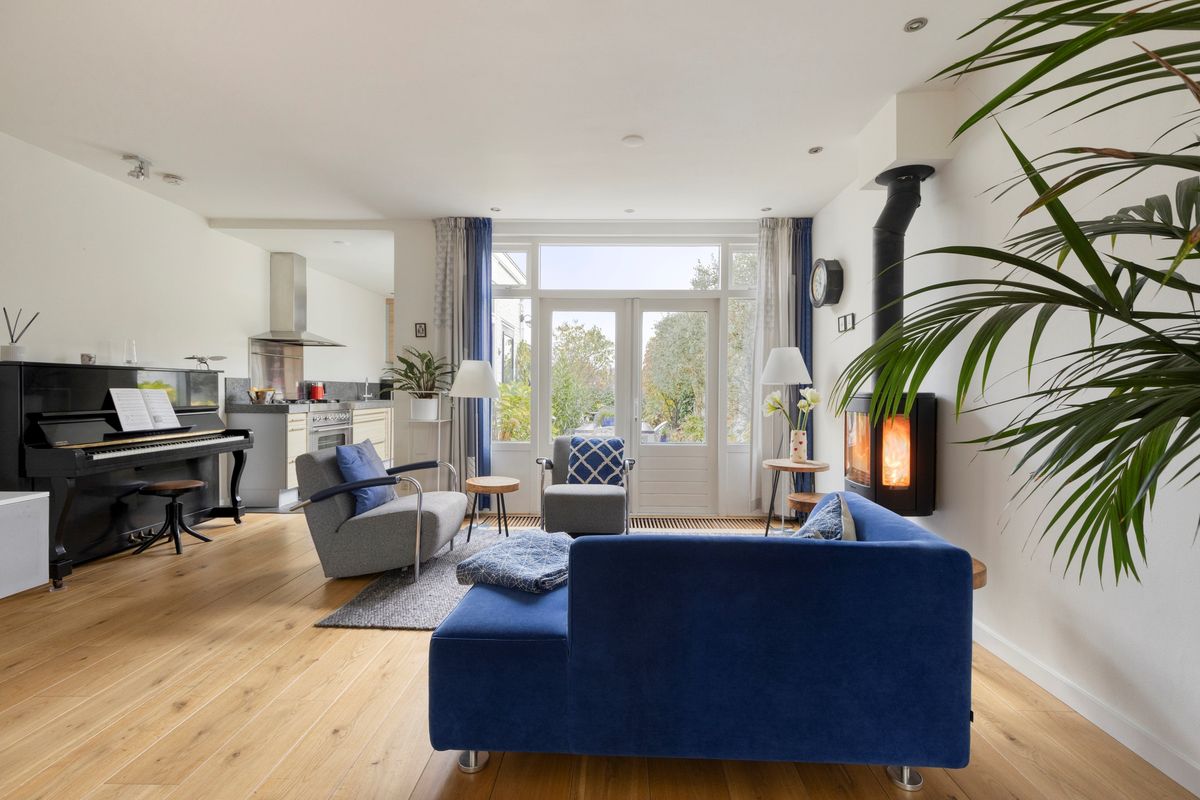 Sfeervolle woonkamer met een speelse indeling. De erker aan de voorkant geeft een mooi uitzicht over de straat en details zoals het glas-in-lood maken het plaatje compleet. Bij de houtkachel is het in de wintermaanden heerlijk vertoeven. De woonkamer staat doormiddel van de openslaande tuindeuren in verbinding met de tuin. De vaste kast zorgt voor extra opbergruimte. De kamer laat zich vrij natuurlijk inrichten met een leuke zit- en eethoek.