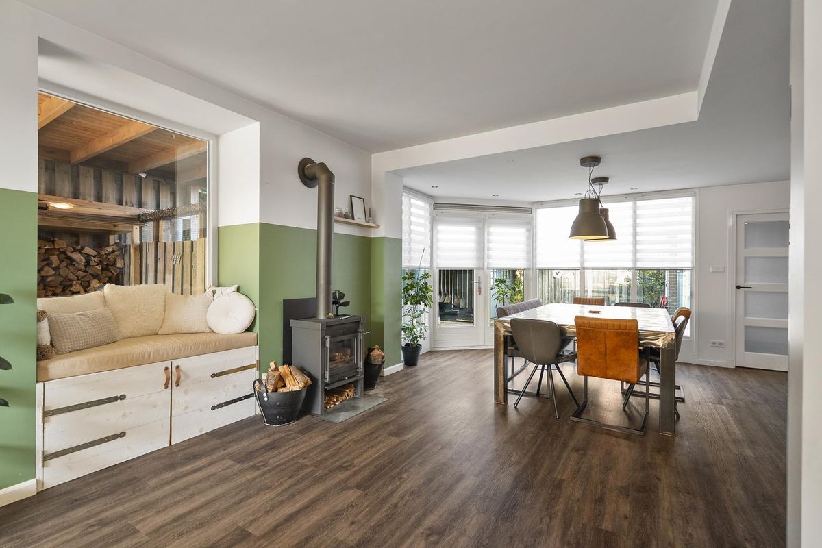 Binnen komend in de entree, vindt u een toiletruimte voorzien van een hangend closet met fontein en de meterkast. Via de woonkamer is de hal naar trap te bereiken. Ook is de woonruimte voorzien van een open hoekkeuken, openslaande deuren naar de tuin en een fraaie houthaard voor de knusse avonden. De keuken is voorzien van diverse inbouwapparatuur zoals een inductiekookplaat, combi-oven, vaatwasser, een koelkast en afzuigkap. In de keuken bevindt zich de deur naar de bijkeuken met daar een wasmachineaansluiting en doorgang naar de berging.