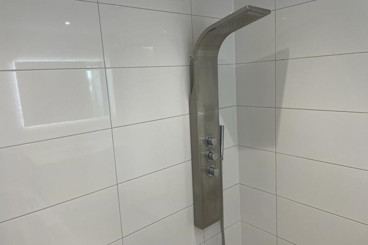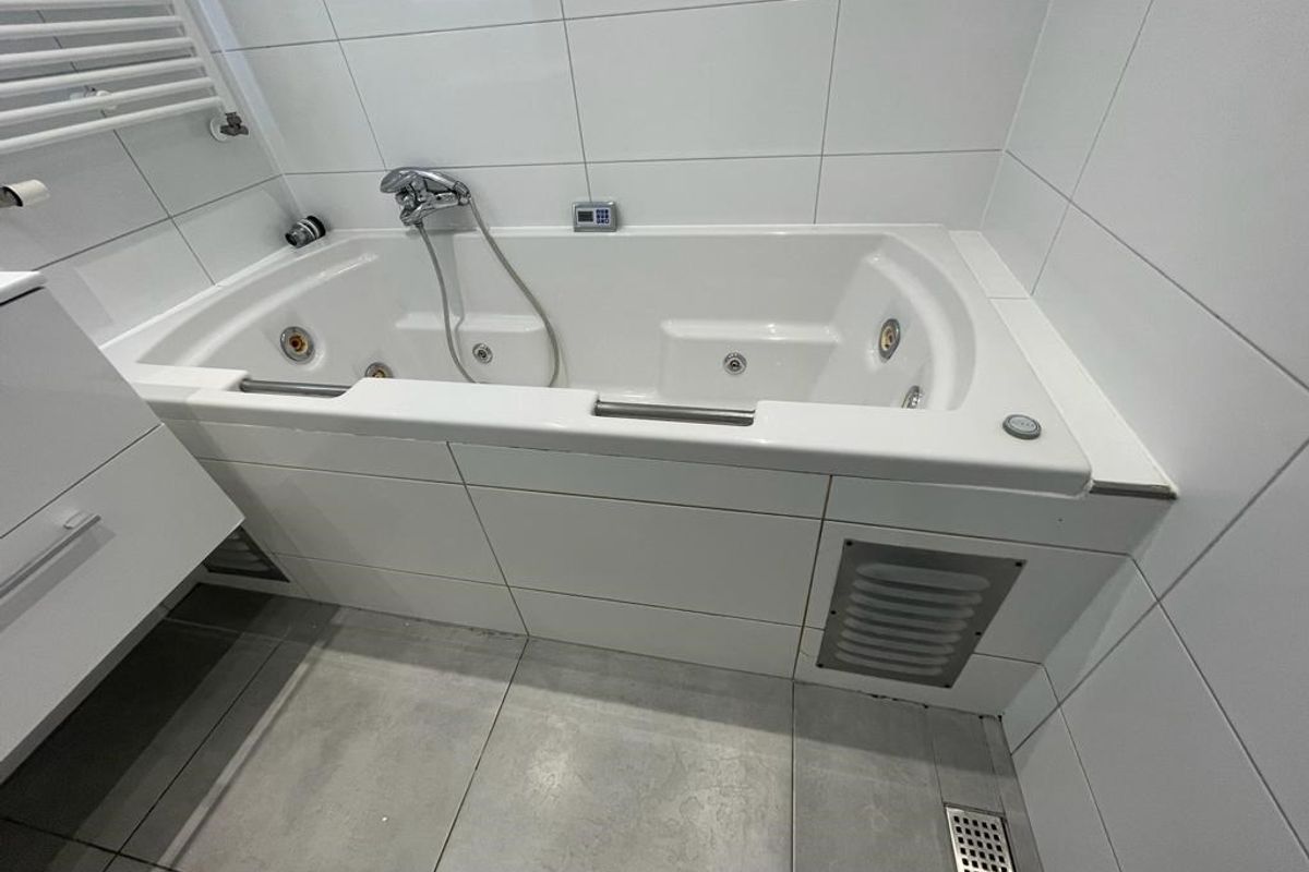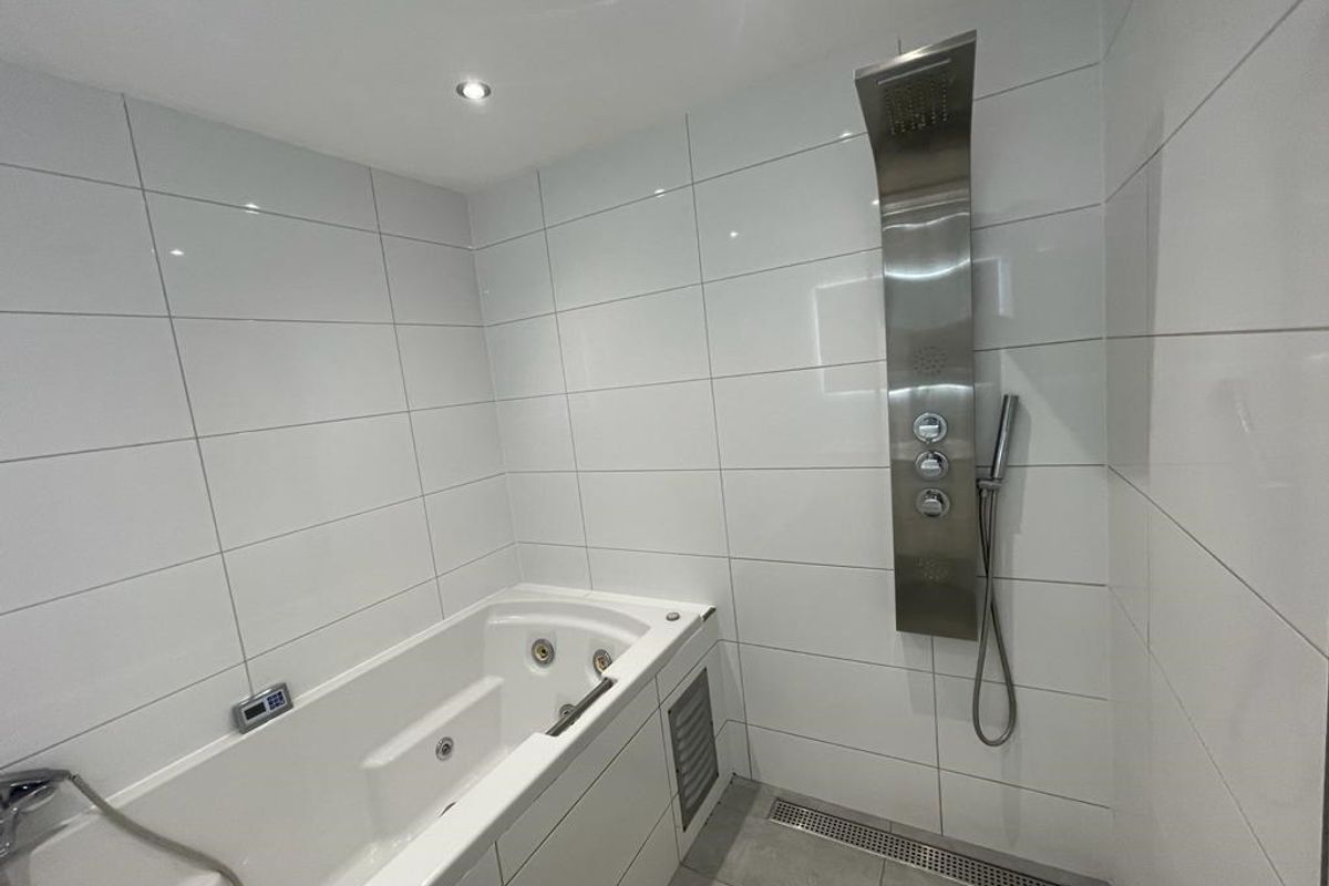 De badkamer heeft een duo-bubbel-ligbad, inloopdouche en een wastafelmeubel.